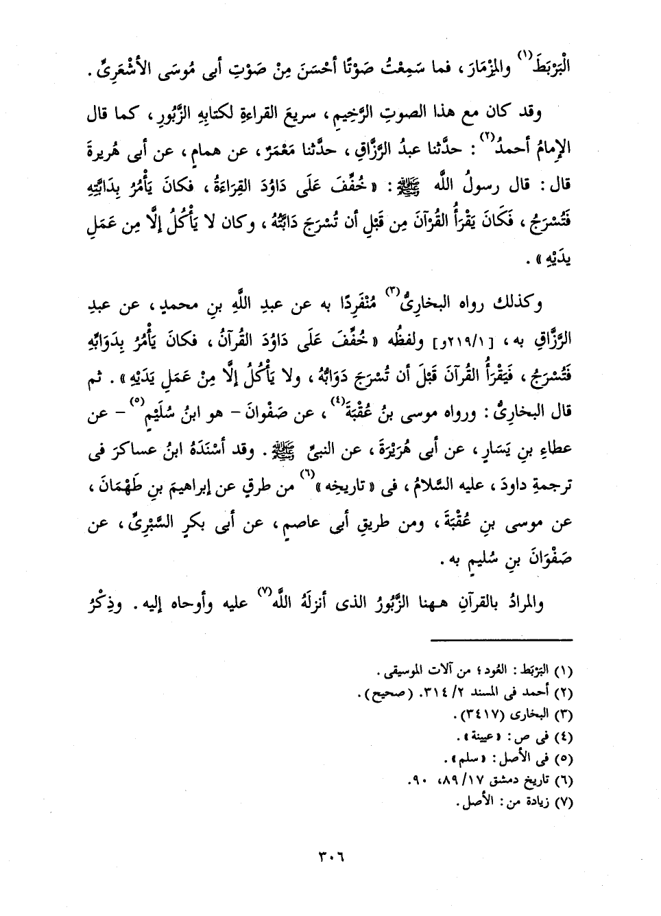 وَكَذَلِكَ رَوَاهُ الْبُخَارِيُّ مُنْفَرِدًا بِهِ عَنْ عَبْدِ اللَّهِ بْنِ مُحَمَّدٍ عَنْ عَبْدِ الرَّزَّاقِ بِهِ، وَلَفْظُهُ «خُفِّفَ عَلَى دَاوُدَ الْقُرْآنُ، فَكَانَ يَأْمُرُ بِدَوَابِّهِ فَتُسْرَجُ، فَيَقْرَأُ الْقُرْآنَ قَبْلَ أَنْ تُسْرَجَ دَوَابُّهُ، وَلَا يَأْكُلُ إِلَّا مِنْ عَمَلِ يَدَيْهِ» ثُمَّ قَالَ الْبُخَارِيُّ: وَرَوَاهُ مُوسَى بْنُ عُقْبَةَ عَنْ صَفْوَانَ - هُوَ ابْنُ سُلَيْمٍ - عَنْ عَطَاءِ بْنِ يَسَارٍ، عَنْ أَبِي هُرَيْرَةَ عَنِ النَّبِيِّ صَلَّى اللَّهُ عَلَيْهِ وَسَلَّمَ وَقَدْ أَسْنَدَهُ ابْنُ عَسَاكِرَ فِي تَرْجَمَةِ دَاوُدَ، عَلَيْهِ السَّلَامُ، فِي تَارِيخِهِ مِنْ طُرُقٍ عَنْ إِبْرَاهِيمَ بْنِ طَهْمَانَ، عَنْ مُوسَى بْنِ عُقْبَةَ، وَمِنْ طَرِيقِ أَبِي عَاصِمٍ عَنْ أَبِي بَكْرٍ السَّبْرِيِّ عَنْ صَفْوَانَ بْنِ سُلَيْمٍ بِهِ.