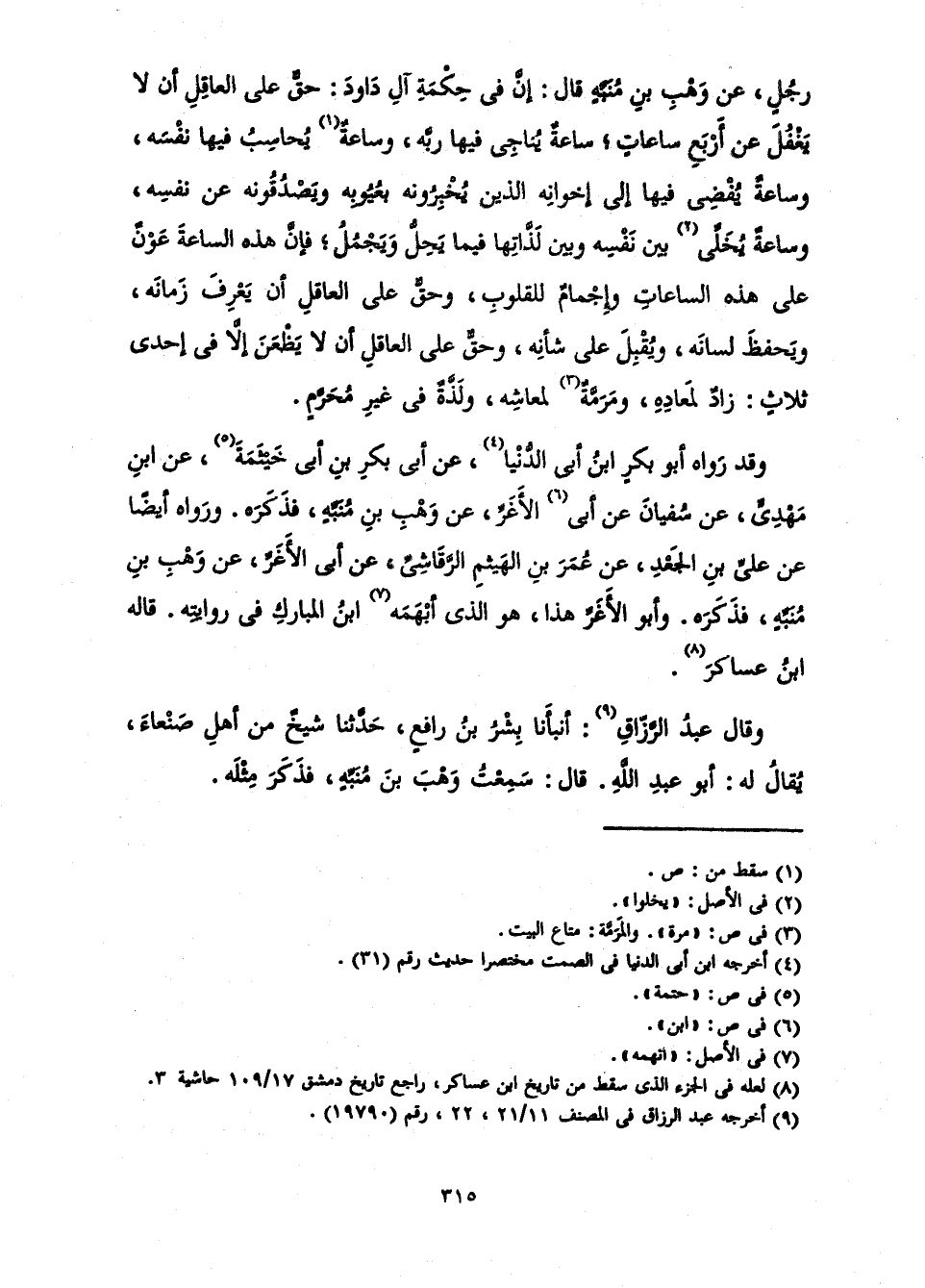 رَجُلٍ، عَنْ وَهْبِ بْنِ مُنَبِّهٍ، قَالَ: إِنَّ فِي حِكْمَةِ آلِ دَاوُدَ: حَقٌّ عَلَى الْعَاقِلِ أَنْ لَا يَغْفُلَ عَنْ أَرْبَعِ سَاعَاتٍ: سَاعَةٌ يُنَاجِي فِيهَا رَبَّهُ، وَسَاعَةٌ يُحَاسِبُ فِيهَا نَفْسَهُ، وَسَاعَةٌ يُفْضِي فِيهَا إِلَى إِخْوَانِهِ الَّذِينَ يُخْبِرُونَهُ بِعُيُوبِهِ وَيَصْدُقُونَهُ عَنْ نَفْسِهِ، وَسَاعَةٌ يُخَلِّي بَيْنَ نَفْسِهِ وَبَيْنَ لَذَّاتِهَا فِيمَا يَحِلُّ وَيَجْمُلُ; فَإِنَّ هَذِهِ السَّاعَةَ عَوْنٌ عَلَى هَذِهِ السَّاعَاتِ، وَإِجْمَامٌ لِلْقُلُوبِ، وَحَقٌّ عَلَى الْعَاقِلِ أَنْ يَعْرِفَ زَمَانَهُ، وَيَحْفَظَ لِسَانَهُ، وَيُقْبِلَ عَلَى شَأْنِهِ، وَحَقٌّ عَلَى الْعَاقِلِ أَنْ لَا يَظْعَنَ إِلَّا فِي إِحْدَى ثَلَاثٍ: زَادٌ لِمَعَادِهِ، وَمَرَمَّةٌ لِمَعَاشِهِ، وَلَذَّةٌ فِي غَيْرِ مُحَرَّمٍ.