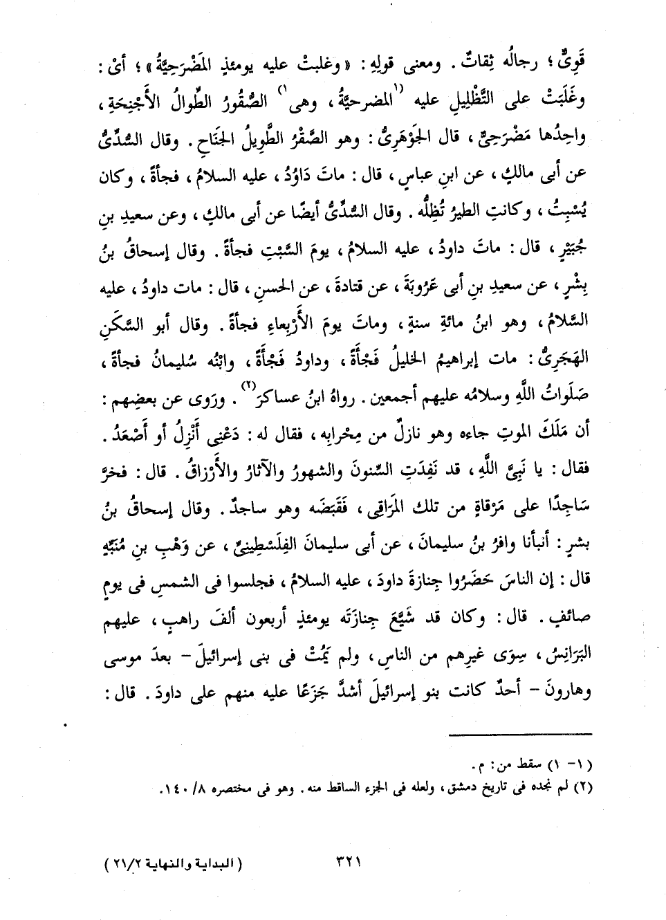 قَوِيٌّ ; رِجَالُهُ ثِقَاتٌ. وَمَعْنَى قَوْلِهِ: وَغَلَبَتْ عَلَيْهِ يَوْمَئِذٍ الْمَضْرَحِيَّةُ ; أَيْ: وَغَلَبَتْ عَلَى التَّظْلِيلِ عَلَيْهِ الْمَضْرَحِيَّةُ، وَهِيَ الصُّقُورُ الطِّوَالُ الْأَجْنِحَةِ، وَاحِدُهَا مَضْرَحِيٌّ، قَالَ الْجَوْهَرِيُّ: وَهُوَ الصَّقْرُ الطَّوِيلُ الْجَنَاحِ. وَقَالَ السُّدِّيُّ عَنْ أَبِي مَالِكٍ عَنِ ابْنِ عَبَّاسٍ قَالَ: مَاتَ دَاوُدُ، عَلَيْهِ السَّلَامُ، فَجْأَةً، وَكَانَ يَسْبِتُ، وَكَانَتِ الطَّيْرُ تُظِلُّهُ. وَقَالَ السُّدِّيُّ أَيْضًا عَنْ أَبِي مَالِكٍ، وَعَنْ سَعِيدِ بْنِ جُبَيْرٍ، قَالَ: مَاتَ دَاوُدُ، عَلَيْهِ السَّلَامُ، يَوْمَ السَّبْتِ فَجْأَةً. وَقَالَ إِسْحَاقُ بْنُ بِشْرٍ، عَنْ سَعِيدِ بْنِ أَبِي عَرُوبَةَ، عَنْ قَتَادَةَ، عَنِ الْحَسَنِ، قَالَ: مَاتَ دَاوُدُ عَلَيْهِ السَّلَامُ، وَهُوَ ابْنُ مِائَةِ سَنَةٍ، وَمَاتَ يَوْمَ الْأَرْبِعَاءِ فَجْأَةً. وَقَالَ أَبُو السَّكَنِ الْهَجَرِيُّ: مَاتَ إِبْرَاهِيمُ الْخَلِيلُ، فَجْأَةً وَدَاوُدُ فَجْأَةً، وَابْنُهُ سُلَيْمَانُ فَجْأَةً، صَلَوَاتُ اللَّهِ وَسَلَامُهُ عَلَيْهِمْ أَجْمَعِينَ. رَوَاهُ ابْنُ عَسَاكِرَ. وَرَوَى عَنْ بَعْضِهِمْ: أَنَّ مَلَكَ الْمَوْتِ جَاءَهُ وَهُوَ نَازِلٌ مِنْ مِحْرَابِهِ، فَقَالَ لَهُ: دَعْنِي أَنْزِلُ أَوْ أَصْعَدُ. فَقَالَ: يَا نَبِيَّ اللَّهِ قَدْ نَفِذَتِ السُّنُونُ وَالشُّهُورُ وَالْآثَارُ وَالْأَرْزَاقُ. قَالَ: فَخَرَّ سَاجِدًا عَلَى مَرْقَاةٍ مِنْ تِلْكَ الْمَرَاقِي، فَقَبَضَهُ وَهُوَ سَاجِدٌ. وَقَالَ إِسْحَاقُ بْنُ بِشْرٍ: أَنْبَأَنَا وَافِرُ بْنُ سُلَيْمَانَ، عَنْ أَبِي سُلَيْمَانَ الْفِلَسْطِينِيِّ، عَنْ وَهْبِ بْنِ مُنَبِّهٍ، قَالَ: إِنِ النَّاسَ حَضَرُوا جِنَازَةَ دَاوُدَ، عَلَيْهِ السَّلَامُ، فَجَلَسُوا فِي الشَّمْسِ فِي يَوْمٍ صَائِفٍ. قَالَ: وَكَانَ قَدْ شَيَّعَ جِنَازَتَهُ يَوْمَئِذٍ أَرْبَعُونَ أَلْفَ رَاهِبٍ، عَلَيْهِمُ الْبَرَانِسُ، سِوَى غَيْرِهِمْ مِنَ النَّاسِ، وَلَمْ يَمُتْ فِي بَنِي إِسْرَائِيلَ - بَعْدَ مُوسَى وَهَارُونَ - أَحَدٌ كَانَتْ بَنُو إِسْرَائِيلَ أَشَدَّ جَزَعًا عَلَيْهِ مِنْهُمْ عَلَى دَاوُدَ. قَالَ: