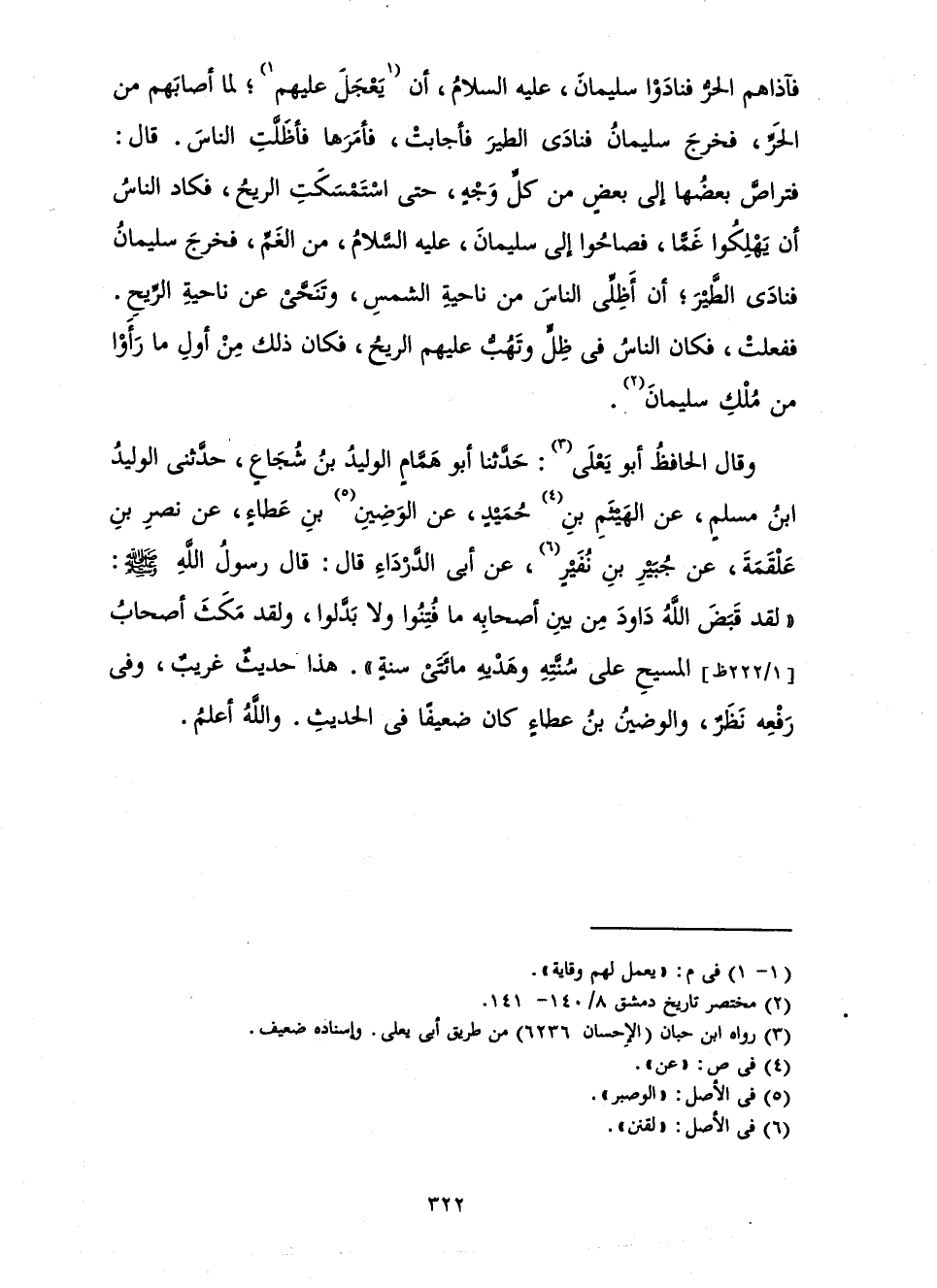 وَقَالَ الْحَافِظُ أَبُو يَعْلَى: حَدَّثَنَا أَبُو هَمَّامٍ الْوَلِيدُ بْنُ شُجَاعٍ، حَدَّثَنِي الْوَلِيدُ بْنُ مُسْلِمٍ، عَنِ الْهَيْثَمِ بْنِ حُمَيْدٍ، عَنِ الْوَضِينِ بْنِ عَطَاءٍ، عَنْ نَصْرِ بْنِ عَلْقَمَةَ، عَنْ جُبَيْرِ بْنِ نُفَيْرٍ، عَنْ أَبِي الدَّرْدَاءِ قَالَ: قَالَ رَسُولُ اللَّهِ صَلَّى اللَّهُ عَلَيْهِ وَسَلَّمَ: «لَقَدْ قَبَضَ اللَّهُ دَاوُدَ مِنْ بَيْنِ أَصْحَابِهِ مَا فُتِنُوا وَلَا بَدَّلُوا وَلَقَدْ مَكَثَ أَصْحَابُ الْمَسِيحِ عَلَى سُنَّتِهِ وَهَدْيِهِ مِائَتَيْ سَنَةٍ» هَذَا حَدِيثٌ غَرِيبٌ، وَفِي رَفْعِهِ نَظَرٌ، وَالْوَضِينُ بْنُ عَطَاءٍ كَانَ ضَعِيفًا فِي الْحَدِيثِ. وَاللَّهُ أَعْلَمُ.