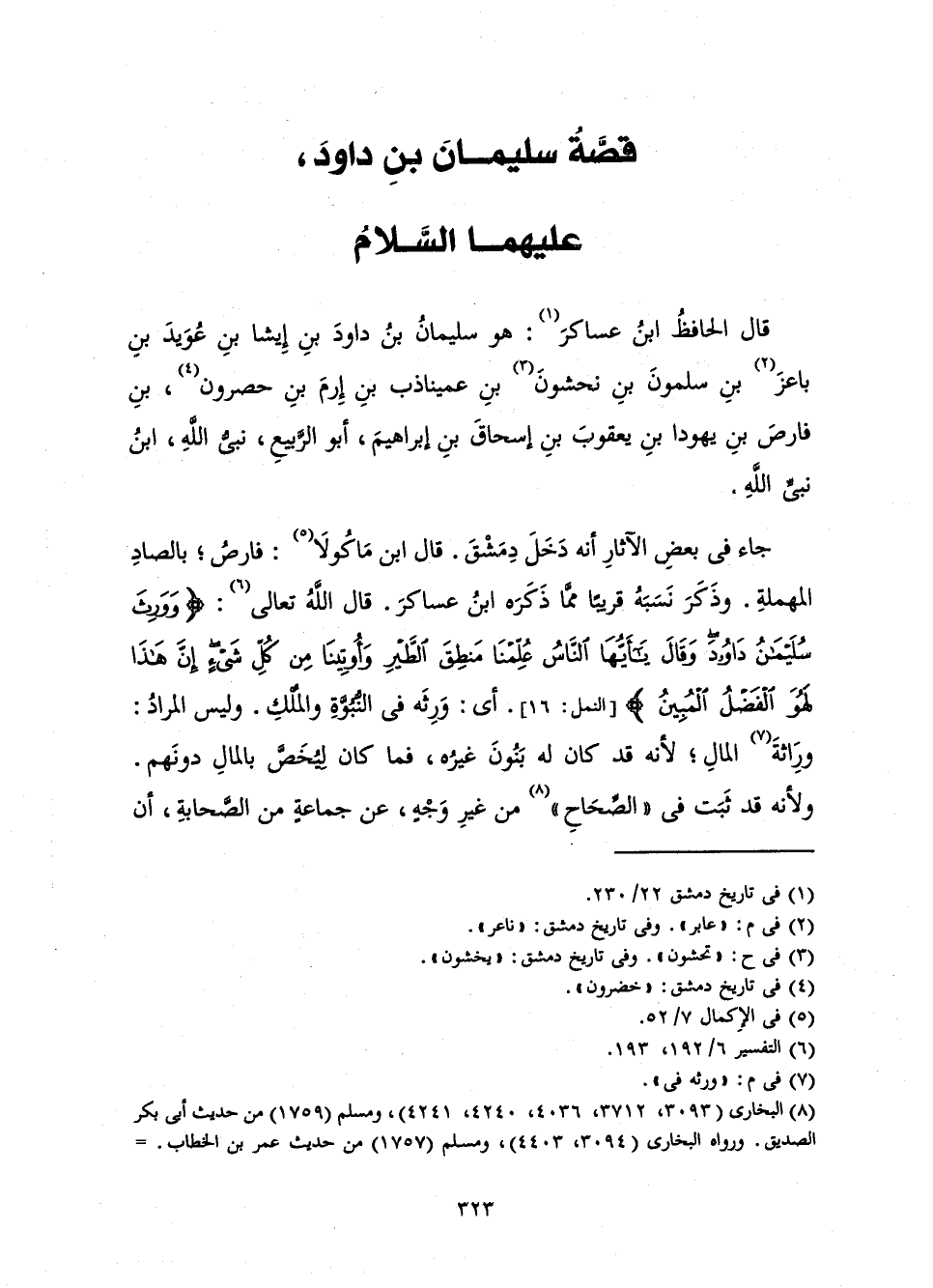 جَاءَ فِي بَعْضِ الْآثَارِ أَنَّهُ دَخَلَ دِمَشْقَ. قَالَ ابْنُ مَاكُولَا: فَارْصُ بِالصَّادِّ الْمُهْمَلَةِ. وَذَكَرَ نَسَبَهُ قَرِيبًا مِمَّا ذَكَرَهُ ابْنُ عَسَاكِرَ. قَالَ اللَّهُ تَعَالَى: {وَوَرِثَ سُلَيْمَانُ دَاوُدَ وَقَالَ يَا أَيُّهَا النَّاسُ عُلِّمْنَا مَنْطِقَ الطَّيْرِ وَأُوتِينَا مِنْ كُلِّ شَيْءٍ إِنَّ هَذَا لَهُوَ الْفَضْلُ الْمُبِينُ} [النمل: 16] . أَيْ: وَرِثَهُ فِي النُّبُوَّةِ وَالْمُلْكِ. وَلَيْسَ الْمُرَادُ وِرَاثَةَ الْمَالِ ; لِأَنَّهُ قَدْ كَانَ لَهُ بَنُونَ غَيْرُهُ، فَمَا كَانَ لِيُخَصَّ بِالْمَالِ دُونَهُمْ. وَلِأَنَّهُ قَدْ ثَبَتَ فِي " الصِّحَاحِ " مِنْ غَيْرِ وَجْهٍ، عَنْ جَمَاعَةٍ مِنَ الصَّحَابَةِ، أَنَّ