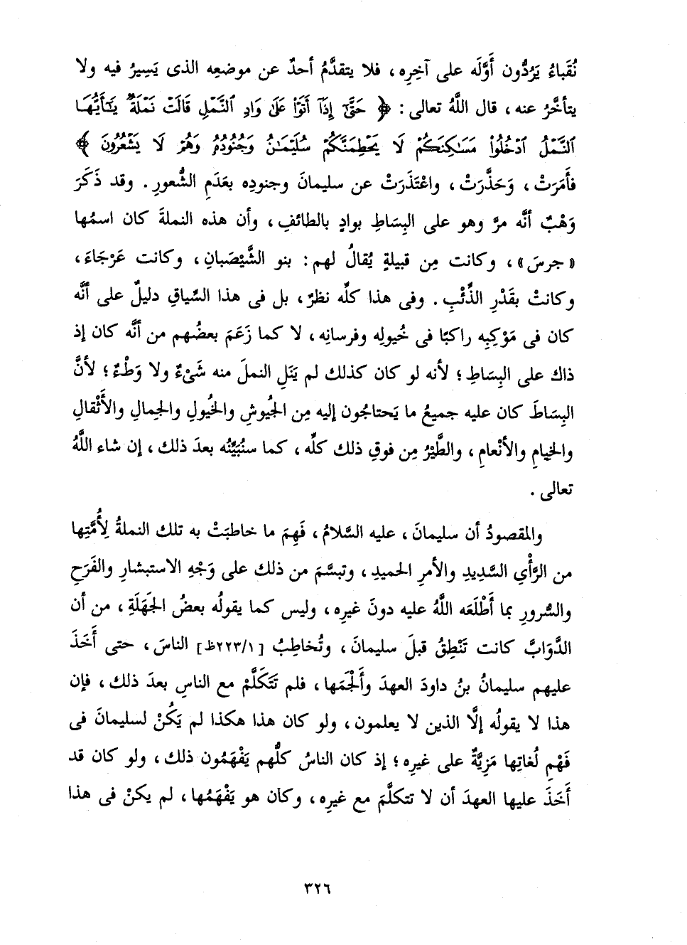 نُقَبَاءُ يَرُدُّونَ أَوَّلَهُ عَلَى آخِرِهِ، فَلَا يَتَقَدَّمُ أَحَدٌ عَنْ مَوْضِعِهِ الَّذِي يَسِيرُ فِيهِ وَلَا يَتَأَخَّرُ عَنْهُ، قَالَ اللَّهُ تَعَالَى: {حَتَّى إِذَا أَتَوْا عَلَى وَادِي النَّمْلِ قَالَتْ نَمْلَةٌ يَا أَيُّهَا النَّمْلُ ادْخُلُوا مَسَاكِنَكُمْ لَا يَحْطِمَنَّكُمْ سُلَيْمَانُ وَجُنُودُهُ وَهُمْ لَا يَشْعُرُونَ} [النمل: 18] فَأَمَرَتْ، وَحَذَّرَتْ، وَاعْتَذَرَتْ عَنْ سُلَيْمَانَ وَجُنُودِهِ بِعَدَمِ الشُّعُورِ. وَقَدْ ذَكَرَ وَهْبٌ أَنَّهُ مَرَّ وَهُوَ عَلَى الْبِسَاطِ بِوَادٍ بِالطَّائِفِ، وَأَنَّ هَذِهِ النَّمْلَةَ كَانَ اسْمُهَا " جَرْسَ " وَكَانَتْ مِنْ قَبِيلَةٍ يُقَالُ لَهُمْ: بَنُو الشَّيْصَبَانِ، وَكَانَتْ عَرْجَاءَ، وَكَانَتْ بِقَدْرِ الذِّئْبِ. وَفِي هَذَا كُلِّهِ نَظَرٌ، بَلْ فِي هَذَا السِّيَاقِ دَلِيلٌ عَلَى أَنَّهُ كَانَ فِي مَوْكِبِهِ رَاكِبًا فِي خُيُولِهِ وَفُرْسَانِهِ، لَا كَمَا زَعَمَ بَعْضُهُمْ مِنْ أَنَّهُ كَانَ إِذْ ذَاكَ عَلَى الْبِسَاطِ ; لِأَنَّهُ لَوْ كَانَ كَذَلِكَ لَمْ يَنَلِ النَّمْلَ مِنْهُ شَيْءٌ وَلَا وَطْءٌ ; لَأَنَّ الْبِسَاطَ كَانَ عَلَيْهِ جَمِيعُ مَا يَحْتَاجُونَ إِلَيْهِ مِنَ الْجُيُوشِ وَالْخُيُولِ وَالْجِمَالِ وَالْأَثْقَالِ وَالْخِيَامِ وَالْأَنْعَامِ، وَالطَّيْرُ مِنْ فَوْقِ ذَلِكَ كُلِّهِ، كَمَا سَنُبَيِّنُهُ بَعْدَ ذَلِكَ، إِنْ شَاءَ اللَّهُ تَعَالَى.