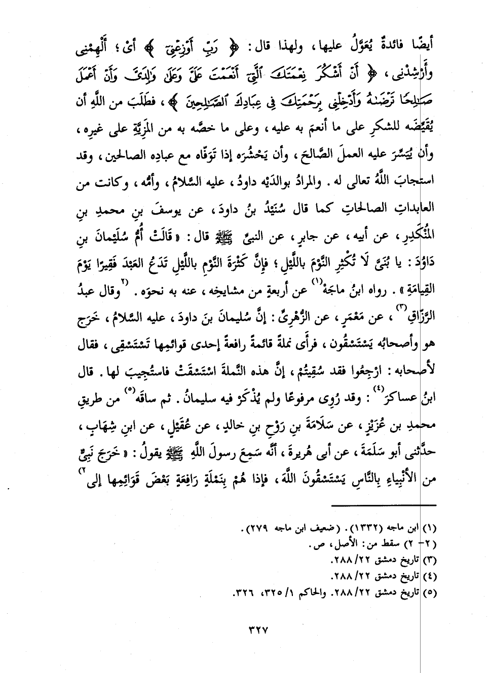 فَائِدَةٌ يُعَوَّلُ عَلَيْهَا، وَلِهَذَا قَالَ: {رَبِّ أَوْزِعْنِي} [النمل: 19] أَيْ: أَلْهِمْنِي وَأَرْشِدْنِي {أَنْ أَشْكُرَ نِعْمَتَكَ الَّتِي أَنْعَمْتَ عَلَيَّ وَعَلَى وَالِدَيَّ وَأَنْ أَعْمَلَ صَالِحًا تَرْضَاهُ وَأَدْخِلْنِي بِرَحْمَتِكَ فِي عِبَادِكَ الصَّالِحِينَ} [النمل: 19] فَطَلَبَ مِنَ اللَّهِ أَنْ يُقَيِّضَهُ لِلشُّكْرِ عَلَى مَا أَنْعَمَ بِهِ عَلَيْهِ، وَعَلَى مَا خَصَّهُ بِهِ مِنَ الْمَزِيَّةِ عَلَى غَيْرِهِ، وَأَنْ يُيَسِّرَ عَلَيْهِ الْعَمَلَ الصَّالِحَ، وَأَنْ يَحْشُرَهُ إِذَا تَوَفَّاهُ مَعَ عِبَادِهِ الصَّالِحِينَ، وَقَدِ اسْتَجَابَ اللَّهُ تَعَالَى لَهُ. وَالْمُرَادُ بِوَالِدَيْهِ دَاوُدُ، عَلَيْهِ السَّلَامُ، وَأُمُّهُ، وَكَانَتْ مِنَ الْعَابِدَاتِ الصَّالِحَاتِ كَمَا قَالَ سُنَيْدُ بْنُ دَاوُدَ، عَنْ يُوسُفَ بْنِ مُحَمَّدِ بْنِ الْمُنْكَدِرِ، عَنْ أَبِيهِ، عَنْ جَابِرٍ، عَنِ النَّبِيِّ صَلَّى اللَّهُ عَلَيْهِ وَسَلَّمَ قَالَ: «قَالَتْ أَمُّ سُلَيْمَانَ بْنِ دَاوُدَ: يَا بُنَيَّ لَا تُكْثِرِ النَّوْمَ بِاللَّيْلِ ; فَإِنَّ كَثْرَةَ النَّوْمِ بِاللَّيْلِ تَدَعُ الْعَبْدَ فَقِيرًا يَوْمَ الْقِيَامَةِ» رَوَاهُ ابْنُ مَاجَهْ عَنْ أَرْبَعَةٍ مِنْ مَشَايِخِهِ، عَنْهُ بِهِ نَحْوَهُ. وَقَالَ عَبْدُ الرَّزَّاقِ، عَنْ مَعْمَرٍ، عَنِ الزُّهْرِيِّ: إِنَّ سُلَيْمَانَ بْنَ دَاوُدَ، عَلَيْهِ السَّلَامُ، خَرَجَ هُوَ وَأَصْحَابُهُ يَسْتَسْقُونَ، فَرَأَى نَمْلَةً قَائِمَةً رَافِعَةً إِحْدَى قَوَائِمِهَا تَسْتَسْقِي، فَقَالَ لِأَصْحَابِهِ: ارْجِعُوا فَقَدْ سُقِيتُمْ، إِنَّ هَذِهِ النَّمْلَةَ اسْتَسْقَتْ فَاسْتُجِيبَ لَهَا. قَالَ ابْنُ عَسَاكِرَ: وَقَدْ رُوِيَ مَرْفُوعًا وَلَمْ يُذْكَرْ فِيهِ سُلَيْمَانُ. ثُمَّ سَاقَهُ مِنْ طَرِيقِ مُحَمَّدِ بْنِ عَزِيزٍ عَنْ سَلَامَةَ بْنِ رَوْحِ بْنِ خَالِدٍ، عَنْ عُقَيْلٍ، عَنِ ابْنِ شِهَابٍ، حَدَّثَنِي أَبُو سَلَمَةَ، عَنْ أَبِي هُرَيْرَةَ أَنَّهُ سَمِعَ رَسُولَ اللَّهِ صَلَّى اللَّهُ عَلَيْهِ وَسَلَّمَ يَقُولُ: «خَرَجَ نَبِيٌّ مِنَ الْأَنْبِيَاءِ بِالنَّاسِ يَسْتَسْقُونَ اللَّهَ، فَإِذَا هُمْ بِنَمْلَةٍ رَافِعَةٍ بَعْضَ قَوَائِمِهَا إِلَى