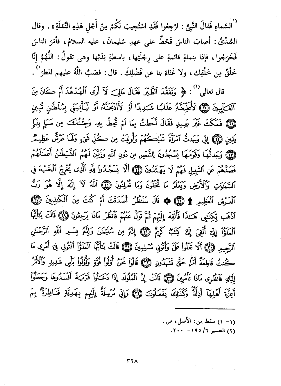 السَّمَاءِ فَقَالَ النَّبِيُّ: ارْجِعُوا فَقَدِ اسْتُجِيبَ لَكُمْ مِنْ أَجْلِ هَذِهِ النَّمْلَةِ» وَقَالَ السُّدِّيُّ: أَصَابَ النَّاسَ قَحْطٌ عَلَى عَهْدِ سُلَيْمَانَ، عَلَيْهِ السَّلَامُ، فَأَمَرَ النَّاسَ فَخَرَجُوا، فَإِذَا بِنَمْلَةٍ قَائِمَةٍ عَلَى رِجْلَيْهَا، بَاسِطَةٍ يَدَيْهَا وَهِيَ تَقُولُ: اللَّهُمَّ إِنَّا خَلْقٌ مِنْ خَلْقِكَ وَلَا غَنَاءَ بِنَا عَنْ فَضْلِكَ. قَالَ: فَصَبَّ اللَّهُ عَلَيْهِمُ الْمَطَرَ.