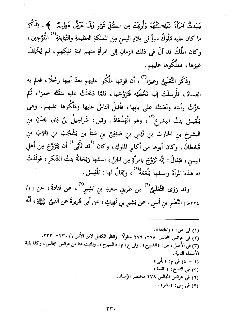 {إِنِّي وَجَدْتُ امْرَأَةً تَمْلِكُهُمْ وَأُوتِيَتْ مِنْ كُلِّ شَيْءٍ وَلَهَا عَرْشٌ عَظِيمٌ} [النمل: 23] يَذْكُرُ مَا كَانَ عَلَيْهِ مُلُوكُ سَبَأٍ فِي بِلَادِ الْيَمَنِ مِنَ الْمَمْلَكَةِ الْعَظِيمَةِ وَالتَّبَابِعَةِ الْمُتَوَّجِينَ، وَكَانَ الْمُلْكُ قَدْ آلَ فِي ذَلِكَ الزَّمَانِ إِلَى امْرَأَةٍ مِنْهُمُ ابْنَةُ مَلِكِهِمْ، لَمْ يُخْلِفْ غَيْرَهَا فَمَلَّكُوهَا عَلَيْهِمْ.
