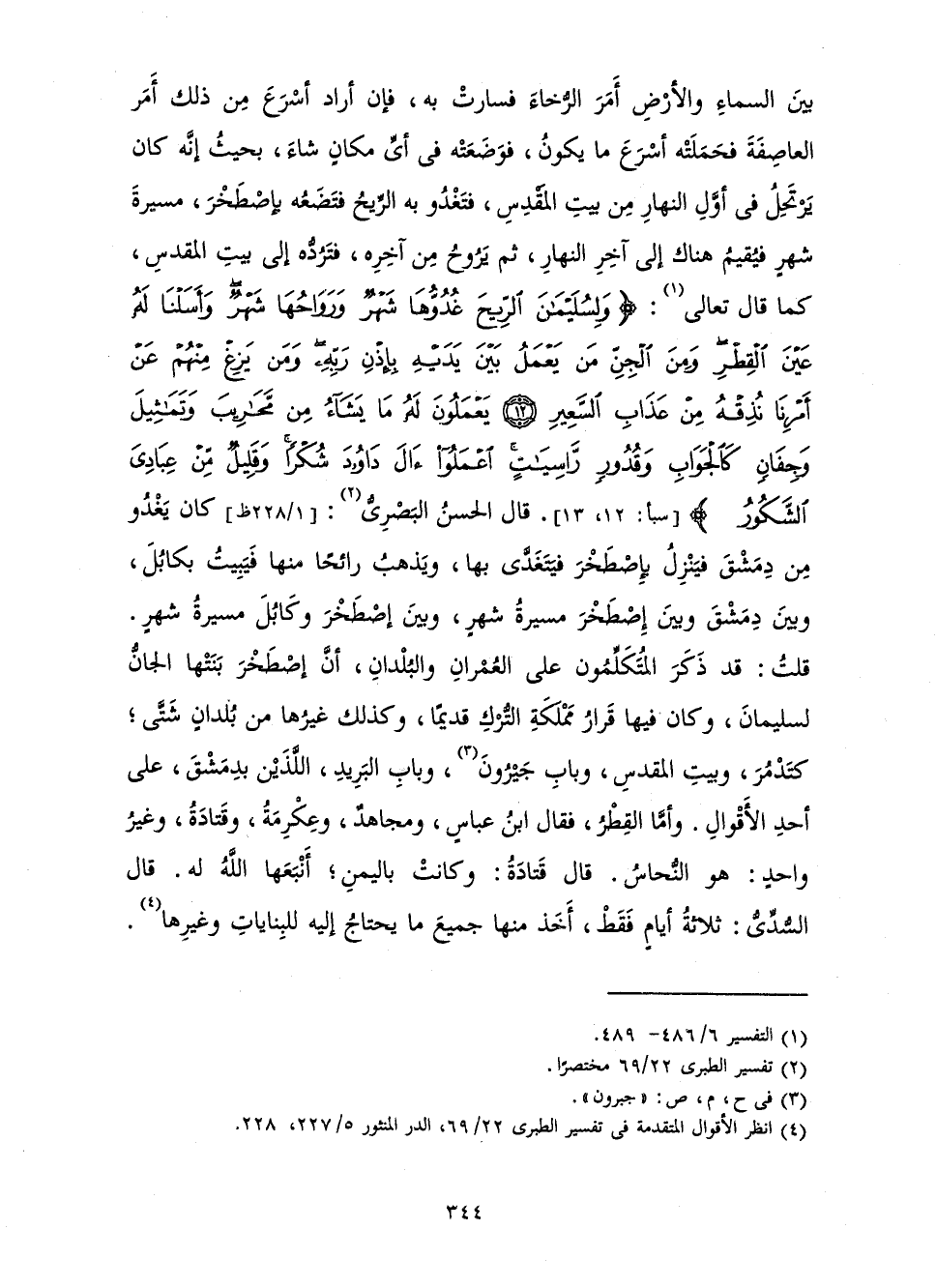 [سَبَأٍ: 12، 13] . قَالَ الْحَسَنُ الْبَصْرِيُّ: كَانَ يَغْدُو مِنْ دِمَشْقَ، فَيَنْزِلُ بِإِصْطَخْرَ فَيَتَغَدَّى بِهَا، وَيَذْهَبُ رَائِحًا مِنْهَا فَيَبِيتُ بِكَابُلَ، وَبَيْنَ دِمَشْقَ وَبَيْنَ إِصْطَخْرَ مَسِيرَةُ شَهْرٍ، وَبَيْنَ إِصْطَخْرَ وَكَابُلَ مَسِيرَةُ شَهْرٍ. قُلْتُ: قَدْ ذَكَرَ الْمُتَكَلِّمُونَ عَلَى الْعِمْرَانِ وَالْبُلْدَانِ، أَنَّ إِصْطَخْرَ بَنَتْهَا الْجَانُّ لِسُلَيْمَانَ وَكَانَ فِيهَا قَرَارُ مَمْلَكَةِ التُّرْكِ قَدِيمًا، وَكَذَلِكَ غَيْرُهَا مِنْ بُلْدَانٍ شَتَّى; كَتَدْمُرَ، وَبَيْتِ الْمَقْدِسِ، وَبَابِ جَيْرُونَ، وَبَابِ الْبَرِيدِ، اللَّذَيْنِ بِدِمَشْقَ، عَلَى أَحَدِ الْأَقْوَالِ. وَأَمَّا الْقِطْرُ، فَقَالَ ابْنُ عَبَّاسٍ، وَمُجَاهِدٌ، وَعِكْرِمَةُ، وَقَتَادَةُ، وَغَيْرُ وَاحِدٍ: هُوَ النُّحَاسُ. قَالَ قَتَادَةُ: وَكَانَتْ بِالْيَمَنِ ; أَنَبْعَهَا اللَّهُ لَهُ. قَالَ السُّدِّيُّ: ثَلَاثَةُ أَيَّامٍ فَقَطْ، أَخَذَ مِنْهَا جَمِيعَ مَا يَحْتَاجُ إِلَيْهِ لِلْبِنَايَاتِ وَغَيْرِهَا.