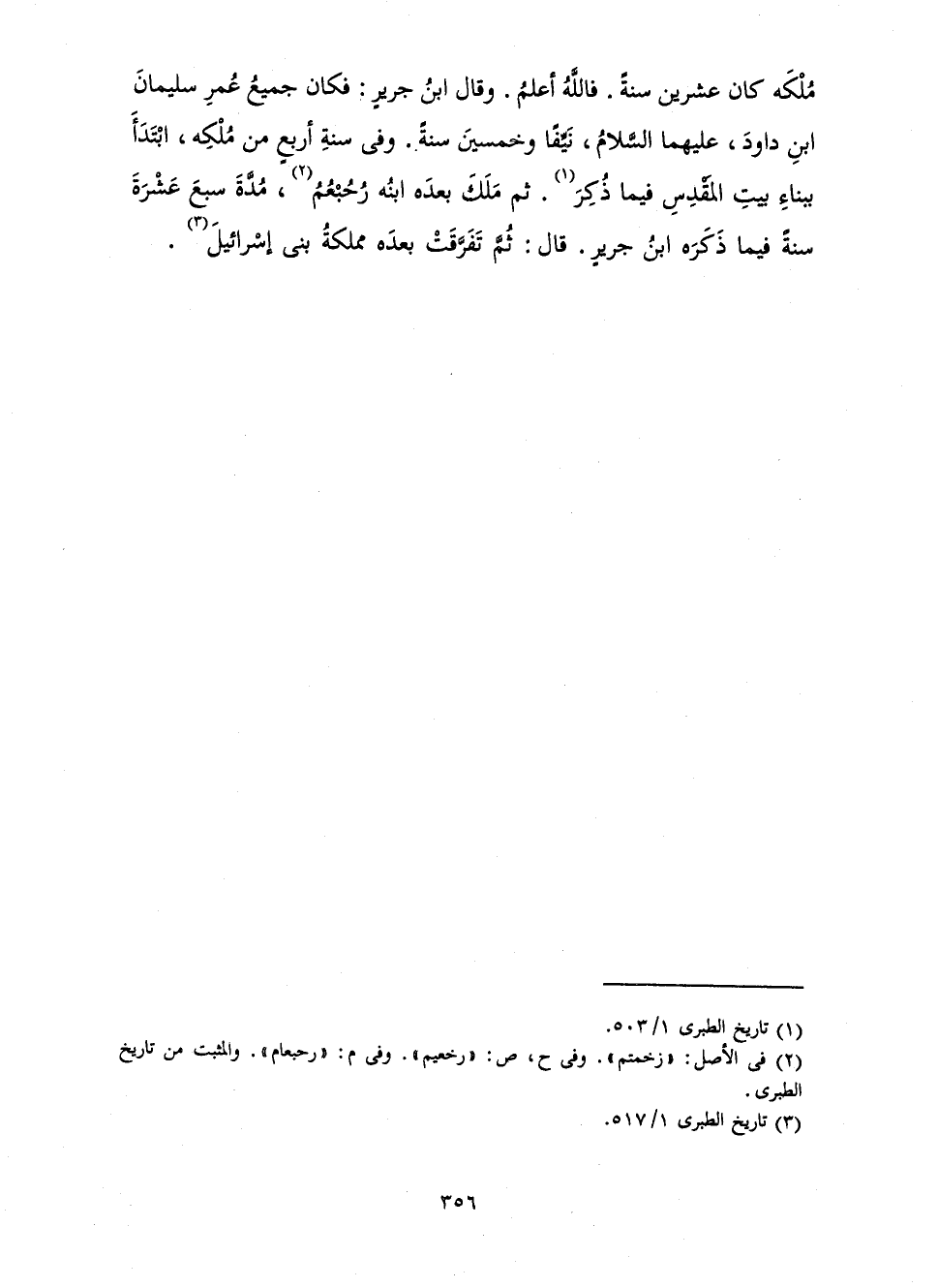 مُلْكَهُ كَانَ عِشْرِينَ سَنَةً. فَاللَّهُ أَعْلَمُ. وَقَالَ ابْنُ جَرِيرٍ: فَكَانَ جَمِيعُ عُمْرِ سُلَيْمَانَ بْنِ دَاوُدَ عَلَيْهِمَا السَّلَامُ، نَيِّفًا وَخَمْسِينَ سَنَةً. وَفِي سَنَةِ أَرْبَعٍ مِنْ مُلْكِهِ ابْتَدَأَ بِبِنَاءِ بَيْتِ الْمَقْدِسِ فِيمَا ذُكِرَ. ثُمَّ مَلَكَ بَعْدَهُ ابْنُهُ رُحُبْعُمُ مُدَّةَ سَبْعَ عَشْرَةَ سَنَةً فِيمَا ذَكَرَهُ ابْنُ جَرِيرٍ قَالَ: ثُمَّ تَفَرَّقَتْ بَعْدَهُ مَمْلَكَةُ بَنِي إِسْرَائِيلَ.