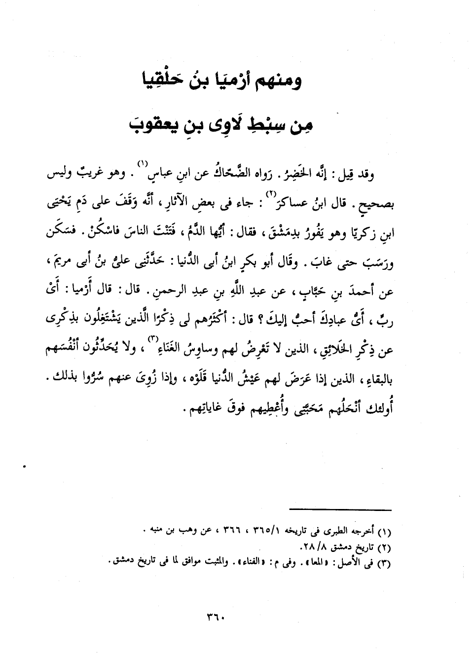 وَقَدْ قِيلَ: إِنَّهُ الْخَضِرُ. رَوَاهُ الضَّحَّاكُ عَنِ ابْنِ عَبَّاسٍ. وَهُوَ غَرِيبٌ وَلَيْسَ بِصَحِيحٍ. قَالَ ابْنُ عَسَاكِرَ: جَاءَ فِي بَعْضِ الْآثَارِ أَنَّهُ وَقَفَ عَلَى دَمِ يَحْيَى بْنِ زَكَرِيَّا وَهُوَ يَفُورُ بِدِمَشْقَ فَقَالَ: أَيُّهَا الدَّمُ، فَتَنْتَ النَّاسَ فَاسْكُنْ. فَسَكَنَ وَرَسَبَ حَتَّى غَابَ. وَقَالَ أَبُو بَكْرٍ ابْنُ أَبِي الدُّنْيَا حَدَّثَنِي عَلِيُّ بْنُ أَبِي مَرْيَمَ، عَنْ أَحْمَدَ بْنِ حَبَّابٍ، عَنْ عَبْدِ اللَّهِ بْنِ عَبْدِ الرَّحْمَنِ. قَالَ: قَالَ أَرْمِيَا: أَيْ رَبِّ أَيُّ عِبَادِكَ أَحَبُّ إِلَيْكَ؟ قَالَ: أَكْثَرُهُمْ لِي ذِكْرًا، الَّذِينَ يَشْتَغِلُونَ بِذِكْرِي عَنْ ذِكْرِ الْخَلَائِقِ، الَّذِينَ لَا تَعْرِضُ لَهُمْ وَسَاوِسُ الْغَنَاءِ، وَلَا يُحَدِّثُونَ أَنْفُسَهُمْ بِالْبَقَاءِ، الَّذِينَ إِذَا عَرَضَ لَهُمْ عَيْشُ الدُّنْيَا قَلَوْهُ، وَاذَا زُوِيَ عَنْهُمْ سُرُّوا بِذَلِكَ. أُولَئِكَ أَنْحَلُهُمْ مَحَبَّتِي وَأُعْطِيهِمْ فَوْقَ غَايَاتِهِمْ.
