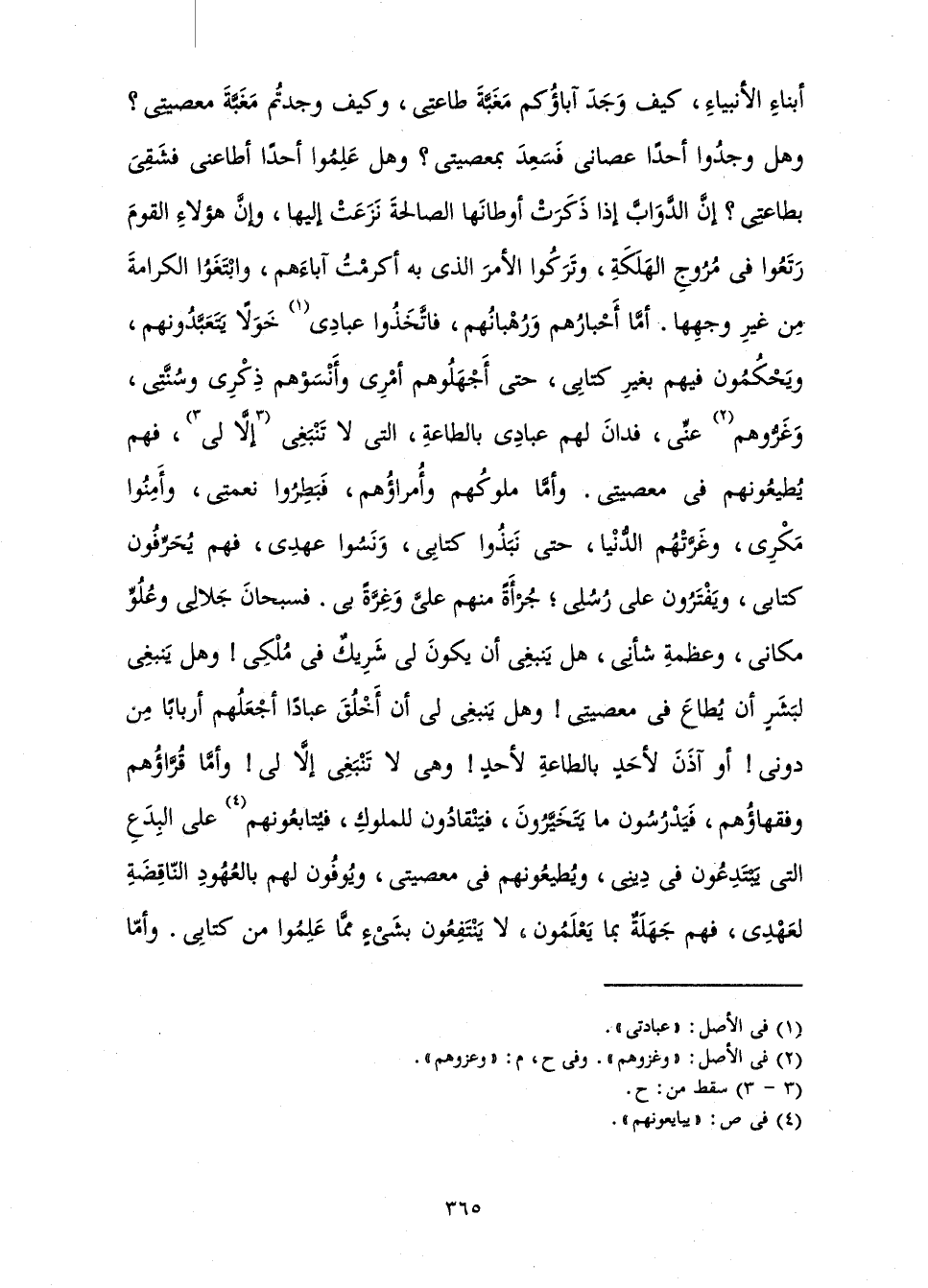 وَأَمَّا مُلُوكُهُمْ وَأُمَرَاؤُهُمْ، فَبَطَرُوا نِعْمَتِي، وَأَمِنُوا مَكْرِي، وَغَرَّتْهُمُ الدُّنْيَا، حَتَّى نَبَذُوا كِتَابِي، وَنَسُوا عَهْدِي، فَهُمْ يُحَرِّفُونَ كِتَابِي وَيَفْتَرُونَ عَلَى رُسُلِي ; جُرْأَةً مِنْهُمْ عَلَيَّ وَغِرَّةً بِي. فَسُبْحَانَ جَلَالِي، وَعُلُوِّ مَكَانِي، وَعَظَمَةِ شَأْنِي، هَلْ يَنْبَغِي أَنْ يَكُونَ لِي شَرِيكٌ فِي مُلْكِي؟! وَهَلْ يَنْبَغِي لِبَشَرٍ أَنْ يُطَاعَ فِي مَعْصِيَتِي؟! وَهَلْ يَنْبَغِي لِي أَنْ أَخْلُقَ عِبَادًا أَجْعَلُهُمْ أَرْبَابًا مِنْ دُونِي؟! أَوْ آذَنَ لِأَحَدٍ بِالطَّاعَةِ لِأَحَدٍ وَهِيَ لَا تَنْبَغِي إِلَّا لِي! وَأَمَّا قُرَّاؤُهُمْ وَفُقَهَاؤُهُمْ، فَيَدْرُسُونَ مَا يَتَخَيَّرُونَ، فَيَنْقَادُونَ لِلْمُلُوكِ، فَيُتَابِعُونَهُمْ عَلَى الْبِدَعِ الَّتِي يَبْتَدِعُونَ فِي دِينِي، وَيُطِيعُونَهُمْ فِي مَعْصِيَتِي، وَيُوفُونَ لَهُمْ بِالْعُهُودِ النَّاقِضَةِ لِعَهْدِي، فَهُمْ جَهَلَةٌ بِمَا يَعْلَمُونَ، لَا يَنْتَفِعُونَ بِشَيْءٍ مِمَّا عَلِمُوا مِنْ كِتَابِي. وَأَمَّا