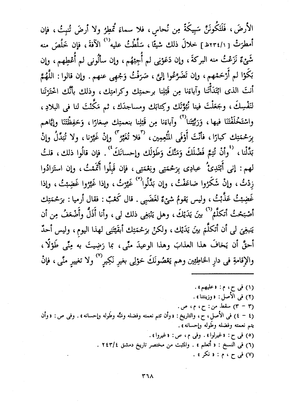 الْأَرْضَ فَلَتَكُونَنَّ سَبِيكَةً مِنْ نُحَاسٍ، فَلَا سَمَاءَ تُمْطِرُ وَلَا أَرْضَ تُنْبِتُ، فَإِنْ أَمْطَرَتْ خِلَالَ ذَلِكَ شَيْئًا سَلَّطْتُ عَلَيْهِمُ الْآفَةَ، فَإِنْ خَلُصَ مِنْهُ شَيْءٌ نَزَعْتُ مِنْهُ الْبَرَكَةَ، وَإِنْ دَعَوْنِي لَمْ أُجِبْهُمْ، وَإِنْ سَأَلُونِي لَمْ أُعْطِهِمْ، وَإِنْ بَكَوْا لَمْ أَرْحَمْهُمْ، وَإِنْ تَضَرَّعُوا إِلَيَّ صَرَفْتُ وَجْهِي عَنْهُمْ. وَإِنْ قَالُوا: اللَّهُمَّ أَنْتَ الَّذِي ابْتَدَأْتَنَا وَآبَاءَنَا مِنْ قَبْلِنَا بِرَحْمَتِكَ وَكَرَامَتِكَ وَذَلِكَ بِأَنَّكَ اخْتَرْتَنَا لِنَفْسِكَ وَجَعَلْتَ فِينَا نُبُوَّتَكَ وَكِتَابَكَ وَمَسَاجِدَكَ، ثُمَّ مَكَّنَتْ لَنَا فِي الْبِلَادِ وَاسْتَخْلَفْتَنَا فِيهَا وَرَبَّيْتَنَا وَآبَاءَنَا مِنْ قَبْلِنَا بِنِعْمَتِكَ صِغَارًا، وَحَفِظْتَنَا وَإِيَّاهُمْ بِرَحْمَتِكَ كِبَارًا، فَأَنْتَ أَوْفَى الْمُنْعِمِينَ، فَلَا تُغَيِّرْ وَإِنْ غَيَّرْنَا، وَلَا تُبَدِّلْ وَإِنْ بَدَّلْنَا، وَأَنْ تُتِمَّ فَضْلَكَ وَمَنَّكَ وَطَوْلَكَ وَإِحْسَانَكَ. فَإِنْ قَالُوا ذَلِكَ قُلْتُ لَهُمْ: إِنِّي أَبْتَدِئُ عِبَادِي بِرَحْمَتِي وَنِعْمَتِي، فَإِنْ قَبِلُوا أَتْمَمْتُ، وَإِنِ اسْتَزَادُوا زِدْتُ، وَإِنْ شَكَرُوا ضَاعَفْتُ، وَإِنْ بَدَّلُوا غَيَّرْتُ، وَإِذَا غَيَّرُوا غَضِبْتُ، وَإِذَا غَضِبْتُ عَذَّبْتُ، وَلَيْسَ يَقُومُ شَيْءٌ لِغَضَبِي. قَالَ كَعْبٌ: فَقَالَ أَرْمِيَا: بِرَحْمَتِكَ أَصْبَحْتُ أَتَكَلَّمُ بَيْنَ يَدَيْكَ، وَهَلْ يَنْبَغِي ذَلِكَ لِي وَأَنَا أَذَلُّ وَأَضْعَفُ مِنْ أَنْ يَنْبَغِيَ لِي أَنْ أَتَكَلَّمَ بَيْنَ يَدَيْكَ، وَلَكِنْ بِرَحْمَتِكَ أَبْقَيْتَنِي لِهَذَا الْيَوْمِ، وَلَيْسَ أَحَدٌ أَحَقَّ أَنْ يَخَافَ هَذَا الْعَذَابَ وَهَذَا الْوَعِيدَ مِنِّي، بِمَا رَضِيتَ بِهِ مِنِّي طَوْلًا، وَالْإِقَامَةِ فِي دَارِ الْخَاطِئِينَ وَهُمْ يَعْصُونَكَ حَوْلِي بِغَيْرِ نَكِيرٍ وَلَا تَغْيِيرٍ مِنِّي، فَإِنْ