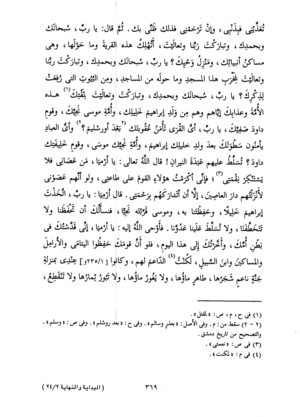 تُعَذِّبْنِي فَبِذَنْبِي وَإِنْ تَرْحَمْنِي فَذَلِكَ ظَنِّي بِكَ. ثُمَّ قَالَ: يَا رَبِّ، سُبْحَانَكَ وَبِحَمْدِكَ، وَتَبَارَكْتَ رَبَّنَا وَتَعَالَيْتَ، أَتُهْلِكُ هَذِهِ الْقَرْيَةَ وَمَا حَوْلَهَا وَهِيَ مَسَاكِنُ أَنْبِيَائِكَ، وَمَنْزِلُ وَحْيِكَ؟ يَا رَبِّ، سُبْحَانَكَ وَبِحَمْدِكَ وَتَبَارَكْتَ رَبَّنَا وَتَعَالَيْتَ لِمَخْرَبِ هَذَا الْمَسْجِدِ وَمَا حَوْلَهُ مِنَ الْمَسَاجِدِ، وَمِنَ الْبُيُوتِ الَّتِي رُفِعَتْ لِذِكْرِكَ؟ يَا رَبِّ، سُبْحَانَكَ وَبِحَمْدِكَ وَتَبَارَكْتَ وَتَعَالَيْتَ لِمَقْتِكَ هَذِهِ الْأُمَّةَ وَعَذَابِكَ إِيَّاهُمْ وَهُمْ مِنْ وَلَدِ إِبْرَاهِيمَ خَلِيلِكَ، وَأُمَّةِ مُوسَى نَجِيِّكَ، وَقَوْمِ دَاوُدَ صَفِيِّكَ، يَا رَبِّ، أَيُّ الْقُرَى تَأْمَنُ عُقُوبَتَكَ بَعْدَ أُورْشَلِيمَ؟ وَأَيُّ الْعِبَادِ يَأْمَنُونَ سَطْوَتَكَ بَعْدَ وَلَدِ خَلِيلِكَ إِبْرَاهِيمَ، وَأُمَّةِ نَجِيِّكَ مُوسَى، وَقَوْمِ خَلِيفَتِكَ دَاوُدَ؟ تُسَلِّطُ عَلَيْهِمْ عَبَدَةَ النِّيرَانِ! قَالَ اللَّهُ تَعَالَى: يَا أَرْمِيَا مَنْ عَصَانِي فَلَا يَسْتَنْكِرُ نِقْمَتِي ; فَإِنِّي إِنَّمَا أَكْرَمْتُ هَؤُلَاءِ الْقَوْمَ عَلَى طَاعَتِي، وَلَوْ أَنَّهُمْ عَصَوْنِي لَأَنْزَلْتُهُمْ دَارَ الْعَاصِينَ، إِلَّا أَنْ أَتَدَارَكَهُمْ بِرَحْمَتِي. قَالَ أَرْمِيَا: يَا رَبِّ، اتَّخَذْتَ إِبْرَاهِيمَ خَلِيلًا وَحَفِظْتَنَا بِهِ، وَمُوسَى قَرَّبْتَهُ نَجَّيًا، فَنَسْأَلُكَ أَنْ تَحْفَظَنَا وَلَا تَتَخَطَّفَنَا، وَلَا تُسَلِّطَ عَلَيْنَا عَدُوَّنَا. فَأَوْحَى اللَّهُ إِلَيْهِ: يَا أَرْمِيَا إِنِّي قَدَّسْتُكَ فِي بَطْنِ أُمِّكَ، وَأَخَّرْتُكَ إِلَى هَذَا الْيَوْمِ، فَلَوْ أَنَّ قَوْمَكَ حَفِظُوا الْيَتَامَى وَالْأَرَامِلَ وَالْمَسَاكِينَ وَابْنَ السَّبِيلِ، لَكُنْتُ الدَّاعِمَ لَهُمْ، وَكَانُوا عِنْدِي بِمَنْزِلَةِ جَنَّةٍ نَاعِمٍ شَجَرُهَا، طَاهِرٍ مَاؤُهَا، وَلَا يَغُورُ مَاؤُهَا، وَلَا تَبُورُ ثِمَارُهَا، وَلَا تَنْقَطِعُ