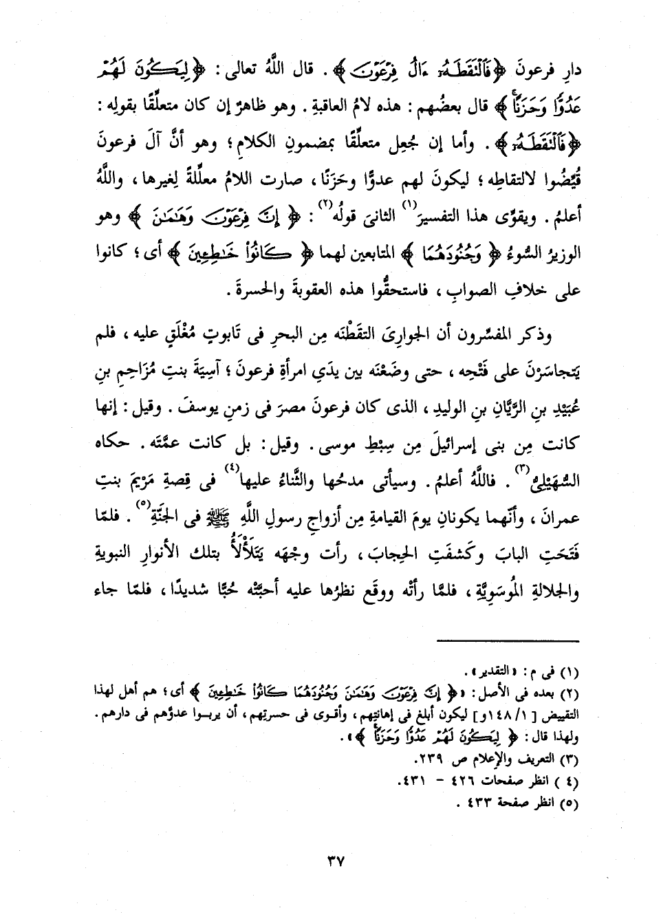 دَارِ فِرْعَوْنَ {فَالْتَقَطَهُ آلُ فِرْعَوْنَ} [القصص: 8] قَالَ اللَّهُ تَعَالَى: {لِيَكُونَ لَهُمْ عَدُوًّا وَحَزَنًا} [القصص: 8] قَالَ بَعْضُهُمْ: هَذِهِ لَامُ الْعَاقِبَةِ. وَهُوَ ظَاهِرٌ إِنْ كَانَ مُتَعَلِّقًا بِقَوْلِهِ فَالْتَقَطَهُ وَأَمَّا إِنْ جُعِلَ مُتَعَلِّقًا بِمَضْمُونِ الْكَلَامِ ; وَهُوَ أَنَّ آلَ فِرْعَوْنَ قُيِّضُوا لِالْتِقَاطِهِ ; لِيَكُونَ لَهُمْ عَدُوًّا وَحَزَنًا، صَارَتِ اللَّامُ مُعَلِّلَةً لِغَيْرِهَا، وَاللَّهُ أَعْلَمُ. وَيُقَوِّي هَذَا التَّفْسِيرَ الثَّانِيَ قَوْلُهُ {إِنَّ فِرْعَوْنَ وَهَامَانَ} [القصص: 8] وَهُوَ الْوَزِيرُ السُّوءُ وَجُنُودَهُمَا الْمُتَابِعِينَ لَهُمَا كَانُوا خَاطِئِينَ أَيْ ; كَانُوا عَلَى خِلَافِ الصَّوَابِ، فَاسْتَحَقُّوا هَذِهِ الْعُقُوبَةَ وَالْحَسْرَةَ.