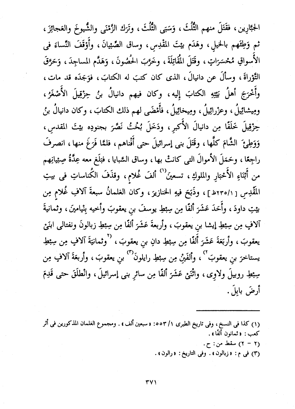 الْجَبَّارِينَ، فَقَتَلَ مِنْهُمُ الثُّلُثَ، وَسَبَى الثُّلُثَ، وَتَرَكَ الزَّمْنَى وَالشُّيُوخَ وَالْعَجَائِزَ، ثُمَّ وَطِئَهُمْ بِالْخَيْلِ، وَهَدَمَ بَيْتَ الْمَقْدِسِ، وَسَاقَ الصِّبْيَانَ، وَأَوْقَفَ النِّسَاءَ فِي الْأَسْوَاقِ مُحْسَرَاتٍ، وَقَتَلَ الْمُقَاتِلَةَ، وَخَرَّبَ الْحُصُونَ، وَهَدَمَ الْمَسَاجِدَ، وَحَرَقَ التَّوْرَاةَ، وَسَأَلَ عَنْ دَانْيَالَ الَّذِي كَانَ كَتَبَ لَهُ الْكِتَابَ، فَوَجَدُوهُ قَدْ مَاتَ، وَأَخْرَجَ أَهْلُ بَيْتِهِ الْكِتَابَ إِلَيْهِ، وَكَانَ فِيهِمْ دَانْيَالُ بْنُ حِزْقِيلَ الْأَصْغَرُ وَمِيشَائِيلُ، وَعِزْرَائِيلُ، وَمِيخَائِيلُ، فَأَمْضَى لَهُمْ ذَلِكَ الْكِتَابَ، وَكَانَ دَانْيَالُ بْنُ حِزْقِيلَ خَلَفًا مِنْ دَانْيَالَ الْأَكْبَرِ، وَدَخَلَ بُخْتُ نَصَّرَ بِجُنُودِهِ بَيْتَ الْمَقْدِسِ، وَوَطِئَ الشَّامَ كُلَّهَا، وَقَتَلَ بَنِي إِسْرَائِيلَ حَتَّى أَفْنَاهُمْ، فَلَمَّا فَرَغَ مِنْهَا انْصَرَفَ رَاجِعًا، وَحَمَلَ الْأَمْوَالَ الَّتِي كَانَتْ بِهَا وَسَاقَ السَّبَايَا، فَبَلَغَ مَعَهُ عِدَّةُ صِبْيَانِهِمْ مِنْ أَبْنَاءِ الْأَحْبَارِ وَالْمُلُوكِ تِسْعِينَ أَلْفَ غُلَامٍ، وَقَذَفَ الْكُنَاسَاتِ فِي بَيْتِ الْمَقْدِسِ، وَذَبَحَ فِيهِ الْخَنَازِيرَ، وَكَانَ الْغِلْمَانُ سَبْعَةَ آلَافِ غُلَامٍ مَنْ بَيْتِ دَاوُدَ، وَأَحَدَ عَشَرَ أَلْفًا مِنْ سِبْطِ يُوسُفَ بْنِ يَعْقُوبَ وَأَخِيهِ بِنْيَامِينَ، وَثَمَانِيَةَ آلَافٍ مِنْ سِبْطِ إِيشَا بْنِ يَعْقُوبَ وَأَرْبَعَةَ عَشَرَ أَلْفًا مِنْ سِبْطِ زَبَالُونَ وَنِفْتَالِي ابْنَيْ يَعْقُوبَ، وَأَرْبَعَةَ عَشَرَ أَلْفًا مِنْ سِبْطِ دَانِ بْنِ يَعْقُوبَ، وَثَمَانِيَةَ آلَافٍ مِنْ سِبْطِ يَسْتَاخِرَ بْنِ يَعْقُوبَ، وَأَلْفَيْنِ مِنْ سِبْطِ رَايْلُونَ بْنِ يَعْقُوبَ، وَأَرْبَعَةَ آلَافٍ مِنْ سِبْطِ رُوبِيلَ وَلَاوِي، وَاثْنَيْ عَشَرَ أَلْفًا مِنْ سَائِرِ بَنِي إِسْرَائِيلَ، وَانْطَلَقَ حَتَّى قَدِمَ أَرْضَ بَابِلَ.
