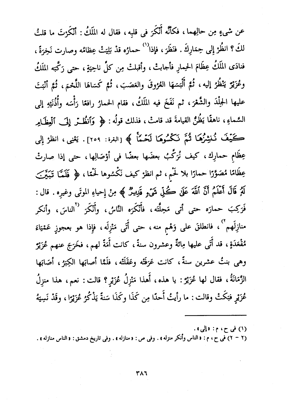 عَنْ شَيْءٍ مِنْ حَالِهِمَا، فَكَأَنَّهُ أَنْكَرَ فِي قَلْبِهِ، فَقَالَ لَهُ الْمَلَكُ: أَنْكَرْتَ مَا قُلْتُ لَكَ؟ انْظُرْ إِلَى حِمَارِكَ. فَنَظَرَ فَإِذَا حِمَارُهُ قَدْ بَلِيَتْ عِظَامُهُ وَصَارَتْ نَخِرَةً، فَنَادَى الْمَلَكُ عِظَامَ الْحِمَارِ، فَأَجَابَتْ وَأَقْبَلَتْ مِنْ كُلِّ نَاحِيَةٍ حَتَّى رَكَّبَهُ الْمَلَكُ، وَعُزَيْرٌ يَنْظُرُ إِلَيْهِ، ثُمَّ أَلْبَسَهَا الْعُرُوقَ وَالْعَصَبَ، ثُمَّ كَسَاهَا اللَّحْمَ، ثُمَّ أَنْبَتَ عَلَيْهَا الْجِلْدَ وَالشَّعْرَ، ثُمَّ نَفَخَ فِيهِ الْمَلَكُ، فَقَامَ الْحِمَارُ رَافِعًا رَأْسَهُ وَأُذُنَيْهِ إِلَى السَّمَاءِ، نَاهِقًا يَظُنُّ الْقِيَامَةَ قَدْ قَامَتْ، فَذَلِكَ قَوْلُهُ: {وَانْظُرْ إِلَى الْعِظَامِ كَيْفَ نُنْشِزُهَا ثُمَّ نَكْسُوهَا لَحْمًا} [البقرة: 259] . يَعْنِي انْظُرْ إِلَى عِظَامِ حِمَارِكَ كَيْفَ نُرَكِّبُ بَعْضَهَا بَعْضًا فِي أَوْصَالِهَا، حَتَّى إِذَا صَارَتْ عِظَامًا مُصَوَّرًا حِمَارًا بِلَا لَحْمٍ، ثُمَّ انْظُرْ كَيْفَ نَكْسُوهَا لَحْمًا، {فَلَمَّا تَبَيَّنَ لَهُ قَالَ أَعْلَمُ أَنَّ اللَّهَ عَلَى كُلِّ شَيْءٍ قَدِيرٌ} [البقرة: 259] مِنْ إِحْيَاءِ الْمَوْتَى وَغَيْرِهِ. قَالَ: فَرَكِبَ حِمَارَهُ حَتَّى أَتَى مَحِلَّتَهُ فَأَنْكَرَهُ النَّاسُ، وَأَنْكَرَ النَّاسَ، وَأَنْكَرَ مَنَازِلَهُمْ، فَانْطَلَقَ عَلَى وَهَمٍ مِنْهُ، حَتَّى أَتَى مَنْزِلَهُ، فَإِذَا هُوَ بِعَجُوزٍ عَمْيَاءَ مُقْعَدَةٍ قَدْ أَتَى عَلَيْهَا مِائَةٌ وَعِشْرُونَ سَنَةً، كَانَتْ أَمَةً لَهُمْ، فَخَرَجَ عَنْهُمْ عُزَيْرٌ وَهِيَ بِنْتُ عِشْرِينَ سَنَةً، كَانَتْ عَرَفَتْهُ وَعَقَلَتْهُ، فَلَمَّا أَصَابَهَا الْكِبَرُ أَصَابَهَا الزَّمَانَةُ فَقَالَ لَهَا عُزَيْرٌ: يَا هَذِهِ أَهَذَا مَنْزِلُ عُزَيْرٍ؟ قَالَتْ: نَعَمْ هَذَا مَنْزِلُ عُزَيْرٍ. فَبَكَتْ وَقَالَتْ: مَا رَأَيْتُ أَحَدًا مِنْ كَذَا وَكَذَا سَنَةٍ يَذْكُرُ عُزَيْرًا وَقَدْ نَسِيَهُ