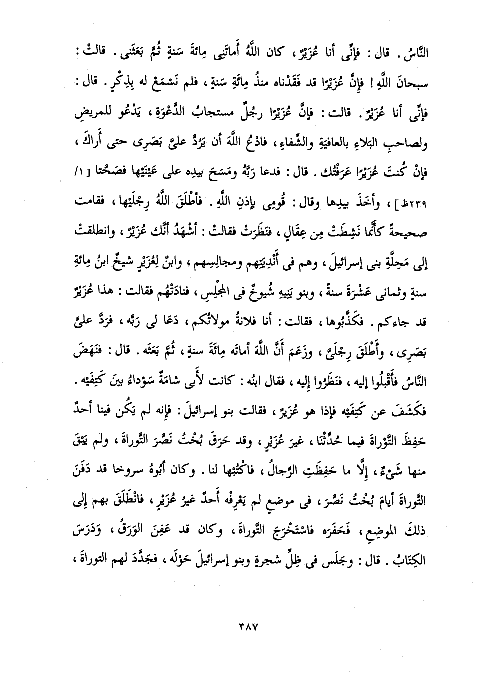 النَّاسُ. قَالَ: فَإِنِّي أَنَا عُزَيْرٌ، كَانَ اللَّهُ أَمَاتَنِي مِائَةَ سَنَةٍ ثُمَّ بَعَثَنِي. قَالَتْ: سُبْحَانَ اللَّهِ! فَإِنَّ عُزَيْرًا قَدْ فَقَدْنَاهُ مُنْذُ مِائَةِ سَنَةٍ، فَلَمْ نَسْمَعْ لَهُ بِذِكْرٍ. قَالَ: فَإِنِّي أَنَا عُزَيْرٌ. قَالَتْ: فَإِنَّ عُزَيْرًا رَجُلٌ مُسْتَجَابُ الدَّعْوَةِ، يَدْعُو لِلْمَرِيضِ وَلِصَاحِبِ الْبَلَاءِ بِالْعَافِيَةِ وَالشِّفَاءِ، فَادْعُ اللَّهَ أَنْ يَرُدَّ عَلَيَّ بَصَرِي حَتَّى أَرَاكَ، فَإِنْ كُنْتَ عُزَيْرًا عَرَفْتُكَ. قَالَ: فَدَعَا رَبَّهُ وَمَسَحَ بِيَدِهِ عَلَى عَيْنَيْهَا فَصَحَّتَا وَأَخَذَ بِيَدِهَا وَقَالَ: قُومِي بِإِذْنِ اللَّهِ. فَأَطْلَقَ اللَّهُ رِجْلَيْهَا، فَقَامَتْ صَحِيحَةً كَأَنَّمَا نَشِطَتْ مِنْ عِقَالٍ، فَنَظَرَتْ فَقَالَتْ: أَشْهَدُ أَنَّكَ عُزَيْرٌ وَانْطَلَقَتْ إِلَى مَحِلَّةِ بَنِي إِسْرَائِيلَ، وَهُمْ فِي أَنْدِيَتِهِمْ وَمَجَالِسِهِمْ، وَابْنٌ لِعُزَيْرٍ شَيْخٌ ابْنُ مِائَةِ سَنَةٍ وَثَمَانِي عَشْرَ سَنَةً وَبَنُو بَنِيهِ شُيُوخٌ فِي الْمَجْلِسِ، فَنَادَتْهُمْ فَقَالَتْ: هَذَا عُزَيْرٌ قَدْ جَاءَكُمْ. فَكَذَّبُوهَا، فَقَالَتْ: أَنَا فُلَانَةٌ مَوْلَاتُكُمْ دَعَا لِي رَبَّهُ، فَرَدَّ عَلَيَّ بَصَرِي وَأَطْلَقَ رِجْلَيَّ، وَزَعَمَ أَنَّ اللَّهَ أَمَاتَهُ مِائَةَ سَنَةٍ ثُمَّ بَعَثَهُ. قَالَ: فَنَهَضَ النَّاسُ، فَأَقْبَلُوا إِلَيْهِ، فَنَظَرُوا إِلَيْهِ فَقَالَ ابْنُهُ: كَانَ لِأَبِي شَامَةٌ سَوْدَاءُ بَيْنَ كَتِفَيْهِ. فَكَشَفَ عَنْ كَتِفَيْهِ، فَإِذَا هُوَ عُزَيْرٌ فَقَالَتْ بَنُو إِسْرَائِيلَ: فَإِنَّهُ لَمْ يَكُنْ فِينَا أَحَدٌ حَفِظَ التَّوْرَاةَ فِيمَا حُدِّثْنَا غَيْرُ عُزَيْرٍ وَقَدْ حَرَّقَ بُخْتُ نَصَّرَ التَّوْرَاةَ وَلَمْ يَبْقَ مِنْهَا شَيْءٌ إِلَّا مَا حَفِظَتِ الرِّجَالُ فَاكْتُبْهَا لَنَا. وَكَانَ أَبُوهُ سَرُوخَا قَدْ دَفَنَ التَّوْرَاةَ أَيَّامَ بُخْتُ نَصَّرَ فِي مَوْضِعٍ لَمْ يَعْرِفْهُ أَحَدٌ غَيْرُ عُزَيْرٍ فَانْطَلَقَ بِهِمْ إِلَى ذَلِكَ الْمَوْضِعِ فَحَفَرَهُ فَاسْتَخْرَجَ التَّوْرَاةَ، وَكَانَ قَدْ عَفِنَ الْوَرَقُ، وَدَرَسَ الْكِتَابُ. قَالَ: وَجَلَسَ فِي ظِلِّ شَجَرَةٍ وَبَنُو إِسْرَائِيلَ حَوْلَهُ، فَجَدَّدَ لَهُمُ التَّوْرَاةَ،