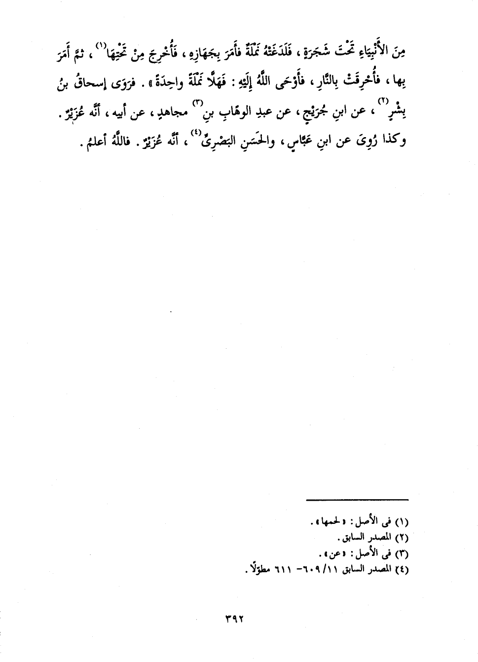 مِنَ الْأَنْبِيَاءِ تَحْتَ شَجَرَةٍ فَلَدَغَتْهُ نَمْلَةٌ، فَأَمَرَ بِجَهَازِهِ فَأُخْرِجَ مِنْ تَحْتِهَا، ثُمَّ أَمَرَ بِهَا فَأُحْرِقَتْ بِالنَّارِ، فَأَوْحَى اللَّهُ إِلَيْهِ: فَهَلَّا نَمْلَةً وَاحِدَةً» فَرَوَى إِسْحَاقُ بْنُ بِشْرٍ، عَنِ ابْنِ جُرَيْجٍ، عَنْ عَبْدِ الْوَهَّابِ بْنِ مُجَاهِدٍ عَنْ أَبِيهِ، أَنَّهُ عُزَيْرٌ. وَكَذَا رُوِيَ عَنِ ابْنِ عَبَّاسٍ وَالْحَسَنِ الْبَصْرِيِّ أَنَّهُ عُزَيْرٌ. فَاللَّهُ أَعْلَمُ.