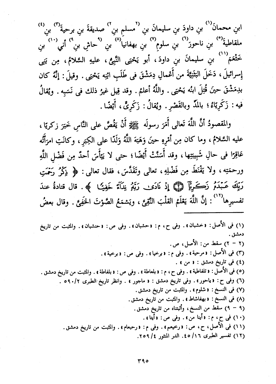 بْنِ مَحْمَانَ بْنِ دَاوُدَ بْنِ سُلَيْمَانَ بْنِ مُسْلِمِ بْنِ صَدِيقَةَ بْنِ بِرْحِيَةَ بْنِ مَلْقَاطْيَةَ بْنِ نَاحُورَ بْنِ سَلُومَ بْنِ بَهَفَانْيَا بْنِ حَاشَ بْنِ أَنِي بْنِ خَثْعَمَ بْنِ سُلَيْمَانَ بْنِ دَاوُدَ، أَبُو يَحْيَى النَّبِيُّ عَلَيْهِ السَّلَامُ، مِنْ بَنِي إِسْرَائِيلَ، دَخَلَ الْبَثَنِيَّةَ مِنْ أَعْمَالِ دِمَشْقَ فِي طَلَبِ ابْنِهِ يَحْيَى. وَقِيلَ: إِنَّهُ كَانَ بِدِمَشْقَ حِينَ قُتِلَ ابْنُهُ يَحْيَى. وَاللَّهُ أَعْلَمُ. وَقَدْ قِيلَ غَيْرُ ذَلِكَ فِي نَسَبِهِ. وَيُقَالُ فِيهِ: زَكَرِيَّاءُ بِالْمَدِّ وَبِالْقَصْرِ. وَيُقَالُ: زَكَرِيٌّ أَيْضًا.