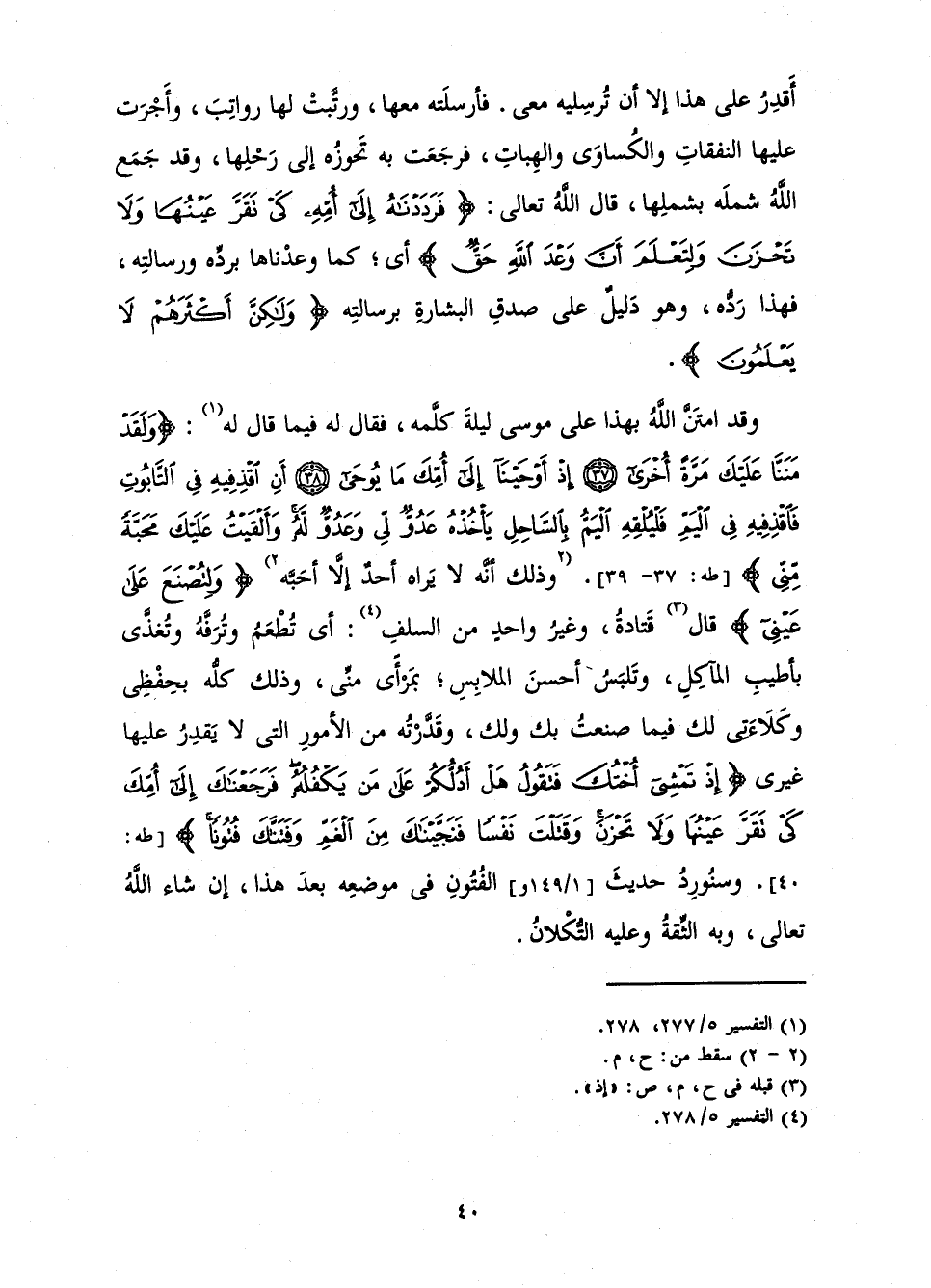 [طه 37 - 39] . وَذَلِكَ أَنَّهُ لَا يَرَاهُ أَحَدٌ إِلَّا أَحَبَّهُ {وَلِتُصْنَعَ عَلَى عَيْنِي} [طه: 39] قَالَ قَتَادَةُ، وَغَيْرُ وَاحِدٍ مِنَ السَّلَفِ: أَيْ تُطْعَمَ وَتُرَفَّهَ وَتُغَذَّى بِأَطْيَبِ الْمَآكِلِ، وَتَلْبَسَ أَحْسَنَ الْمَلَابِسِ ; بِمَرْأًى مِنِّي، وَذَلِكَ كُلُّهُ بِحِفْظِي وَكَلَاءَتِي لَكَ فِيمَا صَنَعْتُ بِكَ وَلَكَ، وَقَدَّرْتُهُ مِنَ الْأُمُورِ الَّتِي لَا يَقْدِرُ عَلَيْهَا غَيْرِي {إِذْ تَمْشِي أُخْتُكَ فَتَقُولُ هَلْ أَدُلُّكُمْ عَلَى مَنْ يَكْفُلُهُ فَرَجَعْنَاكَ إِلَى أُمِّكَ كَيْ تَقَرَّ عَيْنُهَا وَلَا تَحْزَنَ وَقَتَلْتَ نَفْسًا فَنَجَّيْنَاكَ مِنَ الْغَمِّ وَفَتَنَّاكَ فُتُونًا} [طه: 40] . وَسَنُورِدُ حَدِيثَ الْفِتُونِ فِي مَوْضِعِهِ بَعْدَ هَذَا، إِنْ شَاءَ اللَّهُ تَعَالَى، وَبِهِ الثِّقَةُ وَعَلَيْهِ التُّكْلَانُ.