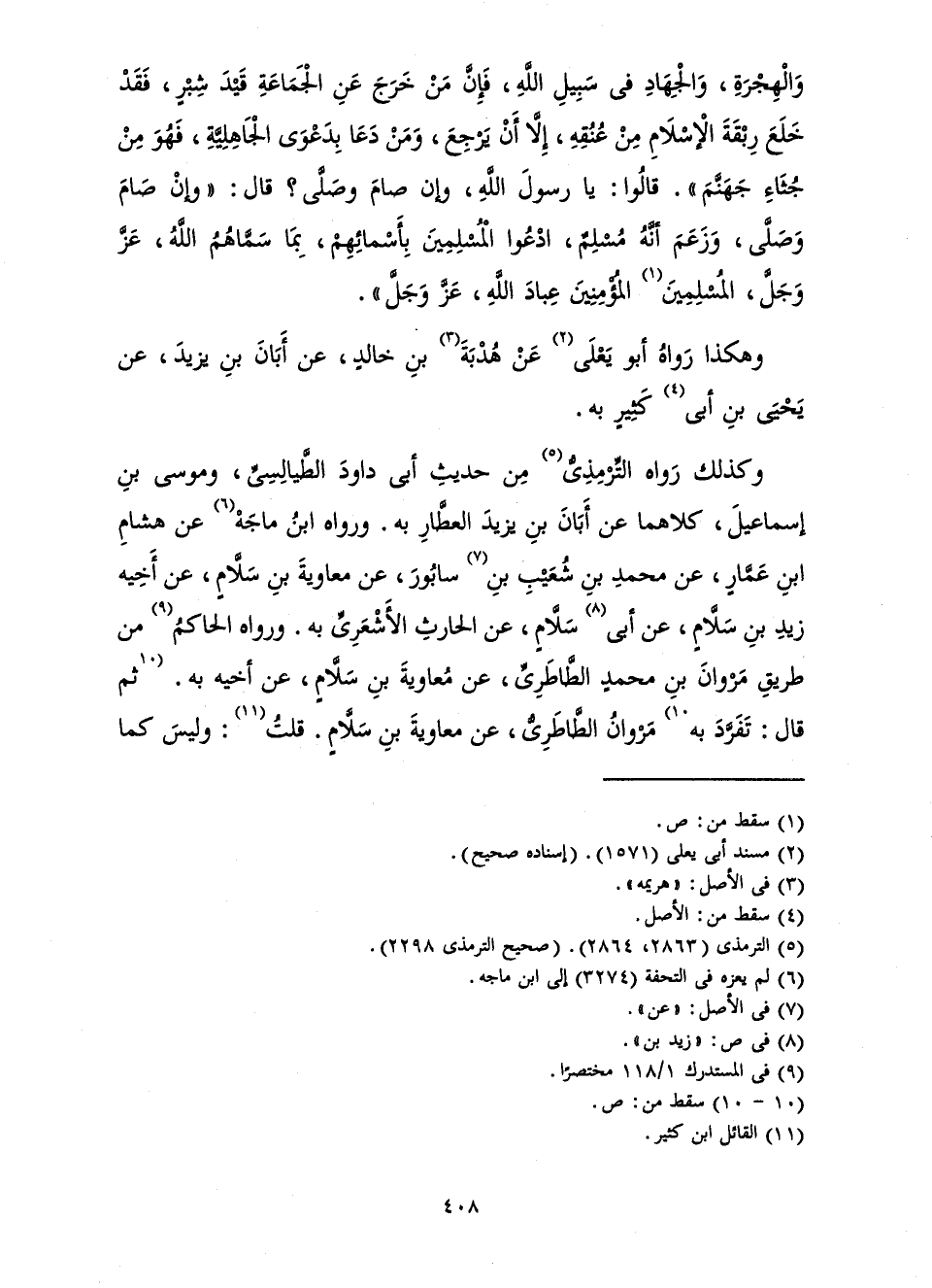 وَالْهِجْرَةِ، وَالْجِهَادِ فِي سَبِيلِ اللَّهِ، فَإِنَّ مَنْ خَرَجَ عَنِ الْجَمَاعَةِ قِيدَ شِبْرٍ، فَقَدْ خَلَعَ رِبْقَةَ الْإِسْلَامِ مِنْ عُنُقِهِ، إِلَّا أَنْ يَرْجِعَ، وَمَنْ دَعَا بِدَعْوَى الْجَاهِلِيَّةِ، فَهُوَ مِنْ جُثَاءِ جَهَنَّمَ. قَالُوا: يَا رَسُولَ اللَّهِ، وَإِنْ صَامَ وَصَلَّى؟ قَالَ: وَإِنْ صَامَ وَصَلَّى وَزَعَمَ أَنَّهُ مُسْلِمٌ، ادْعُوَا الْمُسْلِمِينَ بِأَسْمَائِهِمْ، بِمَا سَمَّاهُمُ اللَّهُ، عَزَّ وَجَلَّ، الْمُسْلِمِينَ الْمُؤْمِنِينَ عِبَادَ اللَّهِ عَزَّ وَجَلَّ» .