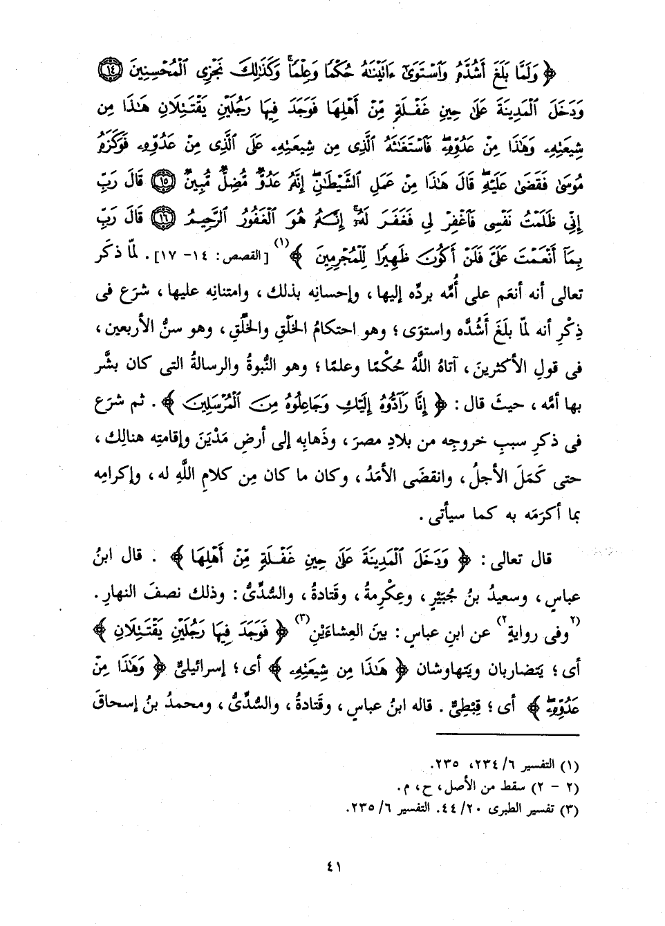 {وَلَمَّا بَلَغَ أَشُدَّهُ وَاسْتَوَى آتَيْنَاهُ حُكْمًا وَعِلْمًا وَكَذَلِكَ نَجْزِي الْمُحْسِنِينَ - وَدَخَلَ الْمَدِينَةَ عَلَى حِينِ غَفْلَةٍ مِنْ أَهْلِهَا فَوَجَدَ فِيهَا رَجُلَيْنِ يَقْتَتِلَانِ هَذَا مِنْ شِيعَتِهِ وَهَذَا مِنْ عَدُوِّهِ فَاسْتَغَاثَهُ الَّذِي مِنْ شِيعَتِهِ عَلَى الَّذِي مِنْ عَدُوِّهِ فَوَكَزَهُ مُوسَى فَقَضَى عَلَيْهِ قَالَ هَذَا مِنْ عَمَلِ الشَّيْطَانِ إِنَّهُ عَدُوٌّ مُضِلٌّ مُبِينٌ - قَالَ رَبِّ إِنِّي ظَلَمْتُ نَفْسِي فَاغْفِرْ لِي فَغَفَرَ لَهُ إِنَّهُ هُوَ الْغَفُورُ الرَّحِيمُ - قَالَ رَبِّ بِمَا أَنْعَمْتَ عَلَيَّ فَلَنْ أَكُونَ ظَهِيرًا لِلْمُجْرِمِينَ} [القصص: 14 - 17]