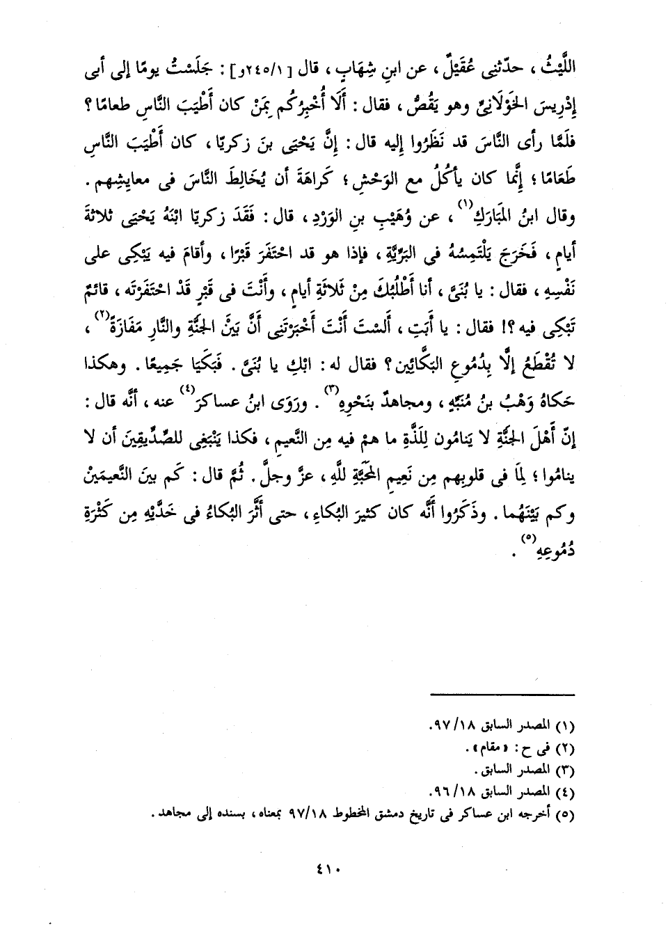 اللَّيْثُ، حَدَّثَنِي عُقَيْلٌ، عَنِ ابْنِ شِهَابٍ، قَالَ: جَلَسْتُ يَوْمًا إِلَى أَبِي إِدْرِيسَ الْخَوْلَانِيِّ وَهُوَ يَقُصُّ، فَقَالَ: أَلَا أُخْبِرُكُمْ بِمَنْ كَانَ أَطْيَبَ النَّاسِ طَعَامًا؟ فَلَمَّا رَأَى النَّاسَ قَدْ نَظَرُوا إِلَيْهِ قَالَ: إِنَّ يَحْيَى بْنَ زَكَرِيَّا، كَانَ أَطْيَبَ النَّاسِ طَعَامًا ; إِنَّمَا كَانَ يَأْكُلُ مَعَ الْوَحْشِ ; كَرَاهَةَ أَنْ يُخَالِطَ النَّاسَ فِي مَعَايِشِهِمْ. وَقَالَ ابْنُ الْمُبَارَكِ، عَنْ وُهَيْبِ بْنِ الْوَرْدِ، قَالَ: فَقَدَ زَكَرِيَّا ابْنَهُ يَحْيَى ثَلَاثَةَ أَيَّامٍ، فَخَرَجَ يَلْتَمِسُهُ فِي الْبَرِّيَّةِ، فَإِذَا هُوَ قَدِ احْتَفَرَ قَبْرًا وَأَقَامَ فِيهِ يَبْكِي عَلَى نَفْسِهِ. فَقَالَ: يَا بُنَيَّ أَنَا أَطْلُبُكَ مِنْ ثَلَاثَةِ أَيَّامٍ، وَأَنْتَ فِي قَبْرٍ قَدِ احْتَفَرْتَهُ، قَائِمٌ تَبْكِي فِيهِ؟! فَقَالَ: يَا أَبَتِ، أَلَسْتَ أَنْتَ أَخْبَرْتَنِي أَنَّ بَيْنَ الْجَنَّةِ وَالنَّارِ مَفَازَةً لَا تُقْطَعُ إِلَّا بِدُمُوعِ الْبَكَّائِينَ؟ فَقَالَ لَهُ: ابْكِ يَا بُنَيَّ. فَبَكَيَا جَمِيعًا. وَهَكَذَا حَكَاهُ وَهْبُ بْنُ مُنَبِّهٍ، وَمُجَاهِدٌ بِنَحْوِهِ. وَرَوَى ابْنُ عَسَاكِرَ عَنْهُ، أَنَّهُ قَالَ: إِنَّ أَهْلَ الْجَنَّةِ لَا يَنَامُونَ لِلَذَّةِ مَا هُمْ فِيهِ مِنَ النَّعِيمِ، فَكَذَا يَنْبَغِي لِلصِّدِّيقِينَ أَنْ لَا يَنَامُوا ; لِمَا فِي قُلُوبِهِمْ مِنْ نَعِيمِ الْمَحَبَّةِ لِلَّهِ عَزَّ وَجَلَّ. ثُمَّ قَالَ: كَمْ بَيْنَ النَّعِيمَيْنِ وَكَمْ بَيْنَهُمَا. وَذَكَرُوا أَنَّهُ كَانَ كَثِيرَ الْبُكَاءِ، حَتَّى أَثَّرَ الْبُكَاءُ فِي خَدَّيْهِ مِنْ كَثْرَةِ دُمُوعِهِ.
