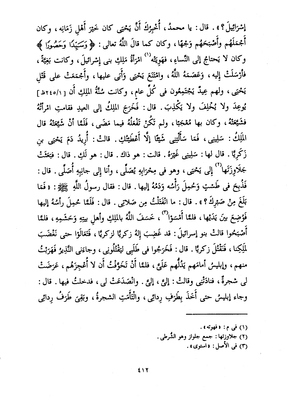 إِسْرَائِيلَ؟ قَالَ: يَا مُحَمَّدُ، أُخْبِرُكَ أَنَّ يَحْيَى كَانَ خَيْرَ أَهْلِ زَمَانِهِ، وَكَانَ أَجْمَلَهُمْ، وَأَصْبَحَهُمْ وَجْهًا، وَكَانَ كَمَا قَالَ اللَّهُ تَعَالَى: {سَيِّدًا وَحَصُورًا} [آل عمران: 39] وَكَانَ لَا يَحْتَاجُ إِلَى النِّسَاءِ، فَهَوِيَتْهُ امْرَأَةُ مَلِكِ بَنِي إِسْرَائِيلَ، وَكَانَتْ بَغِيَّةً، فَأَرْسَلَتْ إِلَيْهِ، وَعَصَمَهُ اللَّهُ، وَامْتَنَعَ يَحْيَى وَأَبَى عَلَيْهَا، وَأَجْمَعَتْ عَلَى قَتْلِ يَحْيَى، وَلَهُمْ عِيدٌ يَجْتَمِعُونَ فِي كُلِّ عَامٍ، وَكَانَتْ سُنَّةُ الْمَلِكَ أَنْ يُوعِدَ وَلَا يُخْلِفَ وَلَا يَكْذِبَ. قَالَ: فَخَرَجَ الْمَلِكُ إِلَى الْعِيدِ فَقَامَتِ امْرَأَتُهُ فَشَيَّعَتْهُ، وَكَانَ بِهَا مُعْجَبًا، وَلَمْ تَكُنْ تَفْعَلُهُ فِيمَا مَضَى، فَلَمَّا أَنْ شَيَّعَتْهُ قَالَ الْمَلِكُ: سَلِينِي، فَمَا سَأَلْتِنِي شَيْئًا إِلَّا أَعْطَيْتُكِ. قَالَتْ: أُرِيدُ دَمَ يَحْيَى بْنِ زَكَرِيَّا. قَالَ لَهَا: سَلِينِي غَيْرَهُ. قَالَتْ: هُوَ ذَاكَ. قَالَ: هُوَ لَكِ. قَالَ: فَبَعَثَتْ جَلَاوِزَتَهَا إِلَى يَحْيَى، وَهُوَ فِي مِحْرَابِهِ يُصَلِّي، وَأَنَا إِلَى جَانِبِهِ أُصَلِّي. قَالَ: فَذُبِحَ فِي طَسْتٍ وَحُمِلَ رَأْسُهُ وَدَمُهُ إِلَيْهَا. قَالَ: فَقَالَ رَسُولُ اللَّهِ صَلَّى اللَّهُ عَلَيْهِ وَسَلَّمَ: فَمَا بَلَغَ مِنْ صَبْرِكَ؟ قَالَ: مَا انْفَتَلْتُ مِنْ صَلَاتِي. قَالَ: فَلَمَّا حُمِلَ رَأْسُهُ إِلَيْهَا، فَوُضِعَ بَيْنَ يَدَيْهَا، فَلَمَّا أَمْسَوْا خَسَفَ اللَّهُ بِالْمَلِكِ وَأَهْلِ بَيْتِهِ وَحَشَمِهِ، فَلَمَّا أَصْبَحُوا قَالَتْ بَنُو إِسْرَائِيلَ: قَدْ غَضِبَ إِلَهُ زَكَرِيَّا لِزَكَرِيَّا، فَتَعَالَوْا حَتَّى نَغْضَبَ لِمَلِكِنَا، فَنَقْتُلَ زَكَرِيَّا. قَالَ: فَخَرَجُوا فِي طَلَبِي لِيَقْتُلُونِي، وَجَاءَنِي النَّذِيرُ فَهَرَبْتُ مِنْهُمْ، وَإِبْلِيسُ أَمَامَهُمْ يَدُلُّهُمْ عَلَيَّ، فَلَمَّا تَخَوَّفْتُ أَنْ لَا أُعْجِزَهُمْ، عَرَضَتْ لِي شَجَرَةٌ فَنَادَتْنِي وَقَالَتْ: إِلَيَّ إِلَيَّ. وَانْصَدَعَتْ لِي فَدَخَلْتُ فِيهَا. قَالَ: وَجَاءَ إِبْلِيسُ حَتَّى أَخَذَ بِطَرَفِ رِدَائِي، وَالْتَأَمَتِ الشَّجَرَةُ، وَبَقِيَ طَرَفُ رِدَائِي
