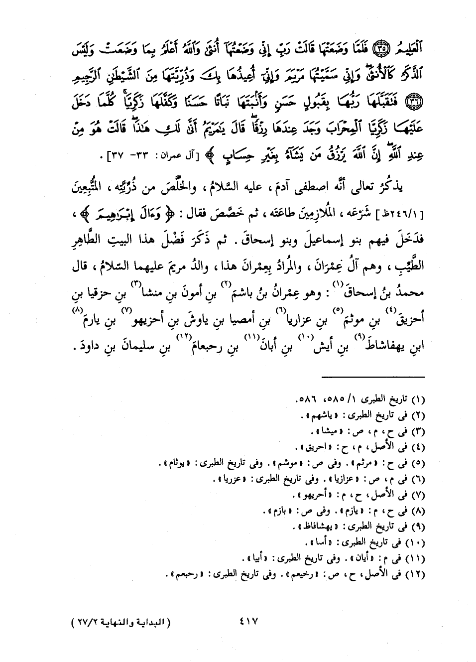 يَذْكُرُ تَعَالَى أَنَّهُ اصْطَفَى آدَمَ، عَلَيْهِ السَّلَامُ، وَالْخُلَّصَ مِنْ ذُرِّيَّتِهِ الْمُتَّبِعِينَ شَرْعَهُ الْمُلَازِمِينَ طَاعَتَهُ، ثُمَّ خَصَّصَ فَقَالَ: وَآلَ إِبْرَاهِيمَ، فَدَخَلَ فِيهِمْ بَنُو إِسْمَاعِيلَ، وَبَنُو إِسْحَاقَ. ثُمَّ ذَكَرَ فَضْلَ هَذَا الْبَيْتِ الطَّاهِرِ الطَّيِّبِ، وَهُمْ آلُ عِمْرَانَ، وَالْمُرَادُ بِعِمْرَانَ هَذَا وَالِدُ مَرْيَمَ عَلَيْهِمَا السَّلَامُ، قَالَ مُحَمَّدُ بْنُ إِسْحَاقَ: وَهُوَ عِمْرَانُ بْنُ بَاشِمَ بْنُ أَمُونَ بْنِ مَنْشَا بْنِ حِزْقِيَا بْنِ أَحْزِيقَ بْنِ مَوْثِمَ بْنِ عَزَارْيَا بْنِ أَمْصِيَا بْنِ يَاوِشَ بْنِ أَحْزِيهُو بْنُ يَارِمَ بْنُ يَهْفَاشَاطَ بْنِ أَيْشِ بْنِ أَبَانَ بْنِ رَحْبَعَامَ بْنِ سُلَيْمَانَ بْنِ دَاوُدَ.
