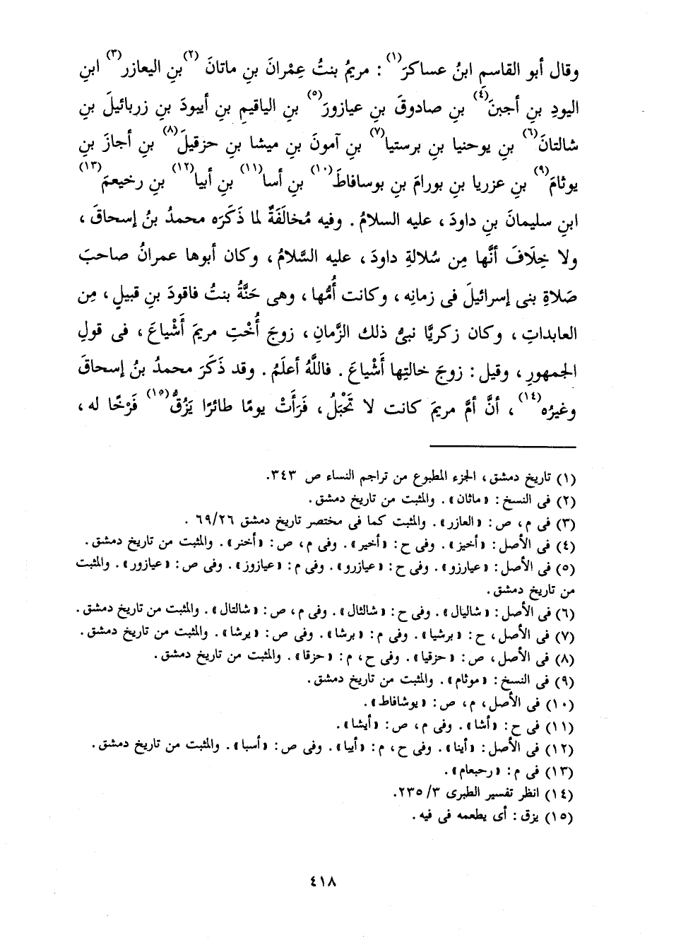 وَقَالَ أَبُو الْقَاسِمِ ابْنُ عَسَاكِرَ: مَرْيَمُ بِنْتُ عِمْرَانَ بْنِ مَاتَانَ بْنِ الَيعَازِرَ بْنِ الْيُودِ بْنِ أَجْبَنَ بْنِ صَادُوقَ بْنِ عَيَازُورَ بْنِ الْيَاقِيمِ بْنِ أَيْبُودَ بْنِ زَرْبَائِيلَ بْنِ شَالْتَانِ بْنِ يُوحِنْيَا بْنِ بِرِسْتِيَا بْنِ آمُونَ بْنِ مِيشَا بْنِ حَزْقِيلَ بْنِ أَجَازَ بْنِ يُوثَامَ بْنِ عَزِرْيَا بْنِ بُورَامَ بْنِ بُوسَافَاطَ بْنِ أَسَا بْنِ أَبْيَا بْنِ رَخِيعَمَ بْنِ سُلَيْمَانَ بْنِ دَاوُدَ، عَلَيْهِ السَّلَامُ. وَفِيهِ مُخَالَفَةٌ لِمَا ذَكَرَهُ مُحَمَّدُ بْنُ إِسْحَاقَ، وَلَا خِلَافَ أَنَّهَا مِنْ سُلَالَةِ دَاوُدَ، عَلَيْهِ السَّلَامُ، وَكَانَ أَبُوهَا عِمْرَانُ صَاحِبَ صَلَاةِ بَنِي إِسْرَائِيلَ فِي زَمَانِهِ، وَكَانَتْ أُمُّهَا، وَهِيَ حَنَّةُ بِنْتُ فَاقُودَ بْنِ قُبَيْلَ، مِنَ الْعَابِدَاتِ، وَكَانَ زَكَرِيَّا نَبِيُّ ذَلِكَ الزَّمَانِ زَوْجَ أُخْتِ مَرْيَمَ أَشْيَاعَ فِي قَوْلِ الْجُمْهُورِ، وَقِيلَ: زَوْجُ خَالَتِهَا أَشْيَاعَ. فَاللَّهُ أَعْلَمُ.