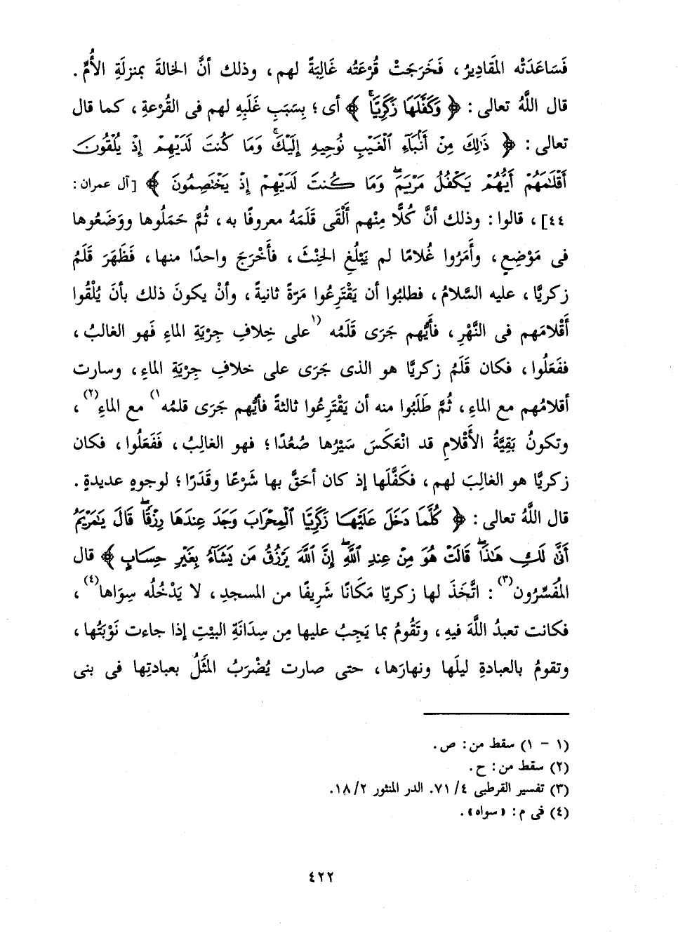 قَالَ اللَّهُ تَعَالَى " {وَكَفَّلَهَا زَكَرِيَّا} [آل عمران: 37] أَيْ: بِسَبَبِ غَلَبِهِ لَهُمْ فِي الْقُرْعَةِ، كَمَا قَالَ تَعَالَى: {ذَلِكَ مِنْ أَنْبَاءِ الْغَيْبِ نُوحِيهِ إِلَيْكَ وَمَا كُنْتَ لَدَيْهِمْ إِذْ يُلْقُونَ أَقْلَامَهُمْ أَيُّهُمْ يَكْفُلُ مَرْيَمَ وَمَا كُنْتَ لَدَيْهِمْ إِذْ يَخْتَصِمُونَ} [آل عمران: 44] . قَالُوا: وَذَلِكَ أَنَّ كُلًّا مِنْهُمْ أَلْقَى قَلَمَهُ مَعْرُوفًا بِهِ، ثُمَّ حَمَلُوهَا وَوَضَعُوهَا فِي مَوْضِعٍ، وَأَمَرُوا غُلَامًا لَمْ يَبْلُغِ الْحِنْثَ، فَأَخْرَجَ وَاحِدًا مِنْهَا، وَظَهَرَ قَلَمُ زَكَرِيَّا، عَلَيْهِ السَّلَامُ، فَطَلَبُوا أَنْ يَقْتَرِعُوا مَرَّةً ثَانِيَةً، وَأَنْ يَكُونَ ذَلِكَ بِأَنْ يُلْقُوا أَقْلَامَهُمْ فِي النَّهْرِ، فَأَيُّهُمْ جَرَى قَلَمُهُ عَلَى خِلَافِ جَرْيَةِ الْمَاءِ فَهُوَ الْغَالِبُ، فَفَعَلُوا، فَكَانَ قَلَمُ زَكَرِيَّا هُوَ الَّذِي جَرَى عَلَى خِلَافِ جَرْيَةِ الْمَاءِ، وَسَارَتْ أَقْلَامُهُمْ مَعَ الْمَاءِ، ثُمَّ طَلَبُوا مِنْهُ أَنْ يَقْتَرِعُوا ثَالِثَةً، فَأَيُّهُمْ جَرَى قَلَمُهُ مَعَ الْمَاءِ، وَتَكُونُ بَقِيَّةُ الْأَقْلَامِ قَدِ انْعَكَسَ سَيْرُهَا صُعُدًا ; فَهُوَ الْغَالِبُ، فَفَعَلُوا، فَكَانَ زَكَرِيَّا هُوَ الْغَالِبَ لَهُمْ، فَكَفَلَهَا إِذْ كَانَ أَحَقَّ بِهَا شَرْعًا وَقَدَرًا ; لِوُجُوهٍ عَدِيدَةٍ. قَالَ اللَّهُ تَعَالَى: {كُلَّمَا دَخَلَ عَلَيْهَا زَكَرِيَّا الْمِحْرَابَ وَجَدَ عِنْدَهَا رِزْقًا قَالَ يَامَرْيَمُ أَنَّى لَكِ هَذَا قَالَتْ هُوَ مِنْ عِنْدِ اللَّهِ إِنَّ اللَّهَ يَرْزُقُ مَنْ يَشَاءُ بِغَيْرِ حِسَابٍ} [آل عمران: 37] قَالَ الْمُفَسِّرُونَ: اتَّخَذَ لَهَا زَكَرِيَّا مَكَانًا شَرِيفًا مِنَ الْمَسْجِدِ، لَا يَدْخُلُهُ سِوَاهَا، فَكَانَتْ تَعْبُدُ اللَّهَ فِيهِ، وَتَقُومُ بِمَا يَجِبُ عَلَيْهَا مِنْ سَدَانَةِ الْبَيْتِ إِذَا جَاءَتْ نَوْبَتُهَا، وَتَقُومُ بِالْعِبَادَةِ لَيْلَهَا وَنَهَارَهَا، حَتَّى صَارَتْ يُضْرَبُ بِهَا الْمَثَلُ بِعِبَادَتِهَا فِي