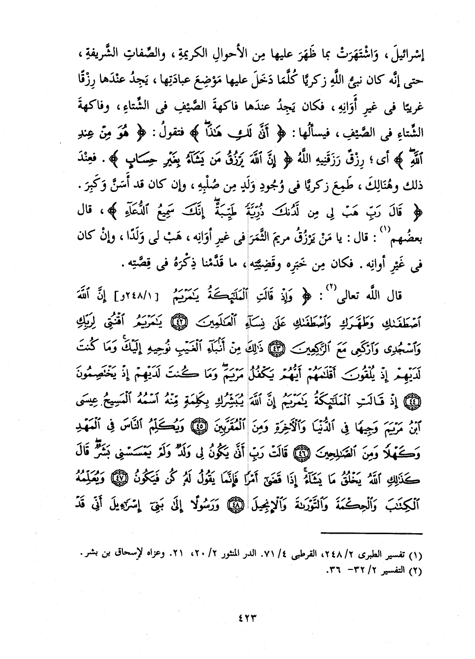 قَالَ اللَّهُ تَعَالَى: {وَإِذْ قَالَتِ الْمَلَائِكَةُ يَامَرْيَمُ إِنَّ اللَّهَ اصْطَفَاكِ وَطَهَّرَكِ وَاصْطَفَاكِ عَلَى نِسَاءِ الْعَالَمِينَ يَامَرْيَمُ اقْنُتِي لِرَبِّكِ وَاسْجُدِي وَارْكَعِي مَعَ الرَّاكِعِينَ ذَلِكَ مِنْ أَنْبَاءِ الْغَيْبِ نُوحِيهِ إِلَيْكَ وَمَا كُنْتَ لَدَيْهِمْ إِذْ يُلْقُونَ أَقْلَامَهُمْ أَيُّهُمْ يَكْفُلُ مَرْيَمَ وَمَا كُنْتَ لَدَيْهِمْ إِذْ يَخْتَصِمُونَ إِذْ قَالَتِ الْمَلَائِكَةُ يَامَرْيَمُ إِنَّ اللَّهَ يُبَشِّرُكِ بِكَلِمَةٍ مِنْهُ اسْمُهُ الْمَسِيحُ عِيسَى ابْنُ مَرْيَمَ وَجِيهًا فِي الدُّنْيَا وَالْآخِرَةِ وَمِنَ الْمُقَرَّبِينَ وَيُكَلِّمُ النَّاسَ فِي الْمَهْدِ وَكَهْلًا وَمِنَ الصَّالِحِينَ قَالَتْ رَبِّ أَنَّى يَكُونُ لِي وَلَدٌ وَلَمْ يَمْسَسْنِي بَشَرٌ قَالَ كَذَلِكِ اللَّهُ يَخْلُقُ مَا يَشَاءُ إِذَا قَضَى أَمْرًا فَإِنَّمَا يَقُولُ لَهُ كُنْ فَيَكُونُ وَيُعَلِّمُهُ الْكِتَابَ وَالْحِكْمَةَ وَالتَّوْرَاةَ وَالْإِنْجِيلَ وَرَسُولًا إِلَى بَنِي إِسْرَائِيلَ أَنِّي قَدْ جِئْتُكُمْ بِآيَةٍ مِنْ رَبِّكُمْ أَنِّي أَخْلُقُ لَكُمْ مِنَ الطِّينِ كَهَيْئَةِ الطَّيْرِ فَأَنْفُخُ فِيهِ فَيَكُونُ طَيْرًا بِإِذْنِ اللَّهِ وَأُبْرِئُ الْأَكْمَهَ وَالْأَبْرَصَ وَأُحْيِي الْمَوْتَى بِإِذْنِ اللَّهِ وَأُنَبِّئُكُمْ بِمَا تَأْكُلُونَ وَمَا تَدَّخِرُونَ فِي بُيُوتِكُمْ إِنَّ فِي ذَلِكَ لَآيَةً لَكُمْ إِنْ كُنْتُمْ مُؤْمِنِينَ وَمُصَدِّقًا لِمَا بَيْنَ يَدَيَّ مِنَ التَّوْرَاةِ وَلِأُحِلَّ لَكُمْ بَعْضَ الَّذِي حُرِّمَ عَلَيْكُمْ وَجِئْتُكُمْ بِآيَةٍ مِنْ رَبِّكُمْ فَاتَّقُوا اللَّهَ وَأَطِيعُونِ إِنَّ اللَّهَ رَبِّي وَرَبُّكُمْ فَاعْبُدُوهُ هَذَا صِرَاطٌ مُسْتَقِيمٌ فَلَمَّا أَحَسَّ} [آل عمران: 42]