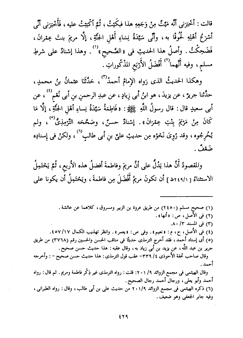 وَالْمَقْصُودُ أَنَّ هَذَا يَدُلُّ عَلَى أَنَّ مَرْيَمَ وَفَاطِمَةَ أَفْضَلُ هَذِهِ الْأَرْبَعِ، ثُمَّ يَحْتَمِلُ الِاسْتِثْنَاءُ أَنْ تَكُونَ مَرْيَمُ أَفْضَلَ مِنْ فَاطِمَةَ، وَيَحْتَمِلُ أَنْ يَكُونَا عَلَى