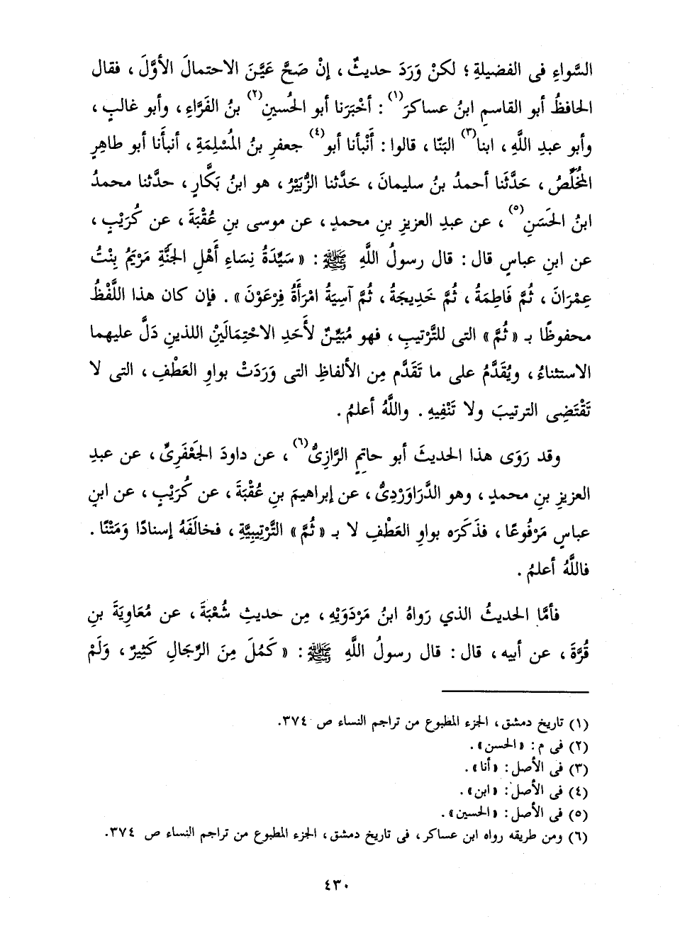 السَّوَاءِ فِي الْفَضِيلَةِ ; لَكِنْ وَرَدَ حَدِيثٌ، إِنْ صَحَّ عَيَّنَ الِاحْتِمَالَ الْأَوَّلَ، فَقَالَ الْحَافِظُ أَبُو الْقَاسِمِ ابْنُ عَسَاكِرَ: أَخْبَرَنَا أَبُو الْحَسَنِ بْنُ الْفَرَّاءِ، وَأَبُو غَالِبٍ وَأَبُو عَبْدِ اللَّهِ، ابْنَا الْبَنَّا، قَالُوا: أَنْبَأَنَا أَبُو جَعْفَرِ بْنُ الْمُسْلِمَةِ، أَنْبَأَنَا أَبُو طَاهِرٍ الْمُخَلِّصُ، حَدَّثَنَا أَحْمَدُ بْنُ سُلَيْمَانَ، حَدَّثَنَا الزُّبَيْرُ، هُوَ ابْنُ بَكَّارٍ، حَدَّثَنَا مُحَمَّدُ بْنُ الْحَسَنِ، عَنْ عَبْدِ الْعَزِيزِ بْنِ مُحَمَّدٍ، عَنْ مُوسَى بْنِ عُقْبَةَ عَنْ كُرَيْبٍ، عَنِ ابْنِ عَبَّاسٍ قَالَ: قَالَ رَسُولُ اللَّهِ صَلَّى اللَّهُ عَلَيْهِ وَسَلَّمَ: «سَيِّدَةُ نِسَاءِ أَهْلِ الْجَنَّةِ مَرْيَمُ بِنْتُ عِمْرَانَ، ثُمَّ فَاطِمَةُ، ثُمَّ خَدِيجَةُ، ثُمَّ آسِيَةُ امْرَأَةُ فِرْعَوْنَ» فَإِنْ كَانَ هَذَا اللَّفْظُ مَحْفُوظًا بِ " ثُمَّ " الَّتِي لِلتَّرْتِيبِ، فَهُوَ مُبَيِّنٌ لِأَحَدِ الِاحْتِمَالَيْنِ اللَّذَيْنِ دَلَّ عَلَيْهِمَا الِاسْتِثْنَاءُ، وَيُقَدَّمُ عَلَى مَا تَقَدَّمَ مِنَ الْأَلْفَاظِ الَّتِي وَرَدَتْ بِوَاوِ الْعَطْفِ، الَّتِي لَا تَقْتَضِي التَّرْتِيبَ وَلَا تَنْفِيهِ. وَاللَّهُ أَعْلَمُ.