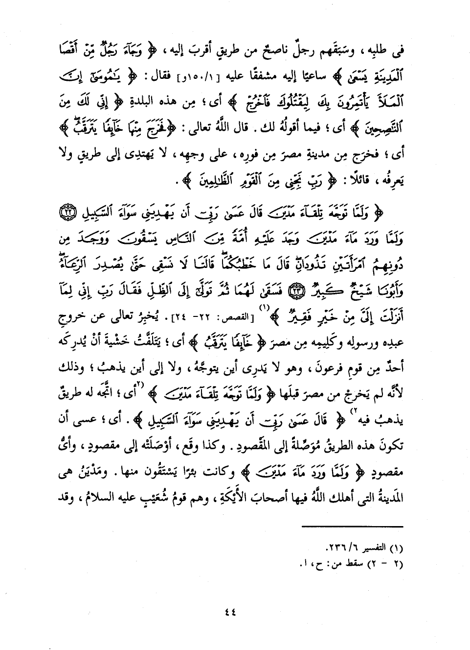 [الْقَصَصِ: 22 - 24] . يُخْبِرُ تَعَالَى عَنْ خُرُوجِ عَبْدِهِ وَرَسُولِهِ وَكَلِيمِهِ مِنْ مِصْرَ خَائِفًا يَتَرَقَّبُ أَيْ ; يَتَلَفَّتُ خَشْيَةَ أَنْ يُدْرِكَهُ أَحَدٌ مِنْ قَوْمِ فِرْعَوْنَ، وَهُوَ لَا يَدْرِي أَيْنَ يَتَوَجَّهُ، وَلَا إِلَى أَيْنَ يَذْهَبُ، وَذَلِكَ لِأَنَّهُ لَمْ يَخْرُجْ مِنْ مِصْرَ قَبْلَهَا وَلَمَّا تَوَجَّهَ تِلْقَاءَ مَدْيَنَ أَيْ ; اتَّجَهَ لَهُ طَرِيقٌ يَذْهَبُ فِيهِ {قَالَ عَسَى رَبِّي أَنْ يَهْدِيَنِي سَوَاءَ السَّبِيلِ} [القصص: 22] أَيْ ; عَسَى أَنْ تَكُونَ هَذِهِ الطَّرِيقُ مُوَصِّلَةً إِلَى الْمَقْصُودِ. وَكَذَا وَقَعَ، أَوْصَلَتْهُ إِلَى مَقْصُودٍ، وَأَيُّ مَقْصُودٍ {وَلَمَّا وَرَدَ مَاءَ مَدْيَنَ} [القصص: 23] وَكَانَتْ بِئْرًا يَسْتَقُونَ مِنْهَا. وَمَدْيَنُ هِيَ الْمَدِينَةُ الَّتِي أَهْلَكَ اللَّهُ فِيهَا أَصْحَابَ الْأَيْكَةِ، وَهُمْ قَوْمُ شُعَيْبٍ عَلَيْهِ السَّلَامُ، وَقَدْ