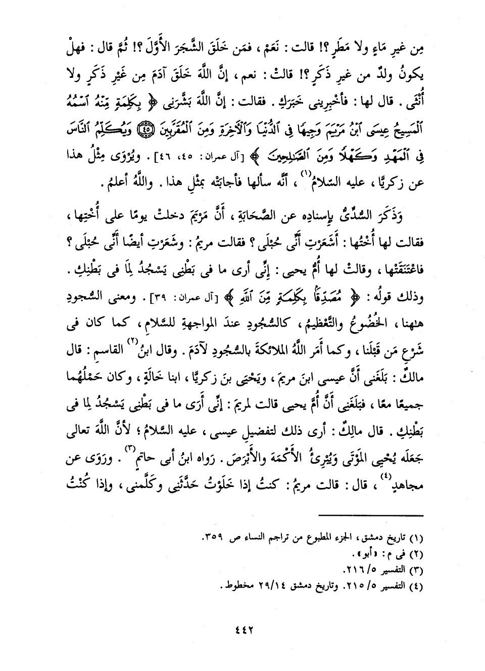 مِنْ غَيْرِ مَاءٍ وَلَا مَطَرٍ؟! قَالَتْ: نَعَمْ، فَمَنْ خَلَقَ الشَّجَرَ الْأَوَّلَ؟! ثُمَّ قَالَ: فَهَلْ يَكُونُ وَلَدٌ مِنْ غَيْرِ ذَكَرٍ؟! قَالَتْ: نَعَمْ، إِنَّ اللَّهَ خَلَقَ آدَمَ مِنْ غَيْرِ ذَكَرٍ وَلَا أُنْثَى. قَالَ لَهَا: فَأَخْبِرِينِي خَبَرَكِ. فَقَالَتْ: إِنَّ اللَّهَ بَشَّرَنِي {بِكَلِمَةٍ مِنْهُ اسْمُهُ الْمَسِيحُ عِيسَى ابْنُ مَرْيَمَ وَجِيهًا فِي الدُّنْيَا وَالْآخِرَةِ وَمِنَ الْمُقَرَّبِينَ وَيُكَلِّمُ النَّاسَ فِي الْمَهْدِ وَكَهْلًا وَمِنَ الصَّالِحِينَ} [آل عمران: 45]