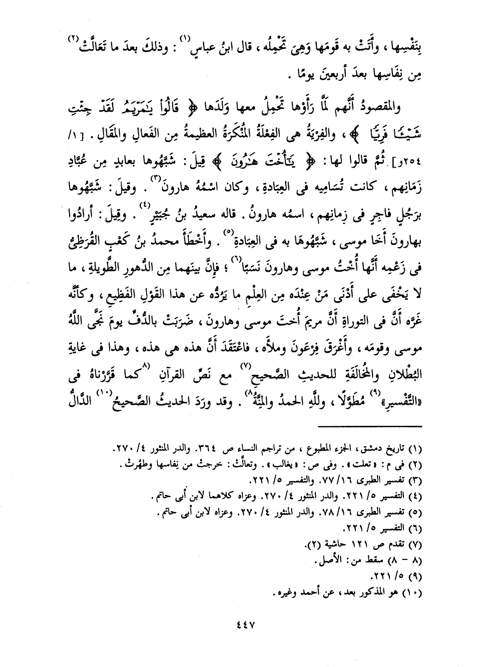 وَالْمَقْصُودُ أَنَّهُمْ لَمَّا رَأَوْهَا تَحْمِلُ مَعَهَا وَلَدَهَا {قَالُوا يَا مَرْيَمُ لَقَدْ جِئْتِ شَيْئًا فَرِيًّا} [مريم: 27] وَالْفِرْيَةُ هِيَ الْفِعْلَةُ الْمُنْكَرَةُ الْعَظِيمَةُ مِنَ الْفِعَالِ وَالْمَقَالِ. ثُمَّ قَالُوا لَهَا: {يَا أُخْتَ هَارُونَ} [مريم: 28] قِيلَ: شَبَّهُوهَا بِعَابِدٍ مِنْ عُبَّادِ زَمَانِهِمْ كَانَتْ تُسَامِيهِ فِي الْعِبَادَةِ، وَكَانَ اسْمُهُ هَارُونَ. وَقِيلَ: شَبَّهُوهَا بِرَجُلٍ فَاجِرٍ فِي زَمَانِهِمُ، اسْمُهُ هَارُونُ. قَالَهُ سَعِيدُ بْنُ جُبَيْرٍ. وَقِيلَ: أَرَادُوا بِهَارُونَ أَخَا مُوسَى شَبَّهُوهَا بِهِ فِي الْعِبَادَةِ. وَأَخْطَأَ مُحَمَّدُ بْنُ كَعْبٍ الْقُرَظِيُّ فِي زَعْمِهِ أَنَّهَا أُخْتُ مُوسَى وَهَارُونَ نَسَبًا ; فَإِنَّ بَيْنَهُمَا مِنَ الدُّهُورِ الطَّوِيلَةِ مَا لَا يَخْفَى عَلَى أَدْنَى مَنْ عِنْدَهُ مِنَ الْعِلْمِ مَا يَرُدُّهُ عَنْ هَذَا الْقَوْلِ الْفَظِيعِ، وَكَأَنَّهُ غَرَّهُ أَنَّ فِي التَّوْرَاةِ أَنَّ مَرْيَمَ أُخْتَ مُوسَى وَهَارُونَ ضَرَبَتْ بِالدُّفِّ يَوْمَ نَجَّى اللَّهُ مُوسَى وَقَوْمَهُ، وَأَغْرَقَ فِرْعَوْنَ وَمَلَأَهُ، فَاعْتَقَدَ أَنَّ هَذِهِ هِيَ هَذِهِ، وَهَذَا فِي غَايَةِ الْبُطْلَانِ وَالْمُخَالَفَةِ لِلْحَدِيثِ الصَّحِيحِ مَعَ نَصِّ الْقُرْآنِ كَمَا قَرَّرْنَاهُ فِي " التَّفْسِيرِ " مُطَوَّلًا، وَلِلَّهِ الْحَمْدُ وَالْمِنَّةُ. وَقَدْ وَرَدَ الْحَدِيثُ الصَّحِيحُ الدَّالُّ