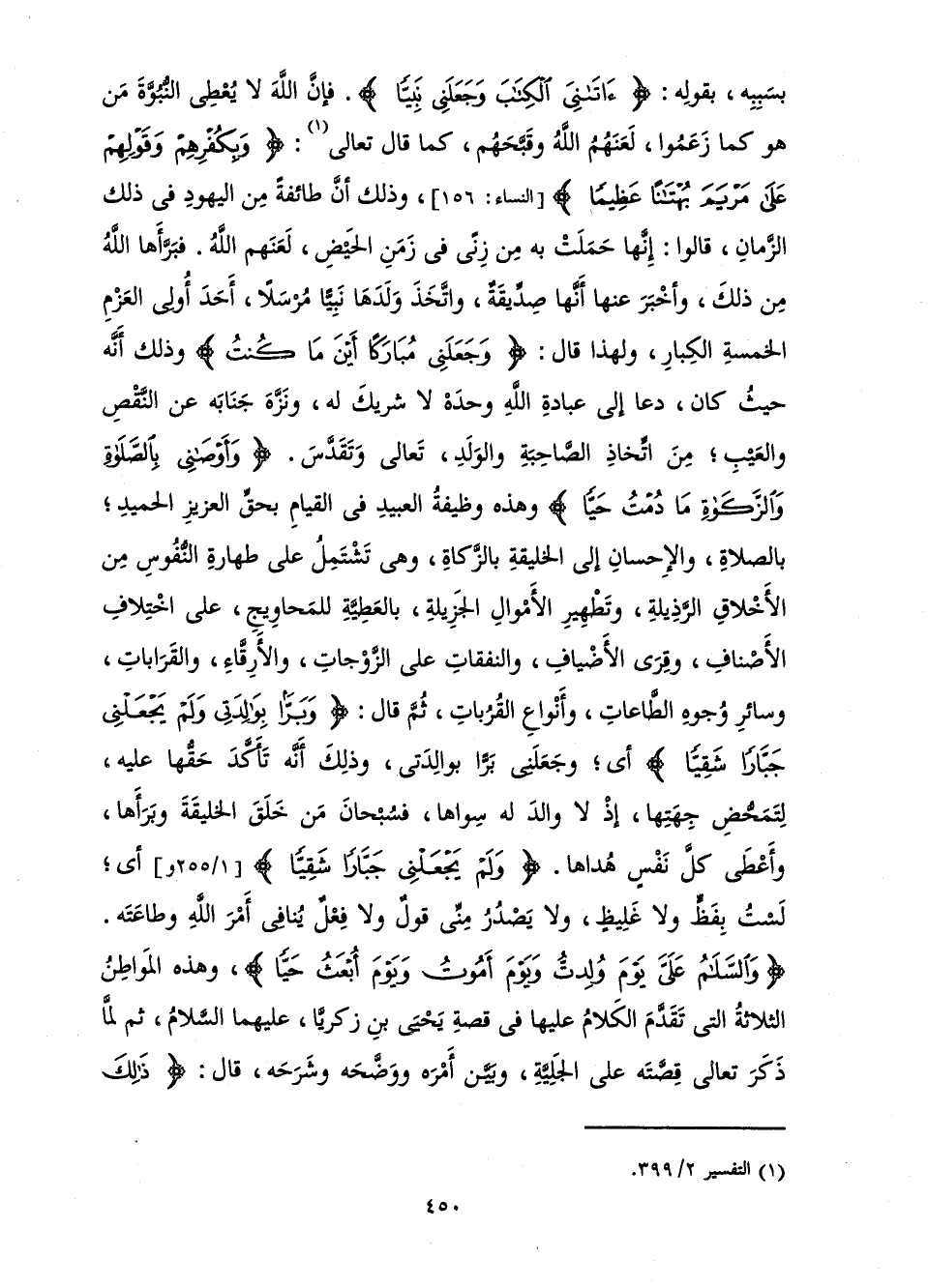 بِسَبَبِهِ بِقَوْلِهِ: {آتَانِيَ الْكِتَابَ وَجَعَلَنِي نَبِيًّا} [مريم: 30] فَإِنَّ اللَّهَ لَا يُعْطِي النُّبُوَّةَ مَنْ هُوَ كَمَا زَعَمُوا، لَعَنَهُمُ اللَّهُ وَقَبَّحَهُمْ، كَمَا قَالَ تَعَالَى: {وَبِكُفْرِهِمْ وَقَوْلِهِمْ عَلَى مَرْيَمَ بُهْتَانًا عَظِيمًا} [النساء: 156] . وَذَلِكَ أَنَّ طَائِفَةً مِنَ الْيَهُودِ فِي ذَلِكَ الزَّمَانِ قَالُوا: إِنَّهَا حَمَلَتْ بِهِ مِنْ زِنًا فِي زَمَنِ الْحَيْضِ، لَعَنَهُمُ اللَّهُ. فَبَرَّأَهَا اللَّهُ مِنْ ذَلِكَ، وَأَخْبَرَ عَنْهَا أَنَّهَا صِدِّيقَةٌ، وَاتَّخَذَ وَلَدَهَا نَبِيًّا مُرْسَلًا، أَحَدَ أُولِي الْعَزْمِ الْخَمْسَةِ الْكِبَارِ، وَلِهَذَا قَالَ: {وَجَعَلَنِي مُبَارَكًا أَيْنَ مَا كُنْتُ} [مريم: 31] وَذَلِكَ أَنَّهُ حَيْثُ كَانَ دَعَا إِلَى عِبَادَةِ اللَّهِ وَحْدَهُ لَا شَرِيكَ لَهُ، وَنَزَّهَ جَنَابَهُ عَنِ النَّقْصِ وَالْعَيْبِ ; مِنِ اتِّخَاذِ الصَّاحِبَةِ وَالْوَلَدِ، تَعَالَى وَتَقَدَّسَ. {وَأَوْصَانِي بِالصَّلَاةِ وَالزَّكَاةِ مَا دُمْتُ حَيًّا} [مريم: 31] وَهَذِهِ وَظِيفَةُ الْعَبِيدِ فِي الْقِيَامِ بِحَقِّ الْعَزِيزِ الْحَمِيدِ ; بِالصَّلَاةِ، وَالْإِحْسَانِ إِلَى الْخَلِيقَةِ بِالزَّكَاةِ، وَهِيَ تَشْتَمِلُ عَلَى طَهَارَةِ النُّفُوسِ مِنَ الْأَخْلَاقِ الرَّذِيلَةِ، وَتَطْهِيرِ الْأَمْوَالِ الْجَزِيلَةِ بِالْعَطِيَّةِ لِلْمَحَاوِيجِ، عَلَى اخْتِلَافِ الْأَصْنَافِ، وَقِرَى الْأَضْيَافِ، وَالنَّفَقَاتِ عَلَى الزَّوْجَاتِ، وَالْأَرِقَّاءِ، وَالْقَرَابَاتِ، وَسَائِرِ وُجُوهِ الطَّاعَاتِ وَأَنْوَاعِ الْقُرُبَاتِ، ثُمَّ قَالَ: {وَبَرًّا بِوَالِدَتِي وَلَمْ يَجْعَلْنِي جَبَّارًا شَقِيًّا} [مريم: 32] أَيْ: وَجَعَلَنِي بَرًّا بِوَالِدَتِي، وَذَلِكَ أَنَّهُ تَأَكَّدَ حَقُّهَا عَلَيْهِ، لِتَمَحُّضِ جِهَتِهَا، إِذْ لَا وَالِدَ لَهُ سِوَاهَا، فَسُبْحَانَ مَنْ خَلَقَ الْخَلِيقَةَ وَبَرَأَهَا، وَأَعْطَى كُلَّ نَفْسٍ هُدَاهَا. {وَلَمْ يَجْعَلْنِي جَبَّارًا شَقِيًّا} [مريم: 32] أَيْ: لَسْتُ بِفَظٍّ وَلَا غَلِيظٍ، وَلَا يَصْدُرُ مِنِّي قَوْلٌ وَلَا فِعْلٌ يُنَافِي أَمْرَ اللَّهِ وَطَاعَتَهُ. {وَالسَّلَامُ عَلَيَّ يَوْمَ وُلِدْتُ وَيَوْمَ أَمُوتُ وَيَوْمَ أُبْعَثُ حَيًّا} [مريم: 33] وَهَذِهِ الْمَوَاطِنُ الثَّلَاثَةُ الَّتِي تَقَدَّمَ الْكَلَامُ عَلَيْهَا فِي قِصَّةِ يَحْيَى بْنِ زَكَرِيَّا، عَلَيْهِمَا السَّلَامُ، ثُمَّ لَمَّا ذَكَرَ تَعَالَى قِصَّتَهُ عَلَى الْجَلِيَّةِ، وَبَيَّنَ أَمْرَهُ وَوَضَّحَهُ وَشَرَحَهُ، قَالَ: