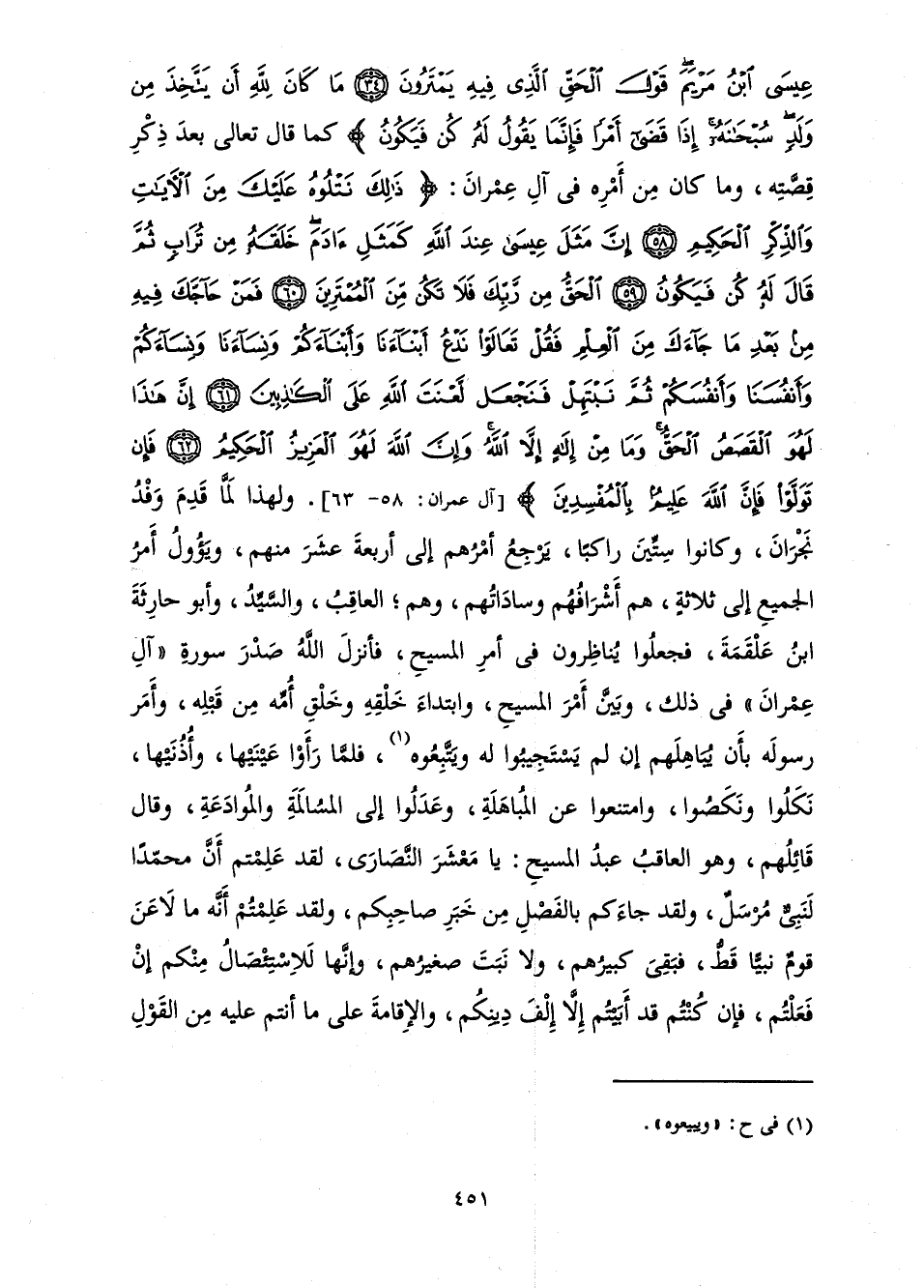 {ذَلِكَ عِيسَى ابْنُ مَرْيَمَ قَوْلَ الْحَقِّ الَّذِي فِيهِ يَمْتَرُونَ مَا كَانَ لِلَّهِ أَنْ يَتَّخِذَ مِنْ وَلَدٍ سُبْحَانَهُ إِذَا قَضَى أَمْرًا فَإِنَّمَا يَقُولُ لَهُ كُنْ فَيَكُونُ} [مريم: 34] كَمَا قَالَ تَعَالَى بَعْدَ ذِكْرِ قِصَّتِهِ، وَمَا كَانَ مِنْ أَمْرِهِ فِي آلِ عِمْرَانَ: {ذَلِكَ نَتْلُوهُ عَلَيْكَ مِنَ الْآيَاتِ وَالذِّكْرِ الْحَكِيمِ إِنَّ مَثَلَ عِيسَى عِنْدَ اللَّهِ كَمَثَلِ آدَمَ خَلَقَهُ مِنْ تُرَابٍ ثُمَّ قَالَ لَهُ كُنْ فَيَكُونُ الْحَقُّ مِنْ رَبِّكَ فَلَا تَكُنْ مِنَ الْمُمْتَرِينَ فَمَنْ حَاجَّكَ فِيهِ مِنْ بَعْدِ مَا جَاءَكَ مِنَ الْعِلْمِ فَقُلْ تَعَالَوْا نَدْعُ أَبْنَاءَنَا وَأَبْنَاءَكُمْ وَنِسَاءَنَا وَنِسَاءَكُمْ وَأَنْفُسَنَا وَأَنْفُسَكُمْ ثُمَّ نَبْتَهِلْ فَنَجْعَلْ لَعْنَةَ اللَّهِ عَلَى الْكَاذِبِينَ إِنَّ هَذَا لَهُوَ الْقَصَصُ الْحَقُّ وَمَا مِنْ إِلَهٍ إِلَّا اللَّهُ وَإِنَّ اللَّهَ لَهُوَ الْعَزِيزُ الْحَكِيمُ فَإِنْ تَوَلَّوْا فَإِنَّ اللَّهَ عَلِيمٌ بِالْمُفْسِدِينَ} [آل عمران: 58]