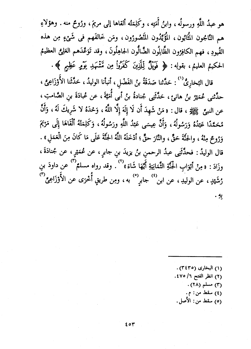 قَالَ الْبُخَارِيُّ: حَدَّثَنَا صَدَقَةُ بْنُ الْفَضْلِ، أَنْبَأَنَا الْوَلِيدُ، حَدَّثَنَا الْأَوْزَاعِيُّ، حَدَّثَنِي عُمَيْرُ بْنُ هَانِئٍ، حَدَّثَنِي جُنَادَةُ بْنُ أَبِي أُمَيَّةَ، عَنْ عُبَادَةَ بْنِ الصَّامِتِ، عَنِ النَّبِيِّ صَلَّى اللَّهُ عَلَيْهِ وَسَلَّمَ قَالَ: «مَنْ شَهِدَ أَنْ لَا إِلَهَ إِلَّا اللَّهُ، وَحْدَهُ لَا شَرِيكَ لَهُ، وَأَنَّ مُحَمَّدًا عَبْدُهُ وَرَسُولُهُ، وَأَنَّ عِيسَى عَبْدُ اللَّهِ وَرَسُولُهُ، وَكَلِمَتُهُ أَلْقَاهَا إِلَى مَرْيَمَ وَرُوحٌ مِنْهُ، وَالْجَنَّةَ حَقٌّ، وَالنَّارَ حَقٌّ - أَدْخَلَهُ اللَّهُ الْجَنَّةَ عَلَى مَا كَانَ مِنَ الْعَمَلِ» قَالَ الْوَلِيدُ: فَحَدَّثَنِي عَبْدُ الرَّحْمَنِ بْنُ يَزِيدَ بْنِ جَابِرٍ، عَنْ عُمَيْرٍ، عَنْ جُنَادَةَ، وَزَادَ: «مِنْ أَبْوَابِ الْجَنَّةِ الثَّمَانِيَةِ أَيَّهَا شَاءَ» وَقَدْ رَوَاهُ مُسْلِمٌ عَنْ دَاوُدَ بْنِ رَشِيدٍ عَنِ الْوَلِيدِ، عَنِ ابْنِ جَابِرٍ بِهِ، وَمِنْ طَرِيقٍ أُخْرَى عَنِ الْأَوْزَاعِيِّ بِهِ.
