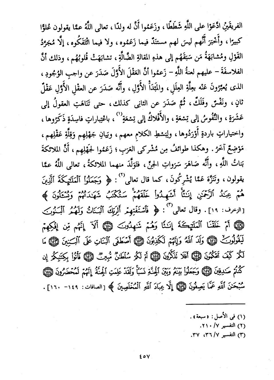 الْفَرِيقَيْنِ ادَّعَوْا عَلَى اللَّهِ شَطَطًا، وَزَعَمُوا أَنَّ لَهُ وَلَدًا، تَعَالَى اللَّهُ عَمَّا يَقُولُونَ عُلُوًّا كَبِيرًا، وَأَخْبَرَ أَنَّهُمْ لَيْسَ لَهُمْ مُسْتَنَدٌ فِيمَا زَعَمُوهُ، وَلَا فِيمَا ائْتَفَكُوهُ، إِلَّا مُجَرَّدُ الْقَوْلِ وَمُشَابَهَةُ مَنْ سَبَقَهُمْ إِلَى هَذِهِ الْمَقَالَةِ الضَّالَّةِ، تَشَابَهَتْ قُلُوبُهُمْ، وَذَلِكَ أَنَّ الْفَلَاسِفَةَ - عَلَيْهِمْ لَعْنَةُ اللَّهِ - زَعَمُوا أَنَّ الْعَقْلَ الْأَوَّلَ صَدَرَ عَنْ وَاجِبِ الْوُجُودِ، الَّذِي يُعَبِّرُونَ عَنْهُ بِعِلَّةِ الْعِلَلِ، وَالْمَبْدَأِ الْأَوَّلِ، وَأَنَّهُ صَدَرَ عَنِ الْعَقْلِ الْأَوَّلِ عَقْلٌ ثَانٍ، وَنَفْسٌ وَفَلَكٌ، ثُمَّ صَدَرَ عَنِ الثَّانِي كَذَلِكَ، حَتَّى تَنَاهَتِ الْعُقُولُ إِلَى عَشَرَةٍ، وَالنُّفُوسُ إِلَى تِسْعَةٍ، وَالْأَفْلَاكُ إِلَى تِسْعَةٍ، بِاعْتِبَارَاتٍ فَاسِدَةٍ ذَكَرُوهَا، وَاخْتِيَارَاتٍ بَارِدَةٍ أَوْرَدُوهَا، وَلِبَسْطِ الْكَلَامِ مَعَهُمْ، وَبَيَانِ جَهْلِهِمْ وَقِلَّةِ عَقْلِهِمْ، مَوْضِعٌ آخَرُ. وَهَكَذَا طَوَائِفُ مِنْ مُشْرِكِي الْعَرَبِ ; زَعَمُوا لِجَهْلِهِمْ أَنَّ الْمَلَائِكَةَ بَنَاتُ اللَّهِ، وَأَنَّهُ صَاهَرَ سَرَوَاتِ الْجِنِّ فَتَوَلَّدَ مِنْهُمَا الْمَلَائِكَةُ، تَعَالَى اللَّهُ عَمَّا يَقُولُونَ، وَتَنَزَّهَ عَمَّا يُشْرِكُونَ كَمَا قَالَ تَعَالَى: {وَجَعَلُوا الْمَلَائِكَةَ الَّذِينَ هُمْ عِبَادُ الرَّحْمَنِ إِنَاثًا أَشَهِدُوا خَلْقَهُمْ سَتُكْتَبُ شَهَادَتُهُمْ وَيُسْأَلُونَ} [الزخرف: 19] . وَقَالَ تَعَالَى: {فَاسْتَفْتِهِمْ أَلِرَبِّكَ الْبَنَاتُ وَلَهُمُ الْبَنُونَ أَمْ خَلَقْنَا الْمَلَائِكَةَ إِنَاثًا وَهُمْ شَاهِدُونَ أَلَا إِنَّهُمْ مِنْ إِفْكِهِمْ لَيَقُولُونَ وَلَدَ اللَّهُ وَإِنَّهُمْ لَكَاذِبُونَ أَصْطَفَى الْبَنَاتِ عَلَى الْبَنِينَ مَا لَكُمْ كَيْفَ تَحْكُمُونَ أَفَلَا تَذَكَّرُونَ أَمْ لَكُمْ سُلْطَانٌ مُبِينٌ فَأْتُوا بِكِتَابِكُمْ إِنْ كُنْتُمْ صَادِقِينَ وَجَعَلُوا بَيْنَهُ وَبَيْنَ الْجِنَّةِ نَسَبًا وَلَقَدْ عَلِمَتِ الْجِنَّةُ إِنَّهُمْ لَمُحْضَرُونَ سُبْحَانَ اللَّهِ عَمَّا يَصِفُونَ إِلَّا عِبَادَ اللَّهِ الْمُخْلَصِينَ} [الصافات: 149]
