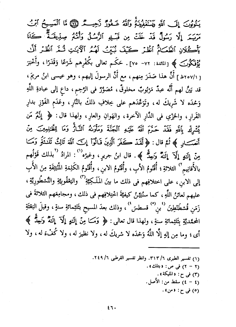 حَكَمَ تَعَالَى بِكُفْرِهِمْ شَرْعًا وَقَدَرًا، وَأَخْبَرَ أَنَّ هَذَا صَدَرَ مِنْهُمْ، مَعَ أَنَّ الرَّسُولَ إِلَيْهِمْ، وَهُوَ عِيسَى ابْنُ مَرْيَمَ، قَدْ بَيَّنَ لَهُمْ أَنَّهُ عَبْدٌ مَرْبُوبٌ مَخْلُوقٌ، مُصَوَّرٌ فِي الرَّحِمِ، دَاعٍ إِلَى عِبَادَةِ اللَّهِ وَحْدَهُ لَا شَرِيكَ لَهُ، وَتَوَعَّدَهُمْ عَلَى خِلَافِ ذَلِكَ بِالنَّارِ، وَعَدَمِ الْفَوْزِ بِدَارِ الْقَرَارِ، وَالْخِزْيِ فِي الدَّارِ الْآخِرَةِ، وَالْهَوَانِ وَالْعَارِ، وَلِهَذَا قَالَ: {إِنَّهُ مَنْ يُشْرِكْ بِاللَّهِ فَقَدْ حَرَّمَ اللَّهُ عَلَيْهِ الْجَنَّةَ وَمَأْوَاهُ النَّارُ وَمَا لِلظَّالِمِينَ مِنْ أَنْصَارٍ} [المائدة: 72] ثُمَّ قَالَ: {لَقَدْ كَفَرَ الَّذِينَ قَالُوا إِنَّ اللَّهَ ثَالِثُ ثَلَاثَةٍ وَمَا مِنْ إِلَهٍ إِلَّا إِلَهٌ وَاحِدٌ} [المائدة: 73] قَالَ ابْنُ جَرِيرٍ وَغَيْرُهُ: الْمُرَادُ بِذَلِكَ قَوْلُهُمْ بِالْأَقَانِيمِ الثَّلَاثَةِ: أُقْنُومُ الْأَبِ، وَأُقْنُومُ الِابْنِ، وَأُقْنُومُ الْكَلِمَةِ الْمُنْبَثِقَةِ مِنَ الْأَبِ إِلَى الِابْنِ، عَلَى اخْتِلَافِهِمْ فِي ذَلِكَ مَا بَيْنَ الْمَلَكِيَّةِ وَالْيَعْقُوبِيَّةِ وَالنَّسْطُورِيَّةِ، عَلَيْهِمْ لَعَائِنُ اللَّهِ، كَمَا سَنُبَيِّنُ كَيْفِيَّةَ اخْتِلَافِهِمْ فِي ذَلِكَ، وَمَجَامِعَهُمُ الثَّلَاثَةَ فِي زَمَنِ قُسْطَنْطِينَ بْنِ قَسْطَسَ، وَذَلِكَ بَعْدَ الْمَسِيحِ بِثَلَاثِمِائَةِ سَنَةٍ، وَقَبْلَ الْبَعْثَةِ الْمُحَمَّدِيَّةِ بِثَلَاثِمِائَةِ سَنَةٍ، وَلِهَذَا قَالَ تَعَالَى: {وَمَا مِنْ إِلَهٍ إِلَّا إِلَهٌ وَاحِدٌ} [المائدة: 73] أَيْ: وَمَا مِنْ إِلَهٍ إِلَّا اللَّهُ وَحْدَهُ لَا شَرِيكَ لَهُ، وَلَا نَظِيرَ لَهُ، وَلَا كُفْءَ لَهُ، وَلَا