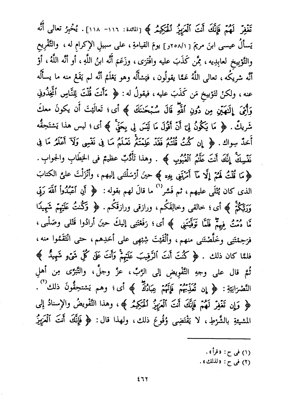 يُخْبِرُ تَعَالَى أَنَّهُ يَسْأَلُ عِيسَى ابْنَ مَرْيَمَ يَوْمَ الْقِيَامَةِ، عَلَى سَبِيلِ الْإِكْرَامِ لَهُ وَالتَّقْرِيعِ وَالتَّوْبِيخِ لِعَابِدِيهِ، مِمَّنْ كَذَبَ عَلَيْهِ وَافْتَرَى وَزَعَمَ أَنَّهُ ابْنُ اللَّهِ، أَوْ أَنَّهُ اللَّهُ، أَوْ أَنَّهُ شَرِيكُهُ، تَعَالَى اللَّهُ عَمَّا يَقُولُونَ، فَيَسْأَلُهُ وَهُوَ يَعْلَمُ أَنَّهُ لَمْ يَقَعْ مِنْهُ مَا يَسْأَلُهُ عَنْهُ، وَلَكِنْ لِتَوْبِيخِ مَنْ كَذَبَ عَلَيْهِ، فَيَقُولُ لَهُ: {ءَأَنْتَ قُلْتَ لِلنَّاسِ اتَّخِذُونِي وَأُمِّيَ إِلَهَيْنِ مِنْ دُونِ اللَّهِ قَالَ سُبْحَانَكَ} [المائدة: 116] أَيْ: تَعَالَيْتَ أَنْ يَكُونَ مَعَكَ شَرِيكٌ. {مَا يَكُونُ لِي أَنْ أَقُولَ مَا لَيْسَ لِي بِحَقٍّ} [المائدة: 116] أَيْ: لَيْسَ هَذَا يَسْتَحِقُّهُ أَحَدٌ سِوَاكَ. {إِنْ كُنْتُ قُلْتُهُ فَقَدْ عَلِمْتَهُ تَعْلَمُ مَا فِي نَفْسِي وَلَا أَعْلَمُ مَا فِي نَفْسِكَ إِنَّكَ أَنْتَ عَلَّامُ الْغُيُوبِ} [المائدة: 116] وَهَذَا تَأَدُّبٌ عَظِيمٌ فِي الْخِطَابِ وَالْجَوَابِ. {مَا قُلْتُ لَهُمْ إِلَّا مَا أَمَرْتَنِي بِهِ} [المائدة: 117] حِينَ أَرْسَلْتَنِي إِلَيْهِمْ، وَأَنْزَلْتَ عَلَيَّ الْكِتَابَ الَّذِي كَانَ يُتْلَى عَلَيْهِمْ، ثُمَّ فَسَّرَ مَا قَالَ لَهُمْ بِقَوْلِهِ: {أَنِ اعْبُدُوا اللَّهَ رَبِّي وَرَبَّكُمْ} [المائدة: 117] أَيْ خَالِقِي وَخَالِقُكُمْ، وَرَازِقِي وَرَازِقُكُمْ. {وَكُنْتُ عَلَيْهِمْ شَهِيدًا مَا دُمْتُ فِيهِمْ فَلَمَّا تَوَفَّيْتَنِي} [المائدة: 117] أَيْ: رَفَعْتَنِي إِلَيْكَ حِينَ أَرَادُوا قَتْلِي وَصَلْبِي، فَرَحِمْتَنِي وَخَلَّصْتَنِي مِنْهُمْ، وَأَلْقَيْتَ شَبَهِي عَلَى أَحَدِهِمْ، حَتَّى انْتَقَمُوا مِنْهُ، فَلَمَّا كَانَ ذَلِكَ. {كُنْتَ أَنْتَ الرَّقِيبَ عَلَيْهِمْ وَأَنْتَ عَلَى كُلِّ شَيْءٍ شَهِيدٌ} [المائدة: 117] ثُمَّ قَالَ عَلَى وَجْهِ التَّفْوِيضِ إِلَى الرَّبِّ، عَزَّ وَجَلَّ، وَالتَّبَرِّي مِنْ أَهْلِ النَّصْرَانِيَّةِ: {إِنْ تُعَذِّبْهُمْ فَإِنَّهُمْ عِبَادُكَ} [المائدة: 118] أَيْ: وَهُمْ يَسْتَحِقُّونَ ذَلِكَ. {وَإِنْ تَغْفِرْ لَهُمْ فَإِنَّكَ أَنْتَ الْعَزِيزُ الْحَكِيمُ} [المائدة: 118] ، وَهَذَا التَّفْوِيضُ وَالْإِسْنَادُ إِلَى الْمَشِيئَةِ بِالشَّرْطِ، لَا يَقْتَضِي وُقُوعَ ذَلِكَ، وَلِهَذَا قَالَ: {فَإِنَّكَ أَنْتَ الْعَزِيزُ الْحَكِيمُ} [المائدة: 118]