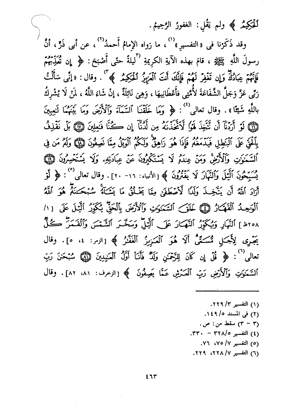 وَقَدْ ذَكَرْنَا فِي " التَّفْسِيرِ " مَا رَوَاهُ الْإِمَامُ أَحْمَدُ، عَنْ أَبِي ذَرٍّ، أَنَّ رَسُولَ اللَّهِ صَلَّى اللَّهُ عَلَيْهِ وَسَلَّمَ، قَامَ بِهَذِهِ الْآيَةِ الْكَرِيمَةِ لَيْلَةً حَتَّى أَصْبَحَ: {إِنْ تُعَذِّبْهُمْ فَإِنَّهُمْ عِبَادُكَ وَإِنْ تَغْفِرْ لَهُمْ فَإِنَّكَ أَنْتَ الْعَزِيزُ الْحَكِيمُ} [المائدة: 118] وَقَالَ: «إِنِّي سَأَلْتُ رَبِّي عَزَّ وَجَلَّ الشَّفَاعَةَ لِأُمَّتِي فَأَعْطَانِيهَا، وَهِيَ نَائِلَةٌ، إِنْ شَاءَ اللَّهُ، لِمَنْ لَا يُشْرِكُ بِاللَّهِ شَيْئًا» وَقَالَ تَعَالَى: {وَمَا خَلَقْنَا السَّمَاءَ وَالْأَرْضَ وَمَا بَيْنَهُمَا لَاعِبِينَ لَوْ أَرَدْنَا أَنْ نَتَّخِذَ لَهْوًا لَاتَّخَذْنَاهُ مِنْ لَدُنَّا إِنْ كُنَّا فَاعِلِينَ بَلْ نَقْذِفُ بِالْحَقِّ عَلَى الْبَاطِلِ فَيَدْمَغُهُ فَإِذَا هُوَ زَاهِقٌ وَلَكُمُ الْوَيْلُ مِمَّا تَصِفُونَ وَلَهُ مَنْ فِي السَّمَاوَاتِ وَالْأَرْضِ وَمَنْ عِنْدَهُ لَا يَسْتَكْبِرُونَ عَنْ عِبَادَتِهِ وَلَا يَسْتَحْسِرُونَ يُسَبِّحُونَ اللَّيْلَ وَالنَّهَارَ لَا يَفْتُرُونَ} [الأنبياء: 16]