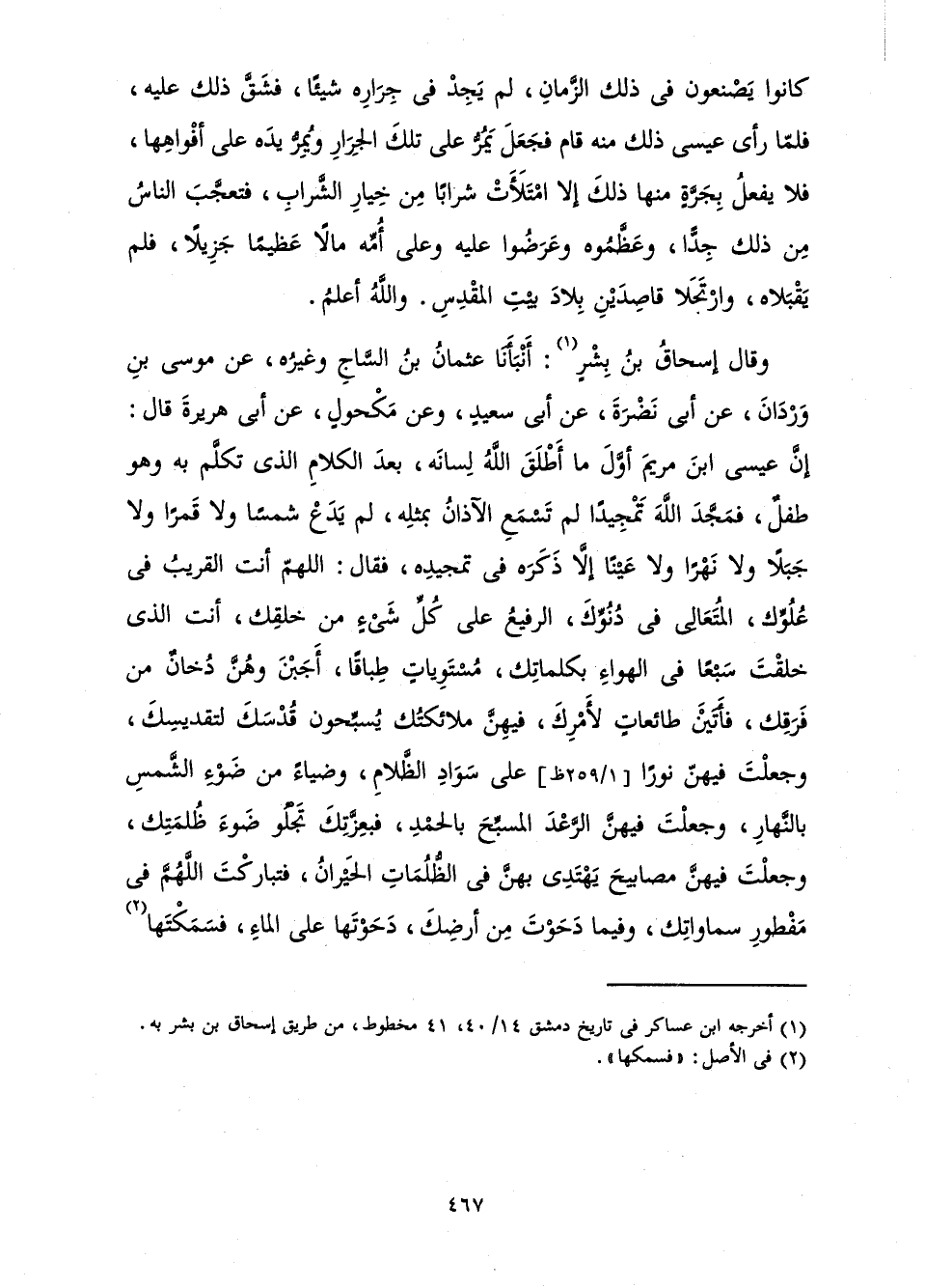 وَقَالَ إِسْحَاقُ بْنُ بِشْرٍ: أَنْبَأَنَا عُثْمَانُ بْنُ السَّاجِ وَغَيْرُهُ، عَنْ مُوسَى بْنِ وَرْدَانَ، عَنْ أَبِي نَضْرَةَ، عَنْ أَبِي سَعِيدٍ، وَعَنْ مَكْحُولٍ، عَنْ أَبِي هُرَيْرَةَ قَالَ: إِنَّ عِيسَى ابْنَ مَرْيَمَ أَوَّلَ مَا أَطْلَقَ اللَّهُ لِسَانَهُ، بَعْدَ الْكَلَامِ الَّذِي تَكَلَّمَ بِهِ وَهُوَ طِفْلٌ، فَمَجَّدَ اللَّهَ تَمْجِيدًا لَمْ تَسْمَعِ الْآذَانُ بِمِثْلِهِ، لَمْ يَدَعْ شَمْسًا وَلَا قَمَرًا وَلَا جَبَلًا وَلَا نَهْرًا وَلَا عَيْنًا إِلَّا ذَكَرَهُ فِي تَمْجِيدِهِ فَقَالَ: اللَّهُمَّ أَنْتَ الْقَرِيبُ فِي عُلُوِّكَ، الْمُتَعَالِي فِي دُنُوِّكَ، الرَّفِيعُ عَلَى كُلِّ شَيْءٍ مِنْ خَلْقِكَ، أَنْتَ الَّذِي خَلَقْتَ سَبْعًا فِي الْهَوَاءِ بِكَلِمَاتِكَ، مُسْتَوِيَاتٍ طِبَاقًا، أَجَبْنَ وَهُنَّ دُخَانٌ مِنْ فَرَقِكَ، فَأَتَيْنَ طَائِعَاتٍ لِأَمْرِكَ، فِيهِنَّ مَلَائِكَتُكَ يُسَبِّحُونَ قُدْسَكَ لِتَقْدِيسِكَ، وَجَعَلْتَ فِيهِنَّ نُورًا عَلَى سَوَادِ الظَّلَامِ، وَضِيَاءً مِنْ ضَوْءِ الشَّمْسِ بِالنَّهَارِ، وَجَعَلْتَ فِيهِنَّ الرَّعْدَ الْمُسَبِّحَ بِالْحَمْدِ، فَبِعِزَّتِكَ تَجْلُو ضَوْءَ ظُلْمَتِكَ، وَجَعَلْتَ فِيهِنَّ مَصَابِيحَ يَهْتَدِي بِهِنَّ فِي الظُّلُمَاتِ الْحَيْرَانُ، فَتَبَارَكْتَ اللَّهُمَّ فِي مَفْطُورَ سَمَاوَاتِكَ، وَفِيمَا دَحَوْتَ مِنْ أَرْضِكَ، دَحَوْتَهَا عَلَى الْمَاءِ، فَسَمَكْتَهَا