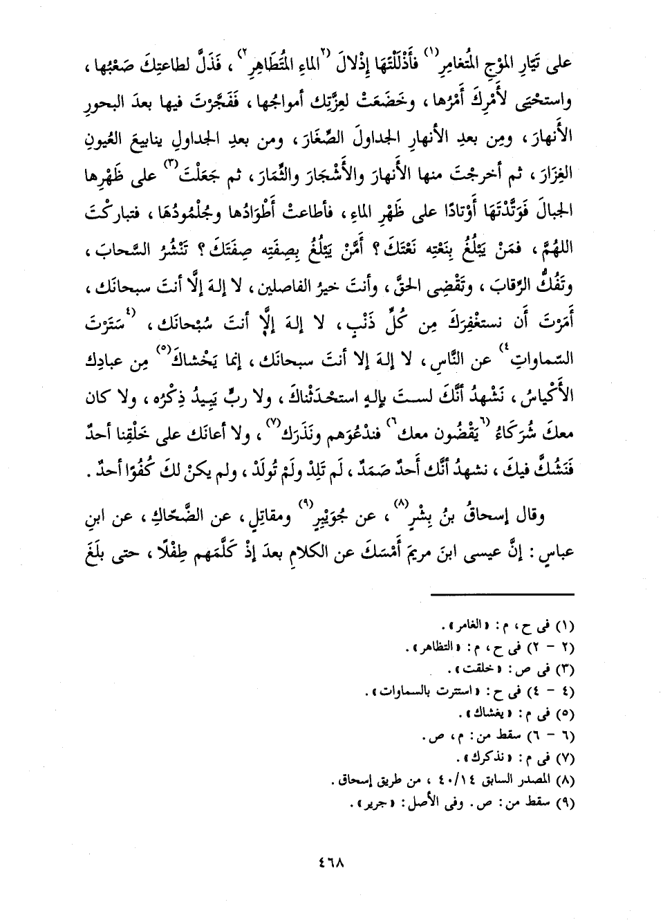 عَلَى تَيَّارِ الْمَوْجِ الْمُتَغَامِرِ، فَأَذْلَلْتَهَا إِذْلَالَ الْمَاءِ الْمُتَطَاهِرِ، فَذَلَّ لِطَاعَتِكَ صَعْبُهَا، وَاسْتَحْيَى لِأَمْرِكَ أَمْرُهَا، وَخَضَعَتْ لِعِزَّتِكَ أَمْوَاجُهَا، فَفَجَّرْتَ فِيهَا بَعْدَ الْبُحُورِ الْأَنْهَارَ، وَمِنْ بَعْدِ الْأَنْهَارِ الْجَدَاوِلَ الصِّغَارَ، وَمِنْ بَعْدِ الْجَدَاوِلِ يَنَابِيعَ الْعُيُونِ الْغِزَارَ ثُمَّ أَخْرَجْتَ مِنْهَا الْأَنْهَارَ وَالْأَشْجَارَ وَالثِّمَارَ، ثُمَّ جَعَلْتَ عَلَى ظَهْرِهَا الْجِبَالَ فَوَتَّدْتَهَا أَوْتَادًا عَلَى ظَهْرِ الْمَاءِ، فَأَطَاعَتْ أَطْوَادُهَا وَجُلْمُودُهَا، فَتَبَارَكْتَ اللَّهُمَّ، فَمَنْ يَبْلُغُ بِنَعْتِهِ نَعْتَكَ؟ أَمَّنْ يَبْلُغُ بِصِفَتِهِ صِفَتَكَ؟ تَنْشُرُ السَّحَابَ، وَتَفُكُّ الرِّقَابَ وَتَقْضِي الْحَقَّ، وَأَنْتَ خَيْرُ الْفَاصِلِينَ، لَا إِلَهَ إِلَّا أَنْتَ سُبْحَانَكَ، أَمَرْتَ أَنْ نَسْتَغْفِرَكَ مِنْ كُلِّ ذَنْبٍ، لَا إِلَهَ إِلَّا أَنْتَ سُبْحَانَكَ، سَتَرْتَ السَّمَاوَاتِ عَنِ النَّاسِ، لَا إِلَهَ إِلَّا أَنْتَ سُبْحَانَكَ، إِنَّمَا يَخْشَاكَ مِنْ عِبَادِكَ الْأَكْيَاسُ، نَشْهَدُ أَنَّكَ لَسْتَ بِإِلَهٍ اسْتَحْدَثْنَاكَ، وَلَا رَبٍّ يَبِيدُ ذِكْرُهُ، وَلَا كَانَ مَعَكَ شُرَكَاءُ يَقْضُونَ مَعَكَ فَنَدْعُوَهُمْ وَنَذَرَكُ، وَلَا أَعَانَكَ عَلَى خَلْقِنَا أَحَدٌ فَنَشُكَّ فِيكَ، نَشْهَدُ أَنَّكَ أَحَدٌ صَمَدٌ، لَمْ تَلِدْ وَلَمْ تُولَدْ، وَلَمْ يَكُنْ لَكَ كُفُوًا أَحَدٌ.