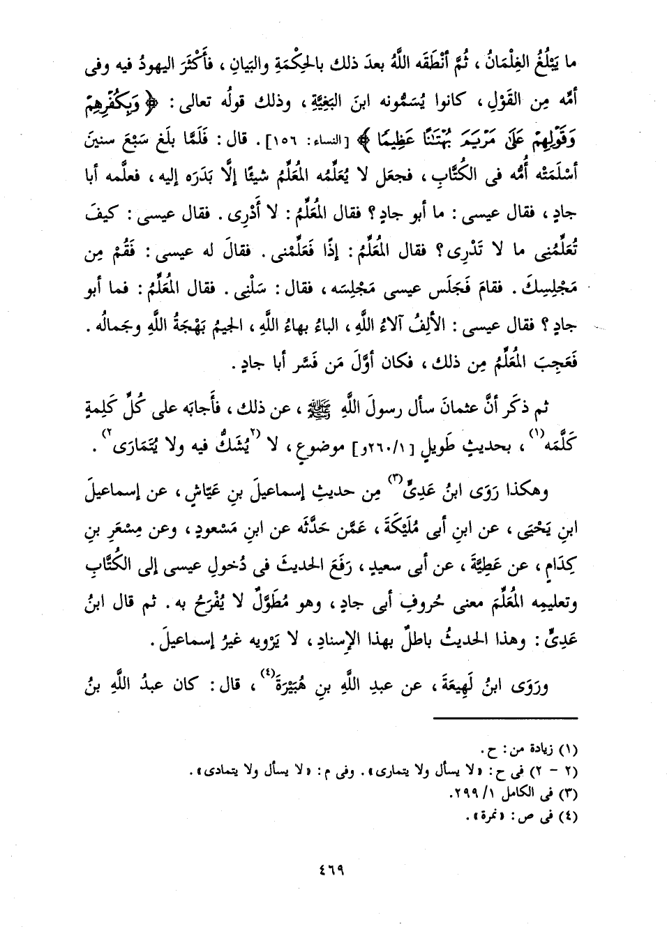 وَهَكَذَا رَوَى ابْنُ عَدِيٍّ مِنْ حَدِيثِ إِسْمَاعِيلَ بْنِ عَيَّاشٍ، عَنْ إِسْمَاعِيلَ بْنِ يَحْيَى، عَنِ ابْنِ مُلَيْكَةَ، عَمَّنْ حَدَّثَهُ، عَنِ ابْنِ مَسْعُودٍ، وَعَنْ مِسْعَرِ بْنِ كِدَامٍ، عَنْ عَطِيَّةَ، عَنْ أَبِي سَعِيدٍ، رَفَعَ الْحَدِيثَ فِي دُخُولِ عِيسَى إِلَى الْكُتَّابِ وَتَعْلِيمِهِ الْمُعَلِّمَ مَعْنَى حُرُوفِ أَبِي جَادٍ، وَهُوَ مُطَوَّلٌ لَا يُفْرَحُ بِهِ. ثُمَّ قَالَ ابْنُ عَدِيٍّ وَهَذَا الْحَدِيثُ بَاطِلٌ بِهَذَا الْإِسْنَادِ، لَا يَرْوِيهِ غَيْرُ إِسْمَاعِيلَ.
