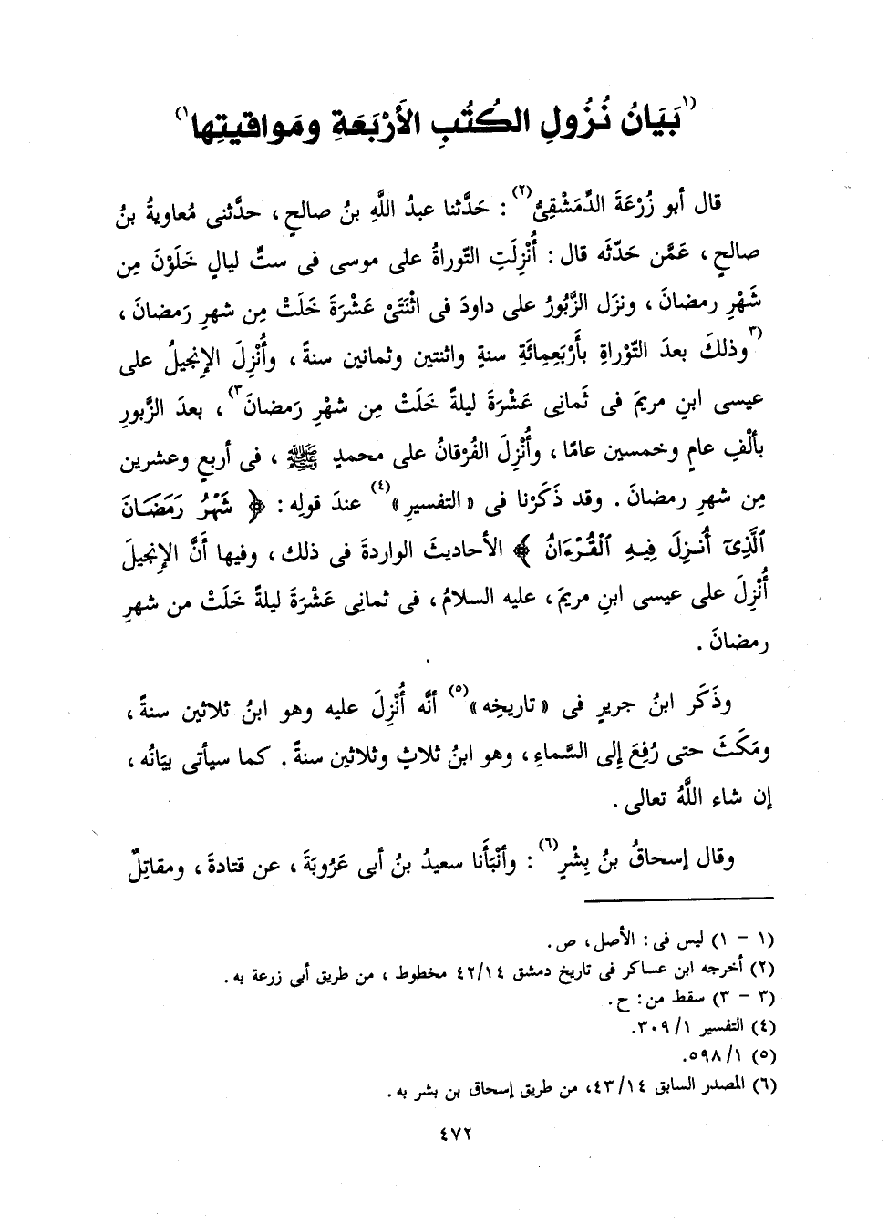 قَالَ أَبُو زُرْعَةَ الدِّمَشْقِيُّ: حَدَّثَنَا عَبْدُ اللَّهِ بْنُ صَالِحٍ، حَدَّثَنِي مُعَاوِيَةُ بْنُ صَالِحٍ، عَمَّنْ حَدَّثَهُ قَالَ: أُنْزِلَتِ التَّوْرَاةُ عَلَى مُوسَى فِي سِتِّ لَيَالٍ خَلَوْنَ مِنْ شَهْرِ رَمَضَانَ، وَنَزَلَ الزَّبُورُ عَلَى دَاوُدَ فِي اثْنَتَيْ عَشْرَ لَيْلَةً خَلَتْ مِنْ شَهْرِ رَمَضَانَ، وَذَلِكَ بَعْدَ التَّوْرَاةِ بِأَرْبَعِمِائَةِ سَنَةٍ وَاثْنَتَيْنِ وَثَمَانِينَ سَنَةً، وَأُنْزِلَ الْإِنْجِيلُ عَلَى عِيسَى ابْنِ مَرْيَمَ فِي ثَمَانِي عَشْرَةَ لَيْلَةً خَلَتْ مِنْ شَهْرِ رَمَضَانَ، بَعْدَ الزَّبُورِ بِأَلْفِ عَامٍ وَخَمْسِينَ عَامًا، وَأُنْزِلَ الْفَرْقَانُ عَلَى مُحَمَّدٍ صَلَّى اللَّهُ عَلَيْهِ وَسَلَّمَ، فِي أَرْبَعٍ وَعِشْرِينَ مِنْ شَهْرِ رَمَضَانَ. وَقَدْ ذَكَرْنَا فِي " التَّفْسِيرِ " عِنْدَ قَوْلِهِ: {شَهْرُ رَمَضَانَ الَّذِي أُنْزِلَ فِيهِ الْقُرْآنُ} [البقرة: 185] الْأَحَادِيثَ الْوَارِدَةَ فِي ذَلِكَ، وَفِيهَا أَنَّ الْإِنْجِيلَ أُنْزِلَ عَلَى عِيسَى ابْنِ مَرْيَمَ، عَلَيْهِ السَّلَامُ، فِي ثَمَانِي عَشْرَةَ لَيْلَةً خَلَتْ مِنْ شَهْرِ رَمَضَانَ.