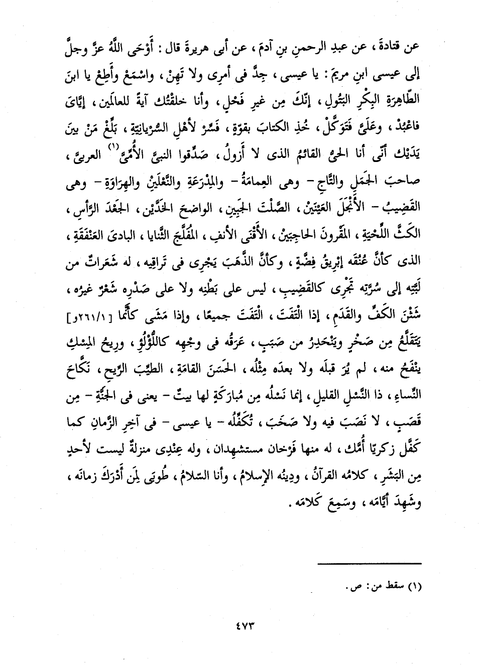 عَنْ قَتَادَةَ، عَنْ عَبْدِ الرَّحْمَنِ بْنِ آدَمَ، عَنْ أَبِي هُرَيْرَةَ قَالَ: أَوْحَى اللَّهُ عَزَّ وَجَلَّ إِلَى عِيسَى ابْنِ مَرْيَمَ: يَا عِيسَى جِدَّ فِي أَمْرِي وَلَا تَهِنْ، وَاسْمَعْ وَأَطِعْ يَا ابْنَ الطَّاهِرَةِ الْبِكْرِ الْبَتُولِ، إِنَّكَ مِنْ غَيْرِ فَحْلٍ وَأَنَا خَلَقْتُكَ آيَةً لِلْعَالَمِينَ، إِيَّايَ فَاعْبُدْ وَعَلَيَّ فَتَوَكَّلْ، خُذِ الْكِتَابَ بِقُوَّةٍ، فَسِّرْ لِأَهْلِ السُّرْيَانِيَّةِ، بَلِّغْ مَنْ بَيْنَ يَدَيْكَ أَنِّي أَنَا الْحَيُّ الْقَائِمُ الَّذِي لَا أَزُولُ، صَدِّقُوا النَّبِيَّ الْأُمِّيَّ الْعَرَبِيَّ، صَاحِبَ الْجَمَلِ وَالتَّاجِ - وَهِيَ الْعِمَامَةُ - وَالْمِدْرَعَةِ وَالنَّعْلَيْنِ وَالْهِرَاوَةِ - وَهِيَ الْقَضِيبُ - الْأَنْجَلَ الْعَيْنَيْنِ، الصَّلْتَ الْجَبِينِ، الْوَاضِحَ الْخَدَّيْنِ، الْجَعْدَ الرَّأْسِ، الْكَثَّ اللِّحْيَةِ، الْمَقْرُونَ الْحَاجِبَيْنِ، الْأَقْنَى الْأَنْفِ، الْمُفَلَّجَ الثَّنَايَا، الْبَادِيَ الْعَنْفَقَةِ، الَّذِي كَأَنَّ عُنُقَهُ إِبْرِيقُ فِضَّةٍ، وَكَأَنَّ الذَّهَبَ يَجْرِي فِي تَرَاقِيهِ، لَهُ شَعَرَاتٌ مِنْ لَبَّتِهِ إِلَى سُرَّتِهِ تَجْرِي كَالْقَضِيبِ، لَيْسَ عَلَى بَطْنِهِ وَلَا عَلَى صَدْرِهِ شَعْرٌ غَيْرُهُ، شَثْنَ الْكَفِّ وَالْقَدَمِ، إِذَا الْتَفَتَ الْتَفَتَ جَمِيعًا، وَإِذَا مَشَى كَأَنَّمَا يَتَقَلَّعُ مِنْ صَخْرٍ وَيَنْحَدِرُ مِنْ صَبَبٍ، عَرَقُهُ فِي وَجْهِهِ كَاللُّؤْلُؤِ، وَرِيحُ الْمِسْكِ يَنْفَحُ مِنْهُ، لَمْ يُرَ قَبْلَهُ وَلَا بَعْدَهُ مِثْلُهُ، الْحَسَنَ الْقَامَةِ، الطَّيِّبَ الرِّيحِ، نَكَّاحَ النِّسَاءِ، ذَا النَّسْلِ الْقَلِيلِ، إِنَّمَا نَسْلُهُ مِنْ مُبَارَكَةٍ لَهَا بَيْتٌ - يَعْنِي فِي الْجَنَّةِ - مِنْ قَصَبٍ، لَا نَصَبَ فِيهِ وَلَا صَخَبَ، تُكَفِّلُهُ - يَا عِيسَى - فِي آخِرِ الزَّمَانِ كَمَا كَفَّلَ زَكَرِيَّا أُمَّكَ، لَهُ مِنْهَا فَرْخَانِ مُسْتَشْهَدَانِ، وَلَهُ عِنْدِي مَنْزِلَةٌ لَيْسَتْ لِأَحَدٍ مِنَ الْبَشَرِ، كَلَامُهُ الْقُرْآنُ، وَدِينُهُ الْإِسْلَامُ، وَأَنَا السَّلَامُ، طُوبَى لِمَنْ أَدْرَكَ زَمَانَهُ، وَشَهِدَ أَيَّامَهُ، وَسَمِعَ كَلَامَهُ.