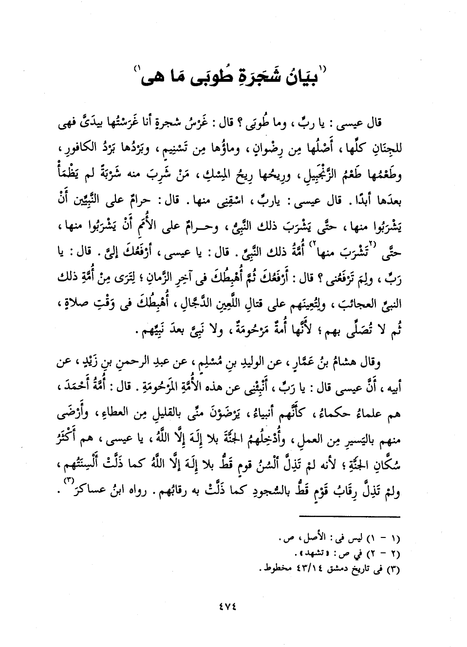 قَالَ عِيسَى: يَا رَبِّ، وَمَا طُوبَى؟ قَالَ: غَرْسُ شَجَرَةٍ أَنَا غَرَسْتُهَا بِيَدِي فَهِيَ لِلْجِنَانِ كُلِّهَا، أَصْلُهَا مِنْ رِضْوَانٍ، وَمَاؤُهَا مِنْ تَسْنِيمٍ، وَبَرْدُهَا بَرْدُ الْكَافُورِ، وَطَعْمُهَا طَعْمُ الزَّنْجَبِيلِ، وَرِيحُهَا رِيحُ الْمِسْكِ، مَنْ شَرِبَ مِنْهُ شَرْبَةً لَمْ يَظْمَأْ بَعْدَهَا أَبَدًا. قَالَ عِيسَى: يَا رَبِّ، اسْقِنِي مِنْهَا. قَالَ: حَرَامٌ عَلَى النَّبِيِّينَ أَنْ يَشْرَبُوا مِنْهَا، حَتَّى يَشْرَبَ ذَلِكَ النَّبِيُّ، وَحَرَامٌ عَلَى الْأُمَمِ أَنْ يَشْرَبُوا مِنْهَا، حَتَّى تَشْرَبَ مِنْهَا أُمَّةُ ذَلِكَ النَّبِيِّ. قَالَ: يَا عِيسَى، أَرْفَعُكَ إِلَيَّ. قَالَ: يَا رَبِّ، وَلِمَ تَرْفَعُنِي؟ قَالَ: أَرْفَعُكَ ثُمَّ أُهْبِطُكَ فِي آخِرِ الزَّمَانِ ; لِتَرَى مِنْ أُمَّةِ ذَلِكَ النَّبِيِّ الْعَجَائِبَ، وَلِتُعِينَهُمْ عَلَى قِتَالِ اللَّعِينِ الدَّجَّالِ، أُهْبِطُكَ فِي وَقْتِ صَلَاةٍ، ثُمَّ لَا تُصَلِّي بِهِمْ ; لِأَنَّهَا أُمَّةٌ مَرْحُومَةٌ، وَلَا نَبِيَّ بَعْدَ نَبِيِّهِمْ.