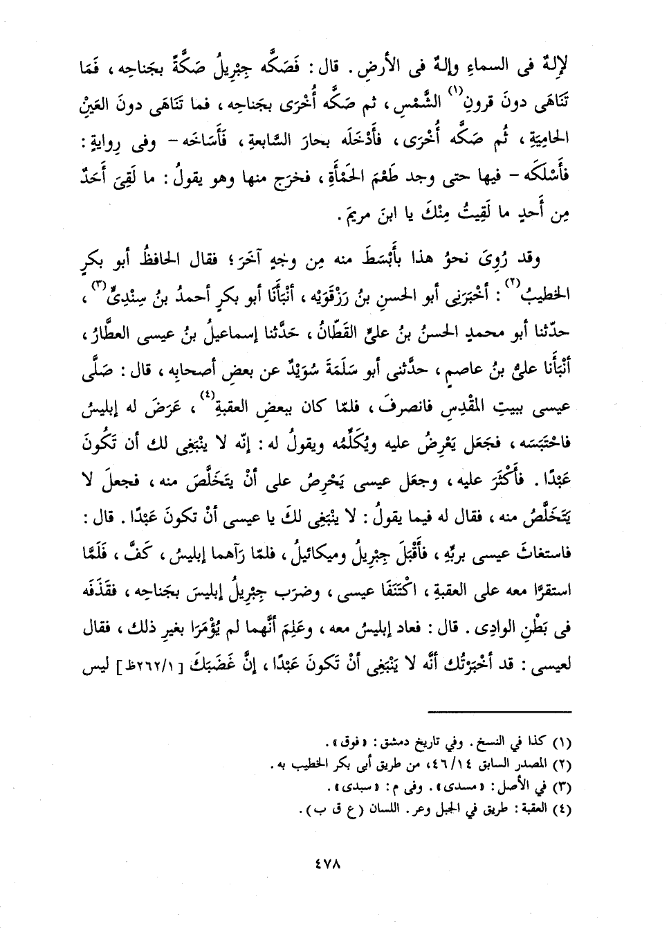 وَقَدْ رُوِيَ نَحْوُ هَذَا بِأَبْسَطَ مِنْهُ مِنْ وَجْهٍ آخَرَ ; فَقَالَ الْحَافِظُ أَبُو بَكْرٍ الْخَطِيبُ: أَخْبَرَنِي أَبُو الْحَسَنِ بْنُ رَزْقَوَيْهِ، أَنْبَأَنَا أَبُو بَكْرٍ أَحْمَدُ بْنُ سِنْدِيٍّ، حَدَّثَنَا أَبُو مُحَمَّدٍ الْحَسَنُ بْنُ عَلِيٍّ الْقَطَّانُ، حَدَّثَنَا إِسْمَاعِيلُ بْنُ عِيسَى الْعَطَّارُ، أَنْبَأَنَا عَلِيُّ بْنُ عَاصِمٍ، حَدَّثَنِي أَبُو سَلَمَةَ سُوَيْدٌ، عَنْ بَعْضِ أَصْحَابِهِ، قَالَ: صَلَّى عِيسَى بِبَيْتِ الْمَقْدِسِ فَانْصَرَفَ، فَلَمَّا كَانَ بِبَعْضِ الْعَقَبَةِ، عَرَضَ لَهُ إِبْلِيسُ فَاحْتَبَسَهُ، فَجَعَلَ يَعْرِضُ عَلَيْهِ وَيُكَلِّمُهُ وَيَقُولُ لَهُ: إِنَّهُ لَا يَنْبَغِي لَكَ أَنْ تَكُونَ عَبْدًا. فَأَكْثَرَ عَلَيْهِ، وَجَعَلَ عِيسَى يَحْرِصُ عَلَى أَنْ يَتَخَلَّصَ مِنْهُ، فَجَعَلَ لَا يَتَخَلَّصُ مِنْهُ، فَقَالَ لَهُ فِيمَا يَقُولُ: لَا يَنْبَغِي لَكَ يَا عِيسَى أَنْ تَكُونَ عَبْدًا. قَالَ: فَاسْتَغَاثَ عِيسَى بِرَبِّهِ، فَأَقْبَلَ جِبْرِيلُ وَمِيكَائِيلُ، فَلَمَّا رَآهُمَا إِبْلِيسُ كَفَّ، فَلَمَّا اسْتَقَرَّا مَعَهُ عَلَى الْعَقَبَةِ، اكْتَنَفَا عِيسَى، وَضَرَبَ جِبْرِيلُ إِبْلِيسَ بِجَنَاحِهِ، فَقَذَفَهُ فِي بَطْنِ الْوَادِي. قَالَ: فَعَادَ إِبْلِيسُ مَعَهُ، وَعَلِمَ أَنَّهُمَا لَمْ يُؤْمَرَا بِغَيْرِ ذَلِكَ، فَقَالَ لِعِيسَى: قَدْ أَخْبَرْتُكَ أَنَّهُ لَا يَنْبَغِي أَنْ تَكُونَ عَبْدًا، إِنَّ غَضَبَكَ لَيْسَ
