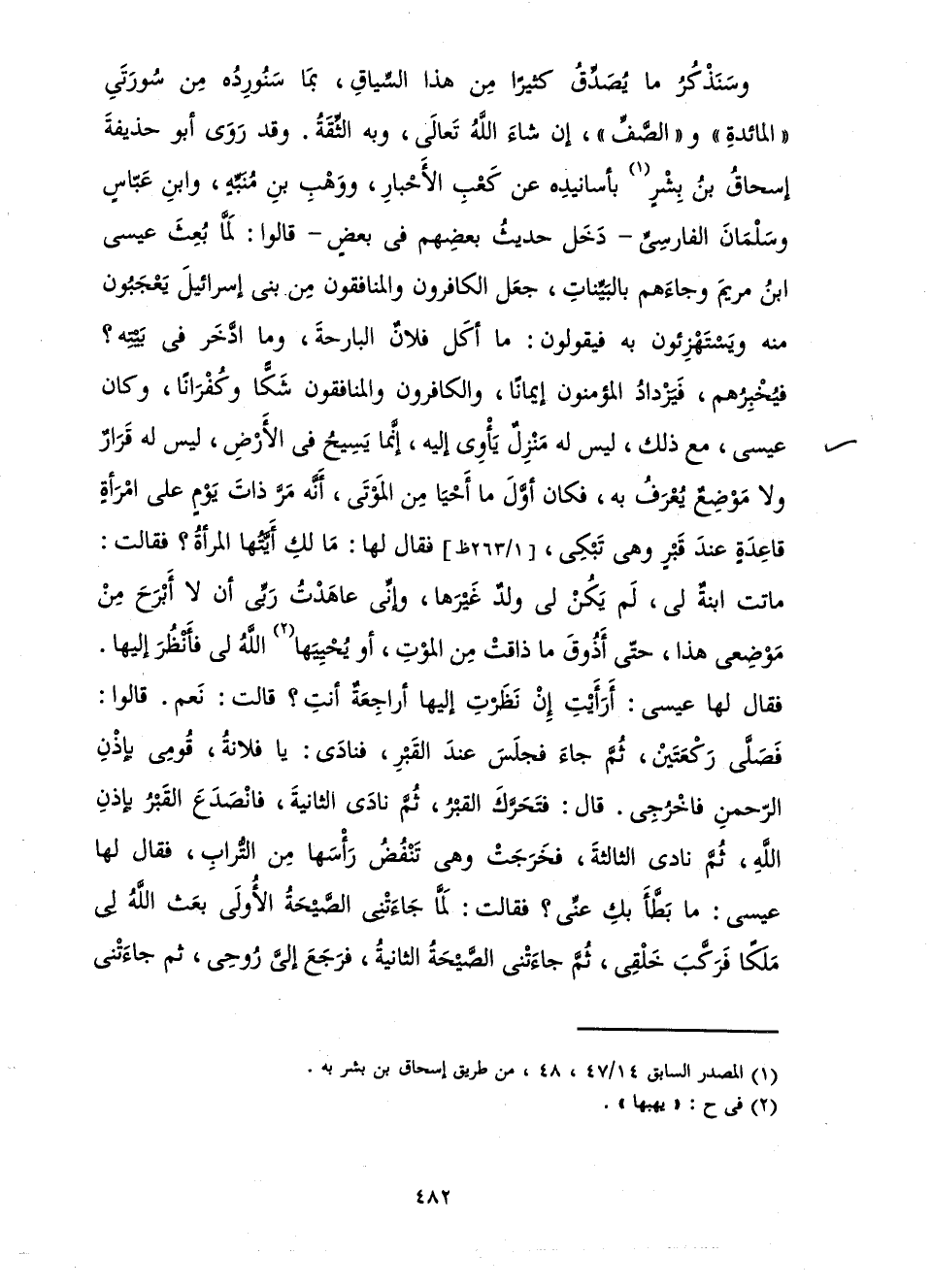 وَسَنَذْكُرُ مَا يُصَدِّقُ كَثِيرًا مِنْ هَذَا السِّيَاقِ، بِمَا سَنُورِدُهُ مِنْ سُورَتَيْ " الْمَائِدَةِ " وَ " الصَّفِّ "، إِنْ شَاءَ اللَّهُ تَعَالَى، وَبِهِ الثِّقَةُ. وَقَدْ رَوَى أَبُو حُذَيْفَةَ إِسْحَاقُ بْنُ بِشْرٍ بِأَسَانِيدِهِ، عَنْ كَعْبِ الْأَحْبَارِ، وَوَهْبِ بْنِ مُنَبِّهٍ، وَابْنِ عَبَّاسٍ، وَسَلْمَانَ الْفَارِسِيِّ - دَخَلَ حَدِيثُ بَعْضِهِمْ فِي بَعْضٍ - قَالُوا: لَمَّا بُعِثَ عِيسَى ابْنُ مَرْيَمَ وَجَاءَهُمْ بِالْبَيِّنَاتِ، جَعَلَ الْكَافِرُونَ وَالْمُنَافِقُونَ مِنْ بَنِي إِسْرَائِيلَ يَعْجَبُونَ مِنْهُ وَيَسْتَهْزِئُونَ بِهِ فَيَقُولُونَ: مَا أَكَلَ فُلَانٌ الْبَارِحَةَ، وَمَا ادَّخَرَ فِي بَيْتِهِ؟ فَيُخْبِرُهُمْ، فَيَزْدَادُ الْمُؤْمِنُونَ إِيمَانًا، وَالْكَافِرُونَ وَالْمُنَافِقُونَ شَكًّا وَكُفْرَانًا، وَكَانَ عِيسَى، مَعَ ذَلِكَ، لَيْسَ لَهُ مَنْزِلٌ يَأْوِي إِلَيْهِ، إِنَّمَا يَسِيحُ فِي الْأَرْضِ لَيْسَ لَهُ قَرَارٌ وَلَا مَوْضِعٌ يُعْرَفُ بِهِ، فَكَانَ أَوَّلَ مَا أَحْيَا مِنَ الْمَوْتَى، أَنَّهُ مَرَّ ذَاتَ يَوْمٍ عَلَى امْرَأَةٍ قَاعِدَةٍ عِنْدَ قَبْرٍ وَهِيَ تَبْكِي، فَقَالَ لَهَا: مَا لَكِ أَيَّتُهَا الْمَرْأَةُ؟ فَقَالَتْ: مَاتَتِ ابْنَةٌ لِي لَمْ يَكُنْ لِي وَلَدٌ غَيْرُهَا، وَإِنِّي عَاهَدْتُ رَبِّي أَنْ لَا أَبْرَحُ مِنْ مَوْضِعِي هَذَا حَتَّى أَذُوقَ مَا ذَاقَتْ مِنَ الْمَوْتِ، أَوْ يُحْيِيَهَا اللَّهُ لِي فَأَنْظُرُ إِلَيْهَا. فَقَالَ لَهَا عِيسَى: أَرَأَيْتِ إِنْ نَظَرْتِ إِلَيْهَا أَرَاجِعَةٌ أَنْتِ؟ قَالَتْ: نَعَمْ. قَالُوا: فَصَلَّى رَكْعَتَيْنِ، ثُمَّ جَاءَ فَجَلَسَ عِنْدَ الْقَبْرِ، فَنَادَى: يَا فُلَانَةُ قُومِي بِإِذْنِ الرَّحْمَنِ فَاخْرُجِي. قَالَ: فَتَحَرَّكَ الْقَبْرُ، ثُمَّ نَادَى الثَّانِيَةَ، فَانْصَدَعَ الْقَبْرُ بِإِذْنِ اللَّهِ، ثُمَّ نَادَى الثَّالِثَةَ، فَخَرَجَتْ وَهِيَ تَنْفُضُ رَأْسَهَا مِنَ التُّرَابِ، فَقَالَ لَهَا عِيسَى: مَا بَطَّأَ بِكِ عَنِّي؟ فَقَالَتْ: لَمَّا جَاءَتْنِي الصَّيْحَةُ الْأُولَى بَعَثَ اللَّهُ لِي مَلَكًا فَرَكَّبَ خَلْقِي، ثُمَّ جَاءَتْنِي الصَّيْحَةُ الثَّانِيَةُ، فَرَجَعَ إِلَيَّ رُوحِي، ثُمَّ جَاءَتْنِي